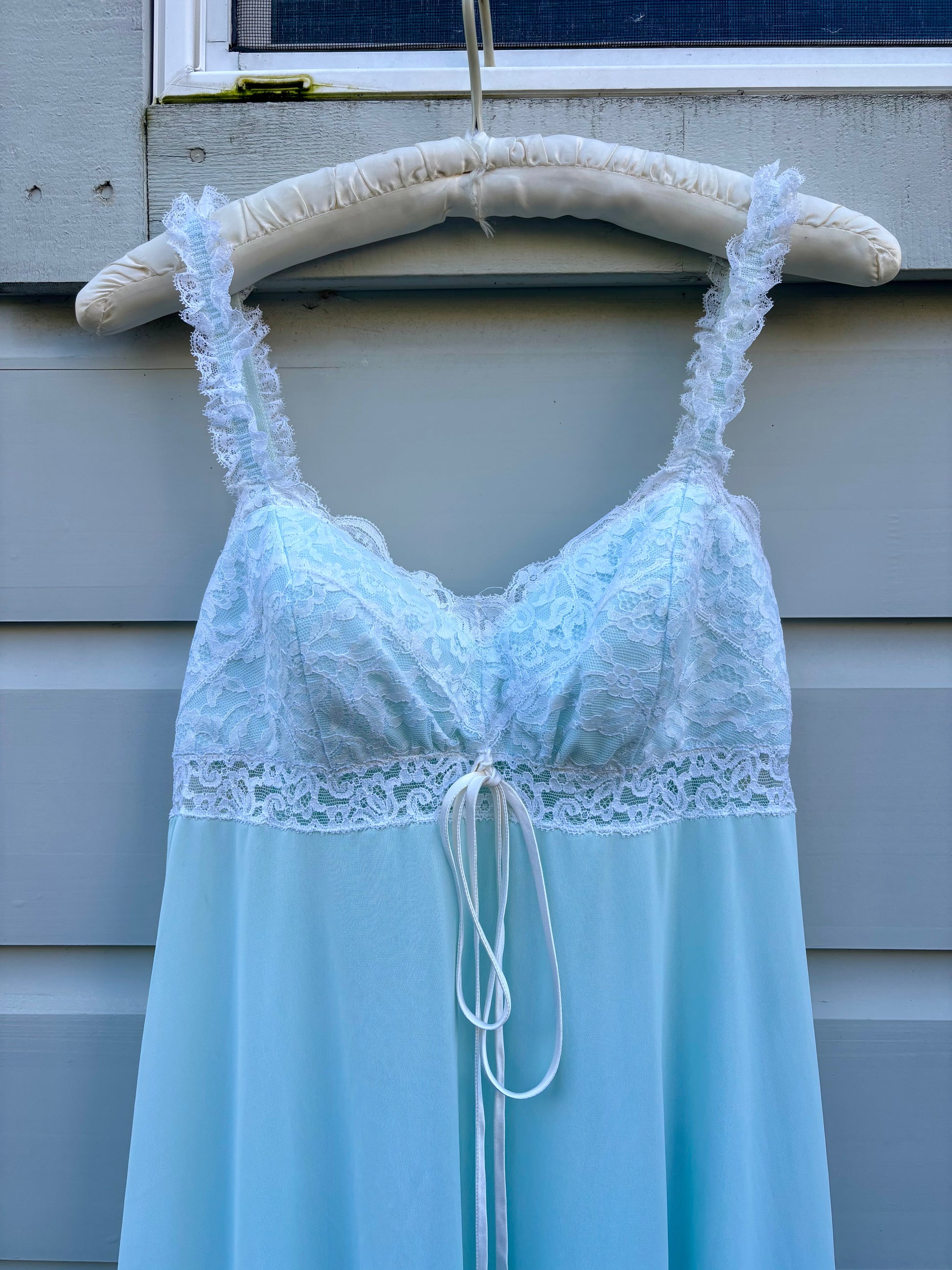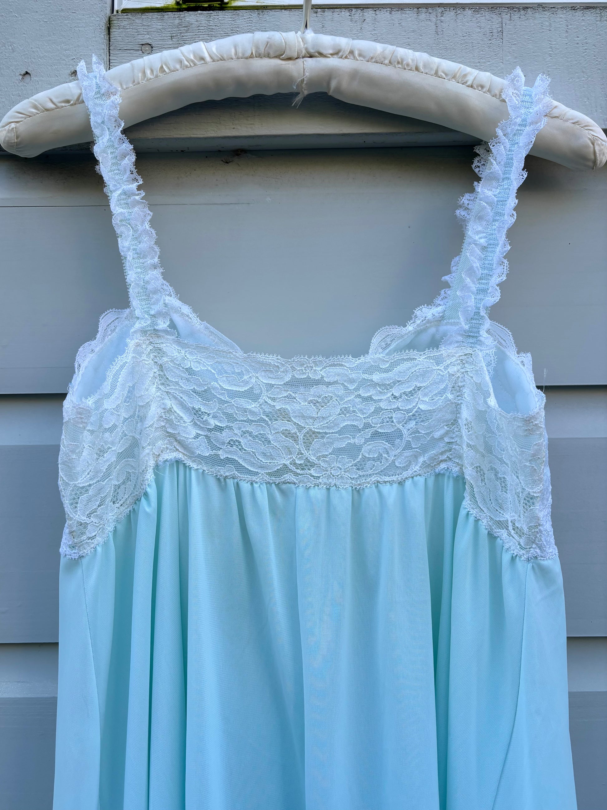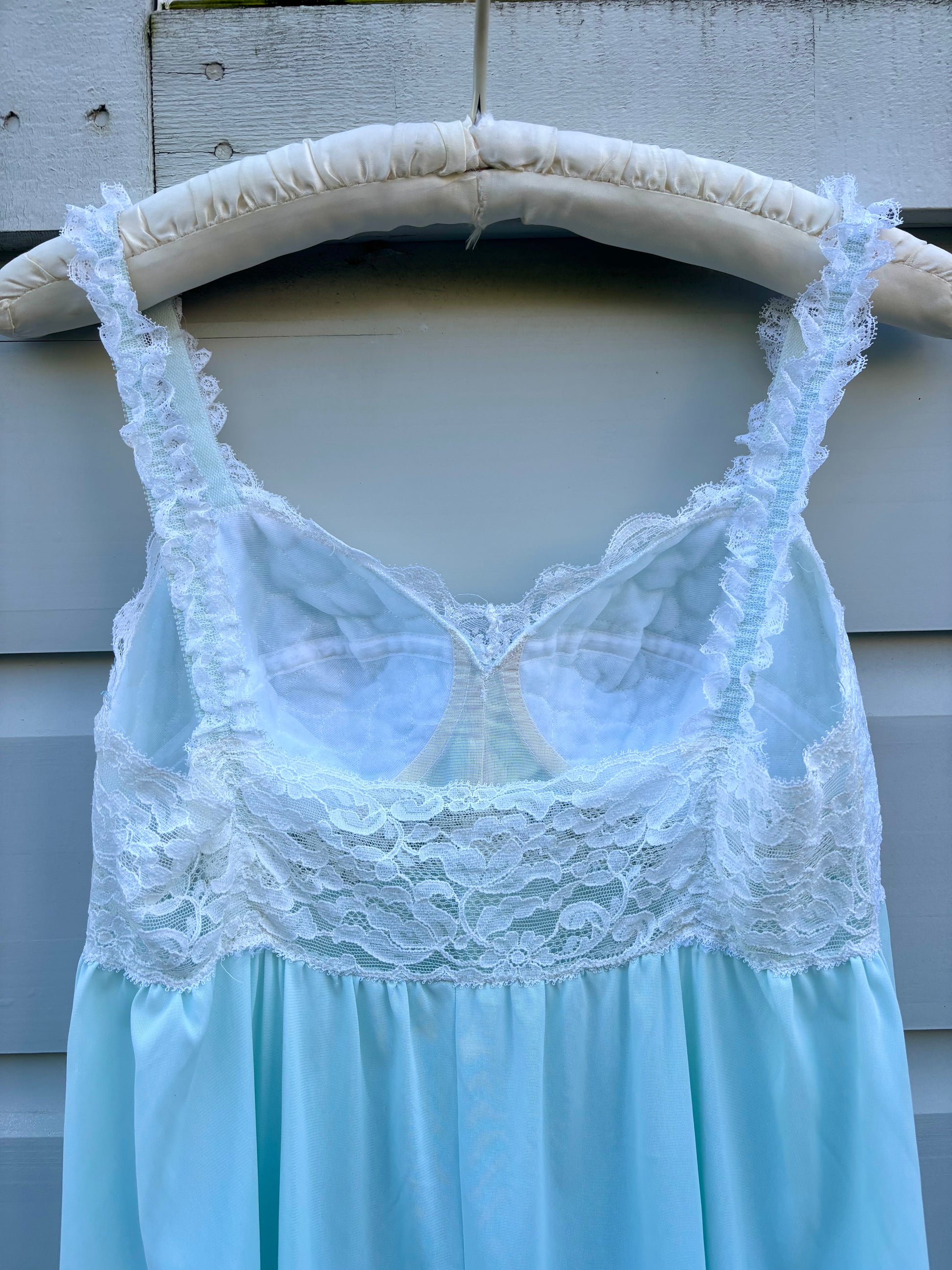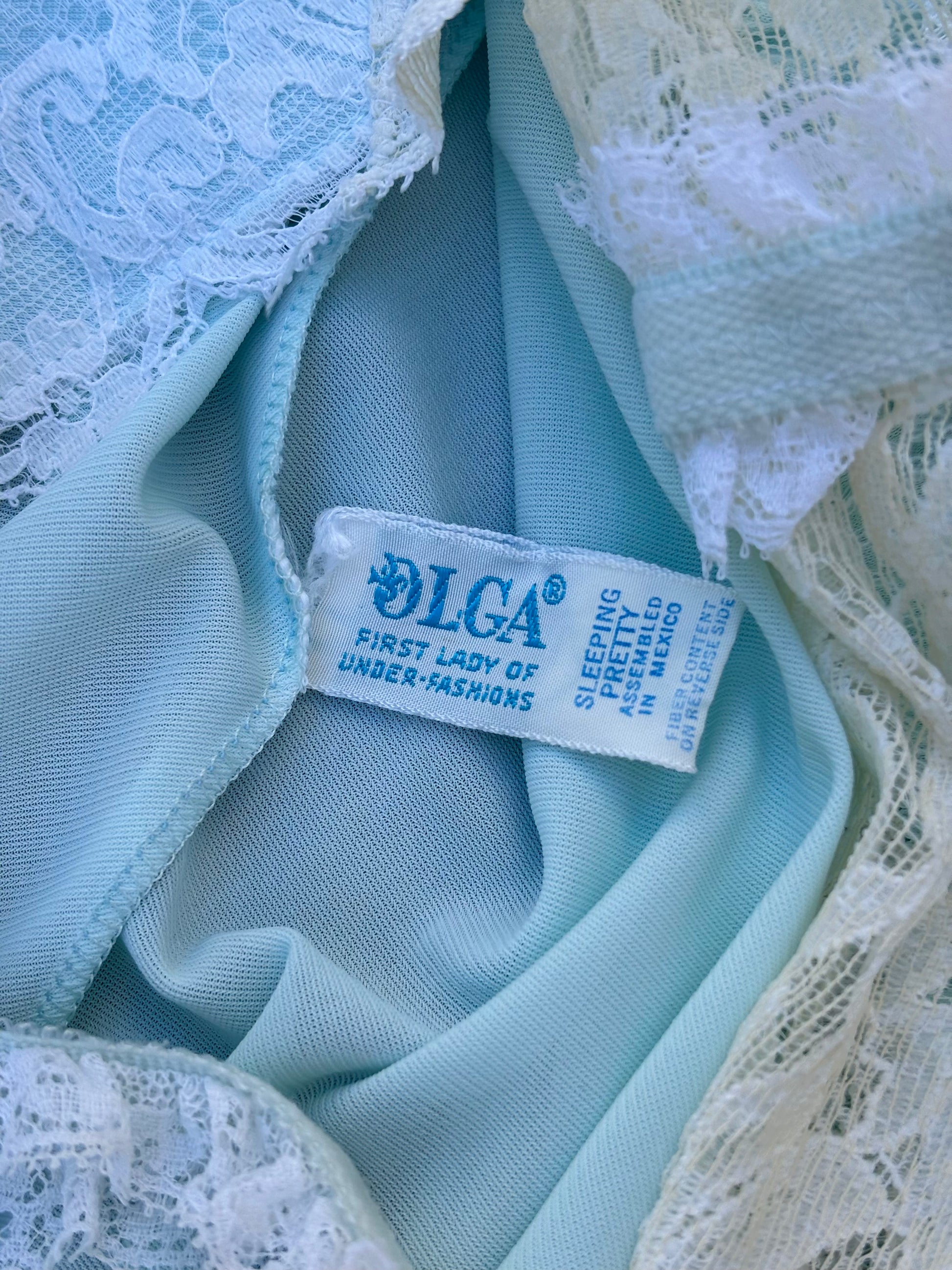60s vintage light teal lace nightgown by Olga Sleeping Pretty. Features interior padding, ruffled lace straps, and slight low-high hemline.