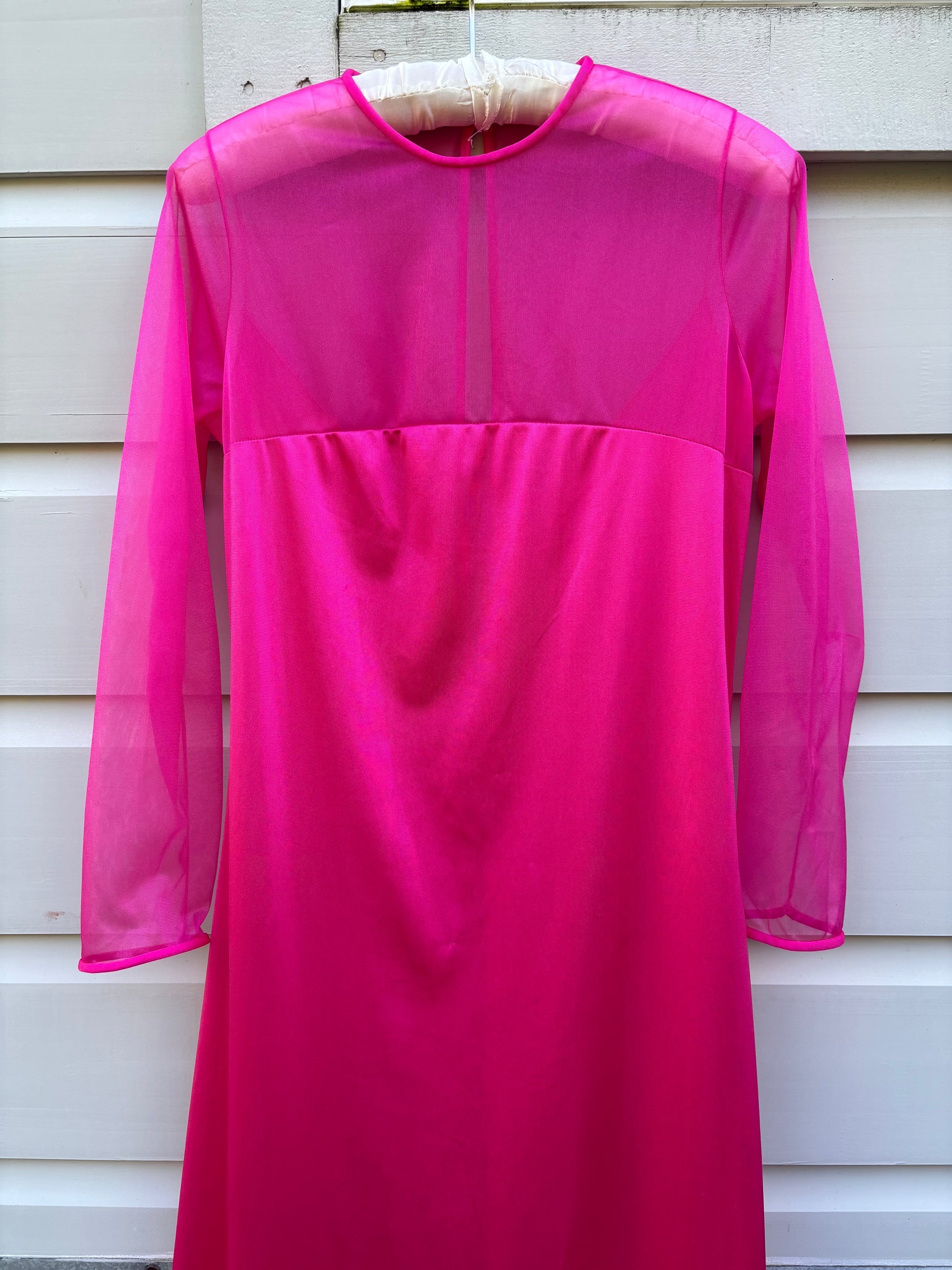 70s hot pink nylon robe/dress by Frederick's of Hollywood. Features a glossy texture on the bodice with mesh-like texture on upper chest and sleeves. Has a two-button closure in the back.