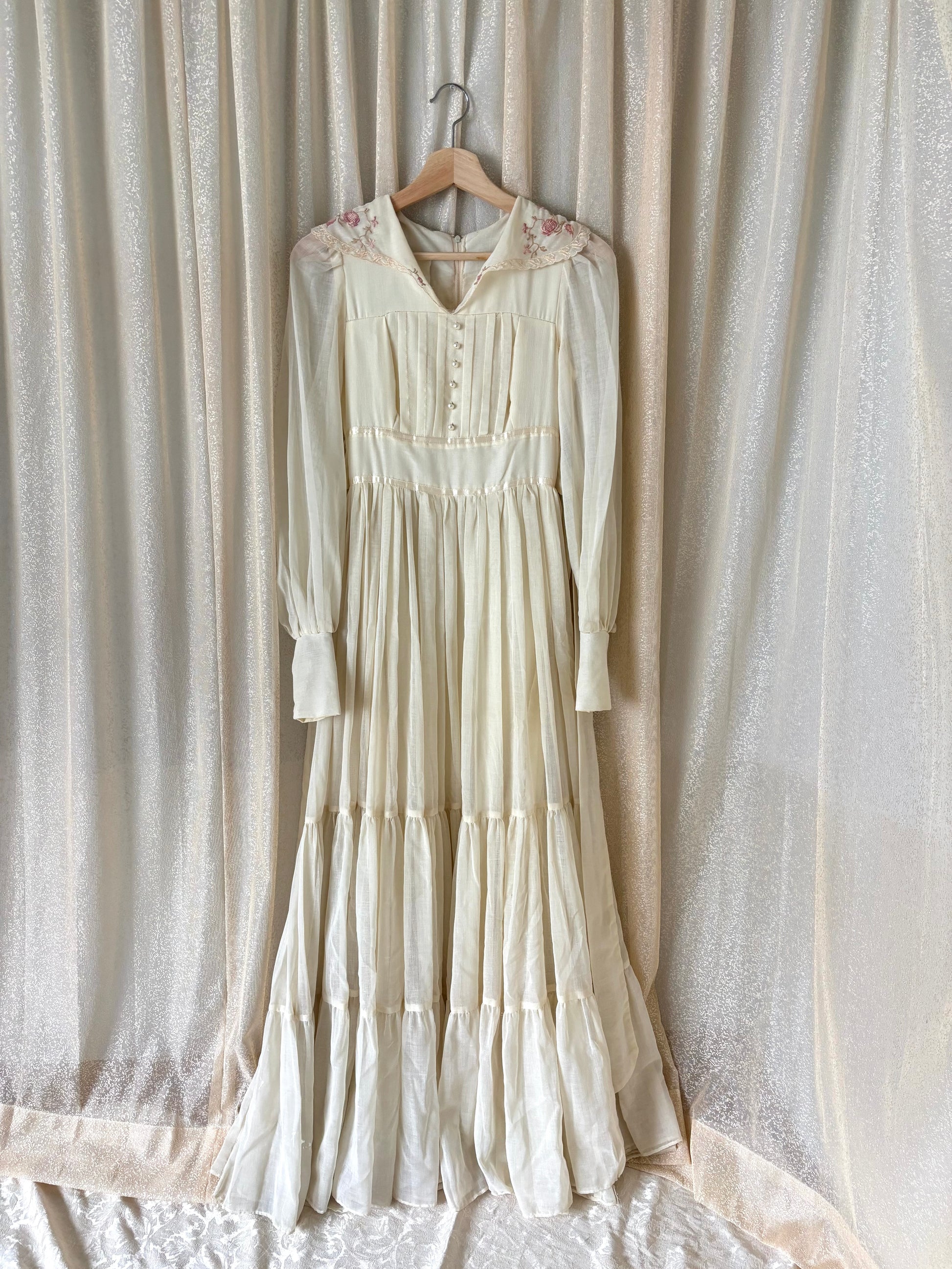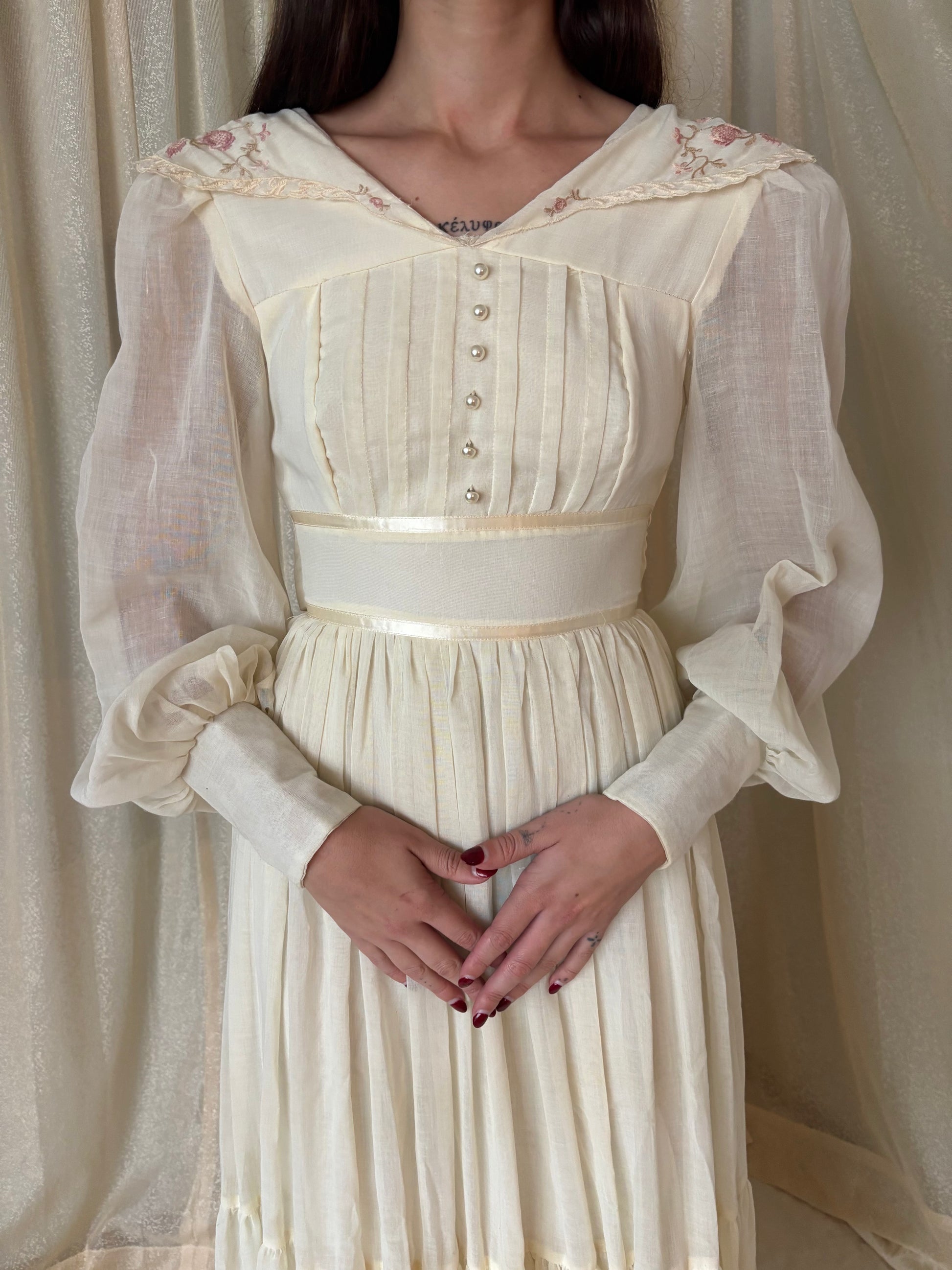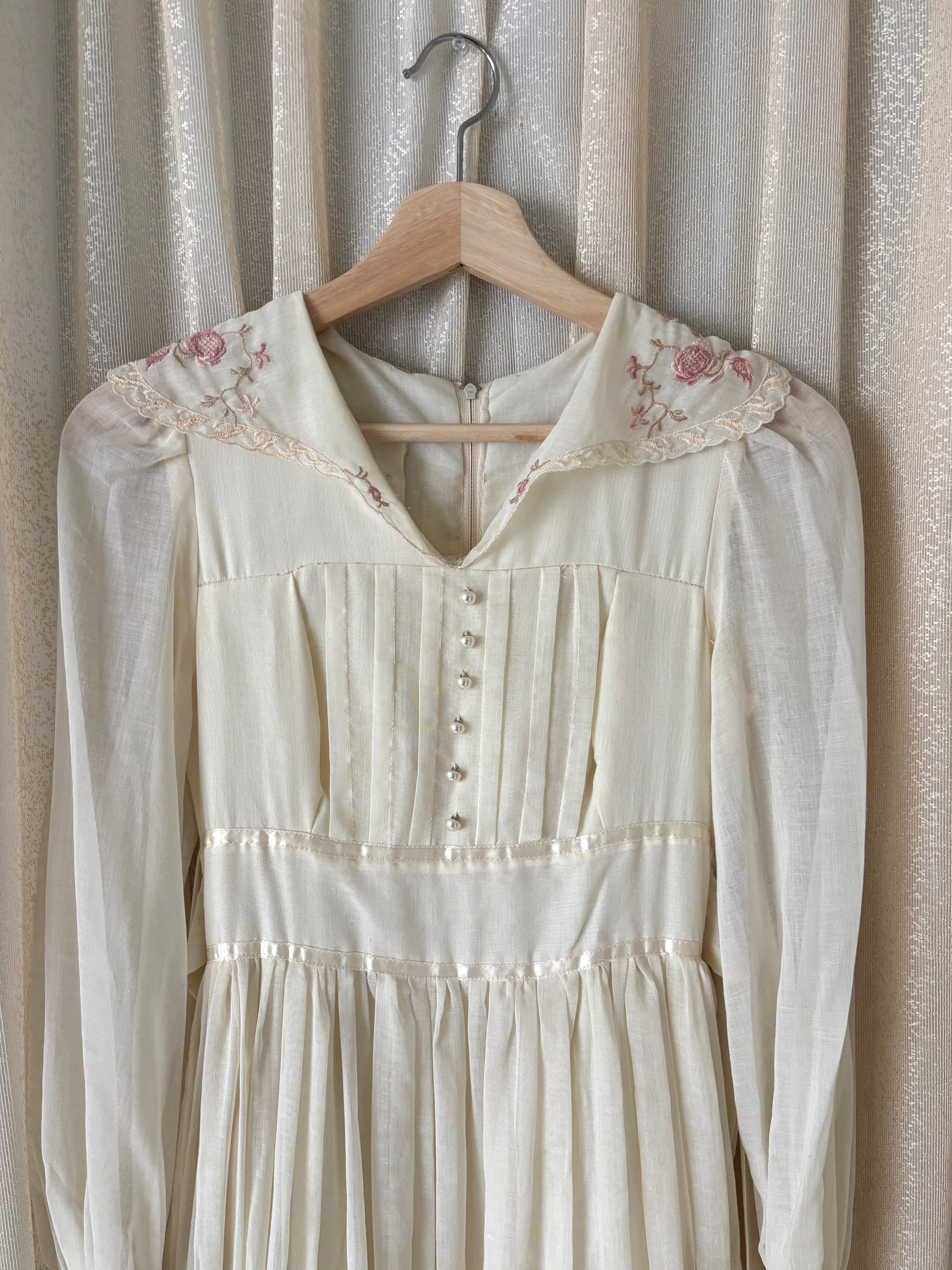 Beautiful 70s prairie dress by Gunne Sax. Features floral embroidered sailor collar, pearl buttons down front and wrists, and zipper down the back.