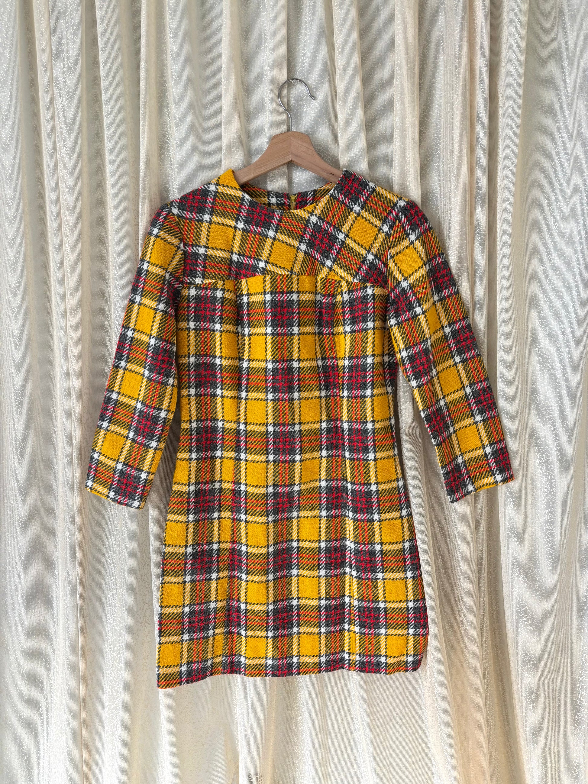 Handmade 70s wool shift dress with gray, white, red, & white plaid design. Features a smooth inner lining. Zips up the back.