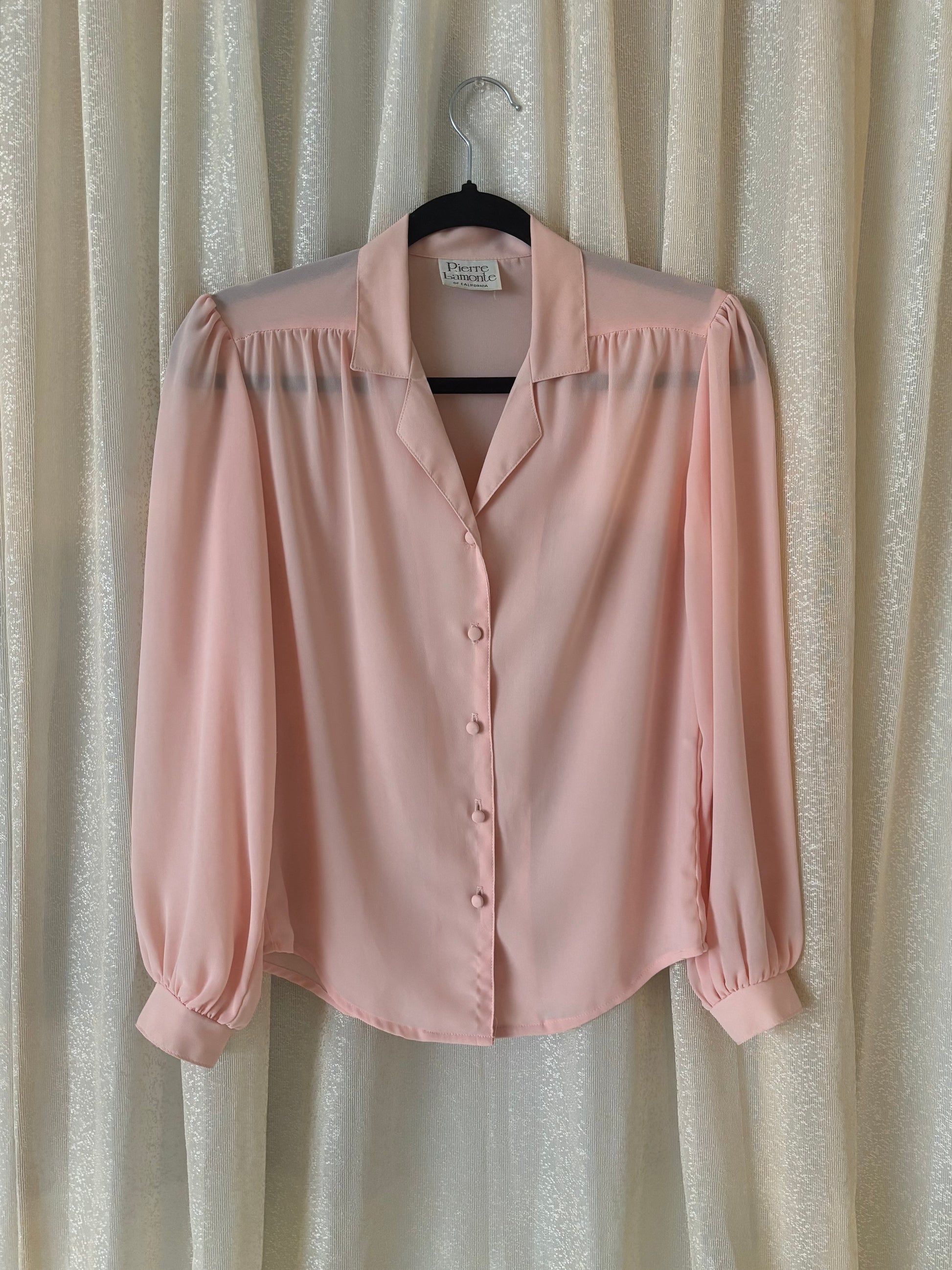 80s Pierre Lamonte pale pink button-up blouse. Sheer flowy material.