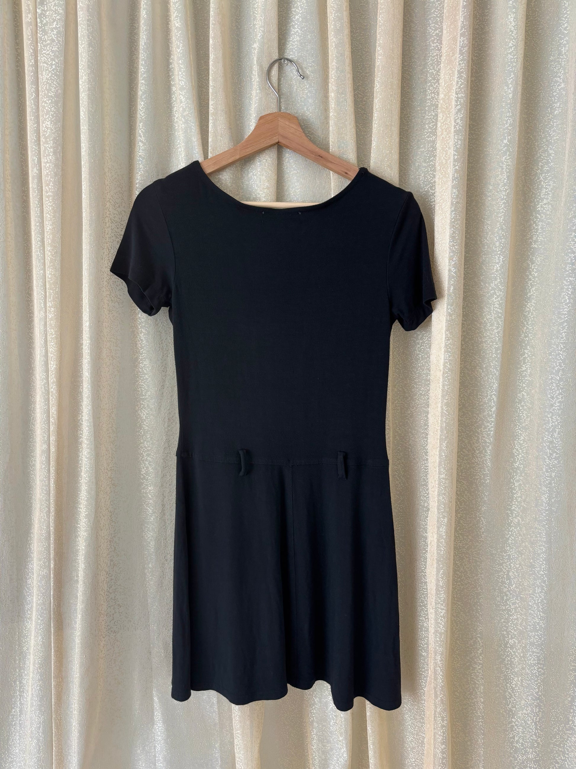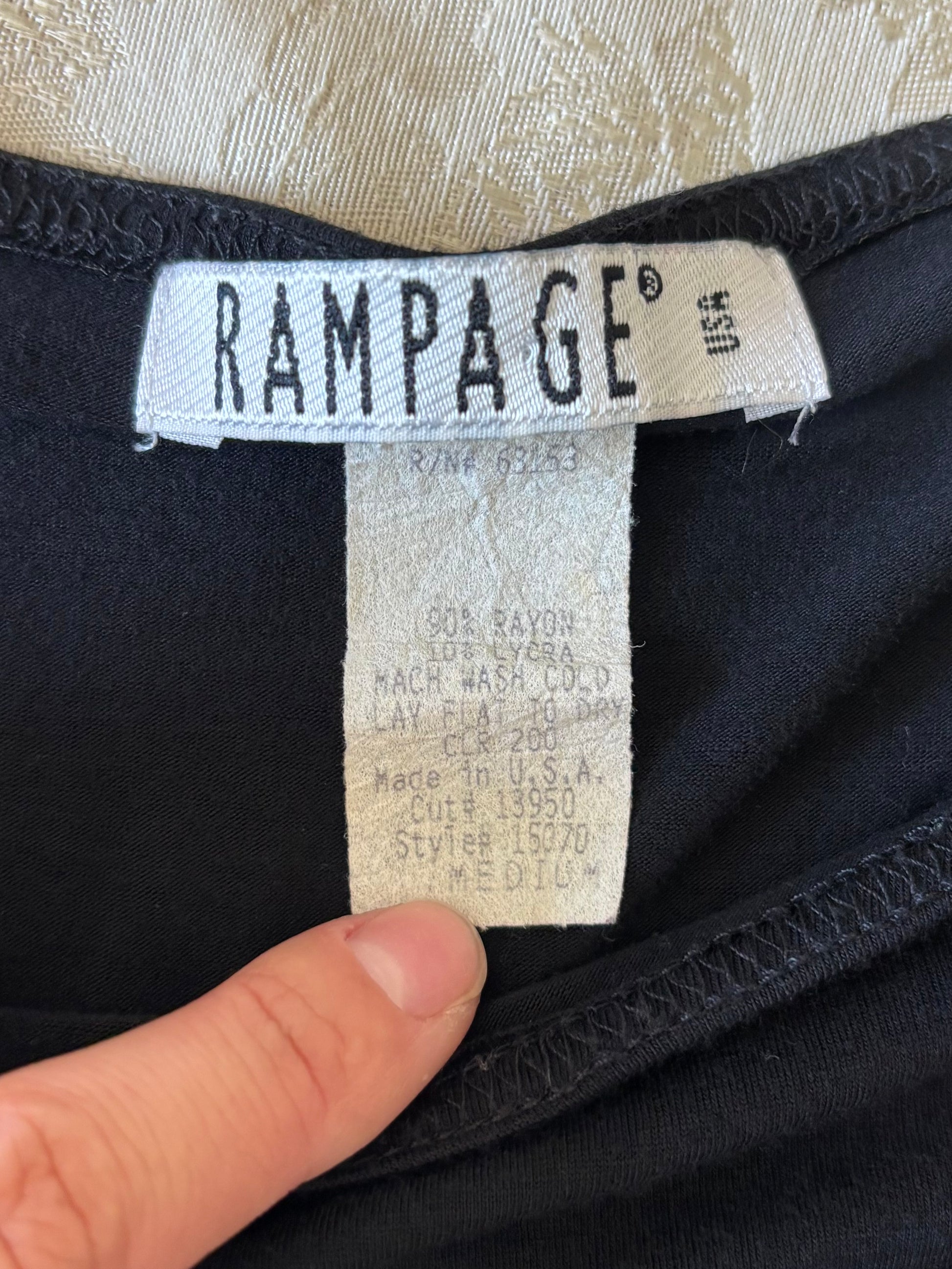 Classic 90s vintage black mini dress by Rampage. Features belt loops and scoop neck. Rayon and lycra blend with soft and stretchy feel. Made in the U.S.A.