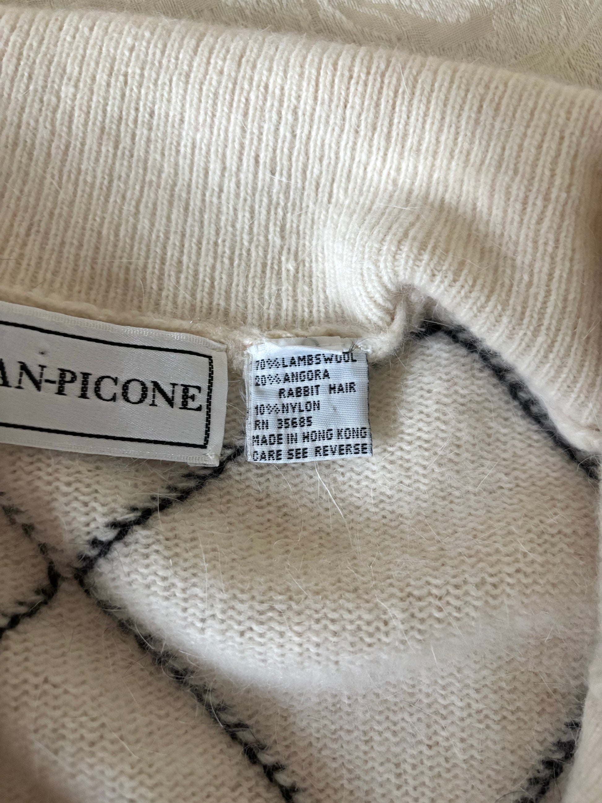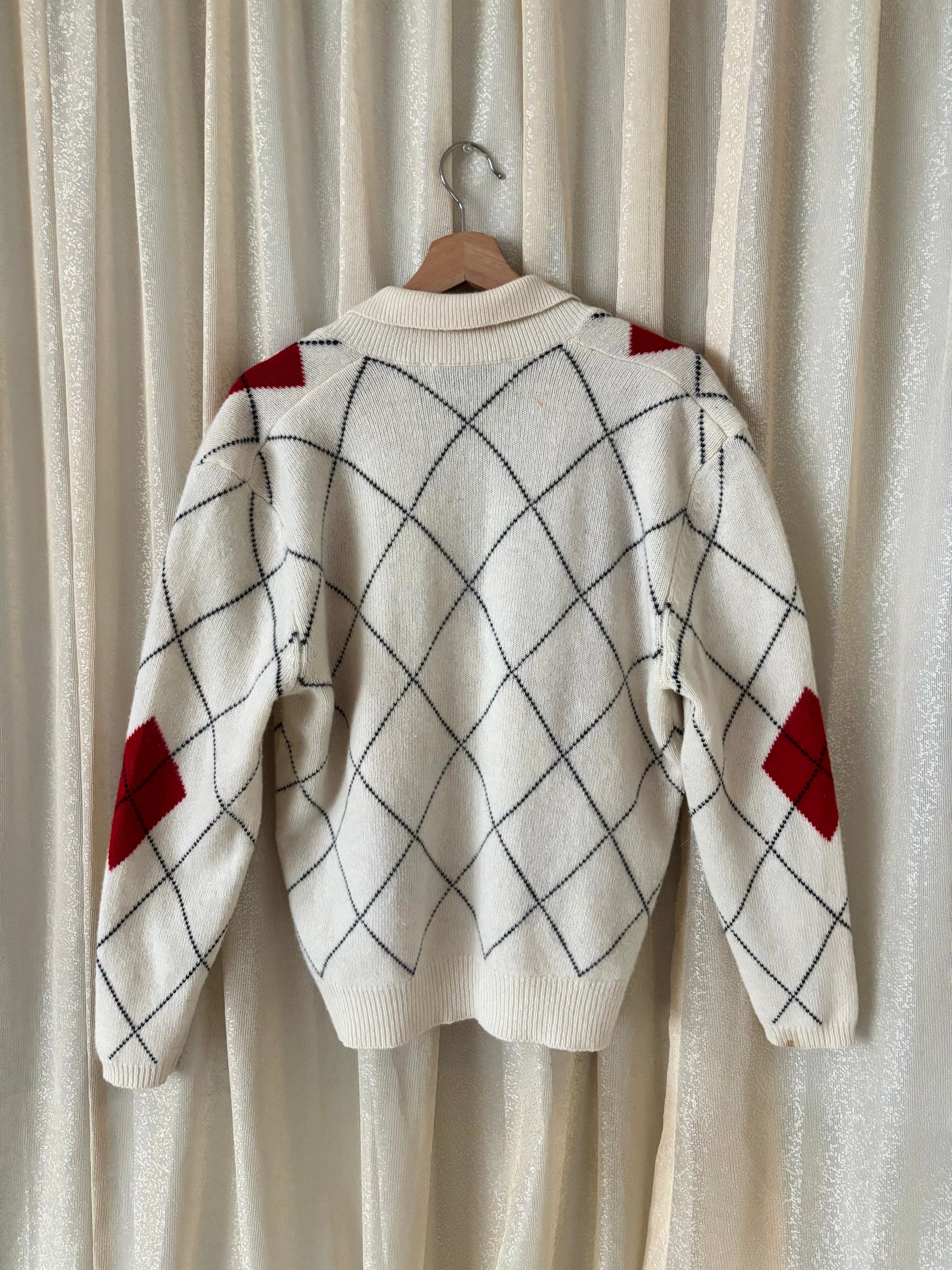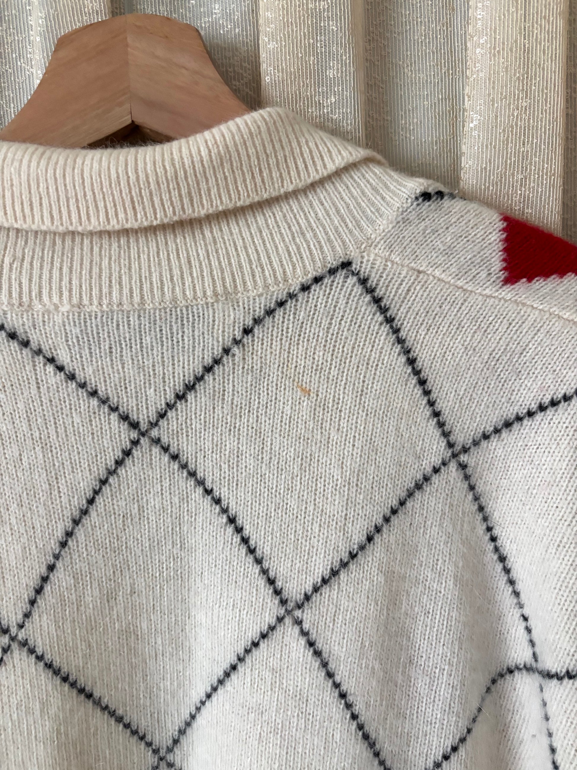 Soft 80s wool & angora blend collared cardigan by Evan Picone. Features white, black, & red argyle design with metallic buttons.