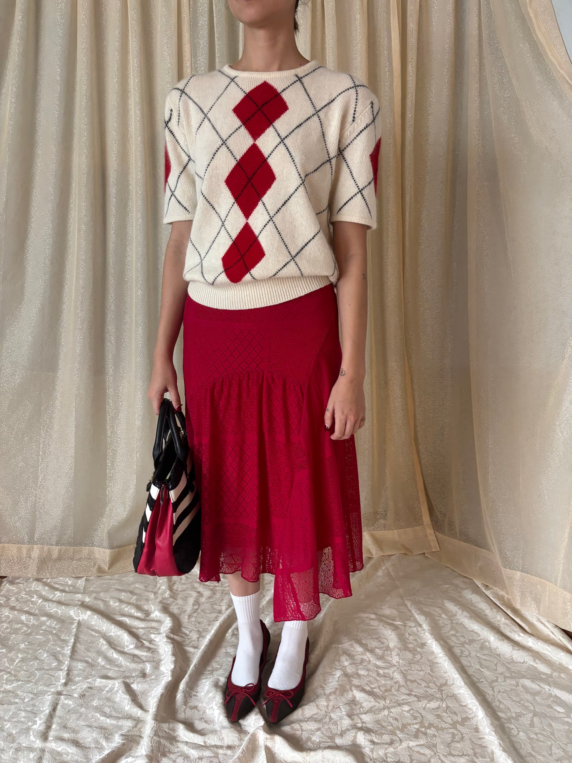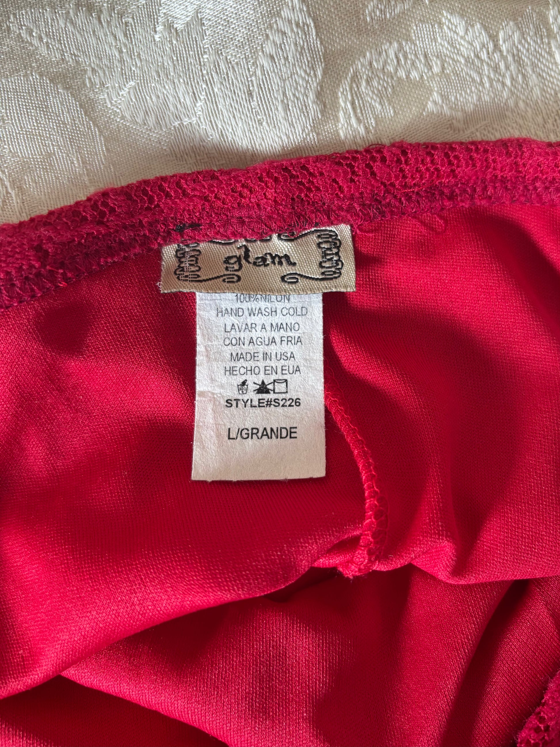 Red asymmetrical midi skirt with lace patchwork overlay by glam. Flowy A-line shape.