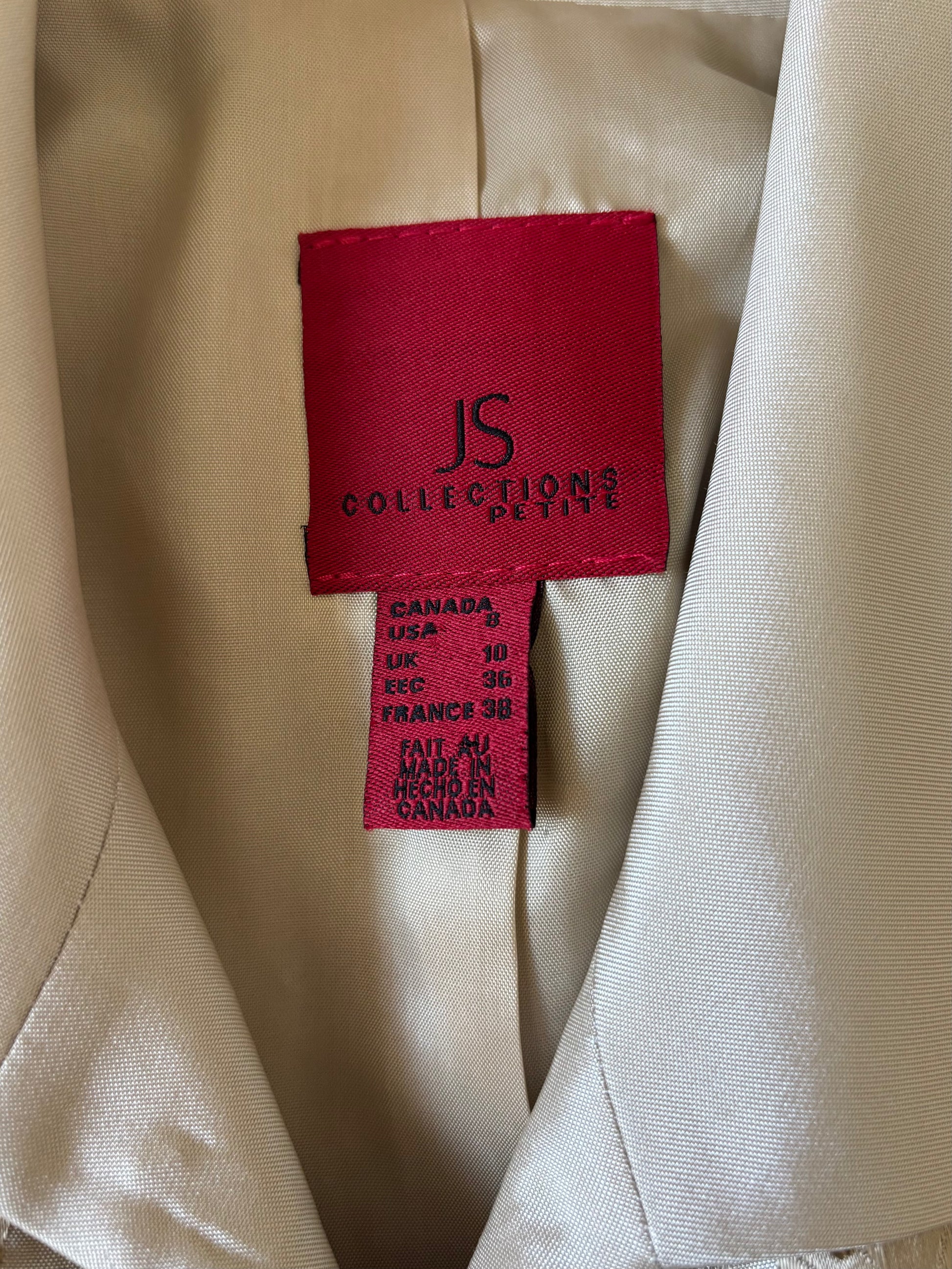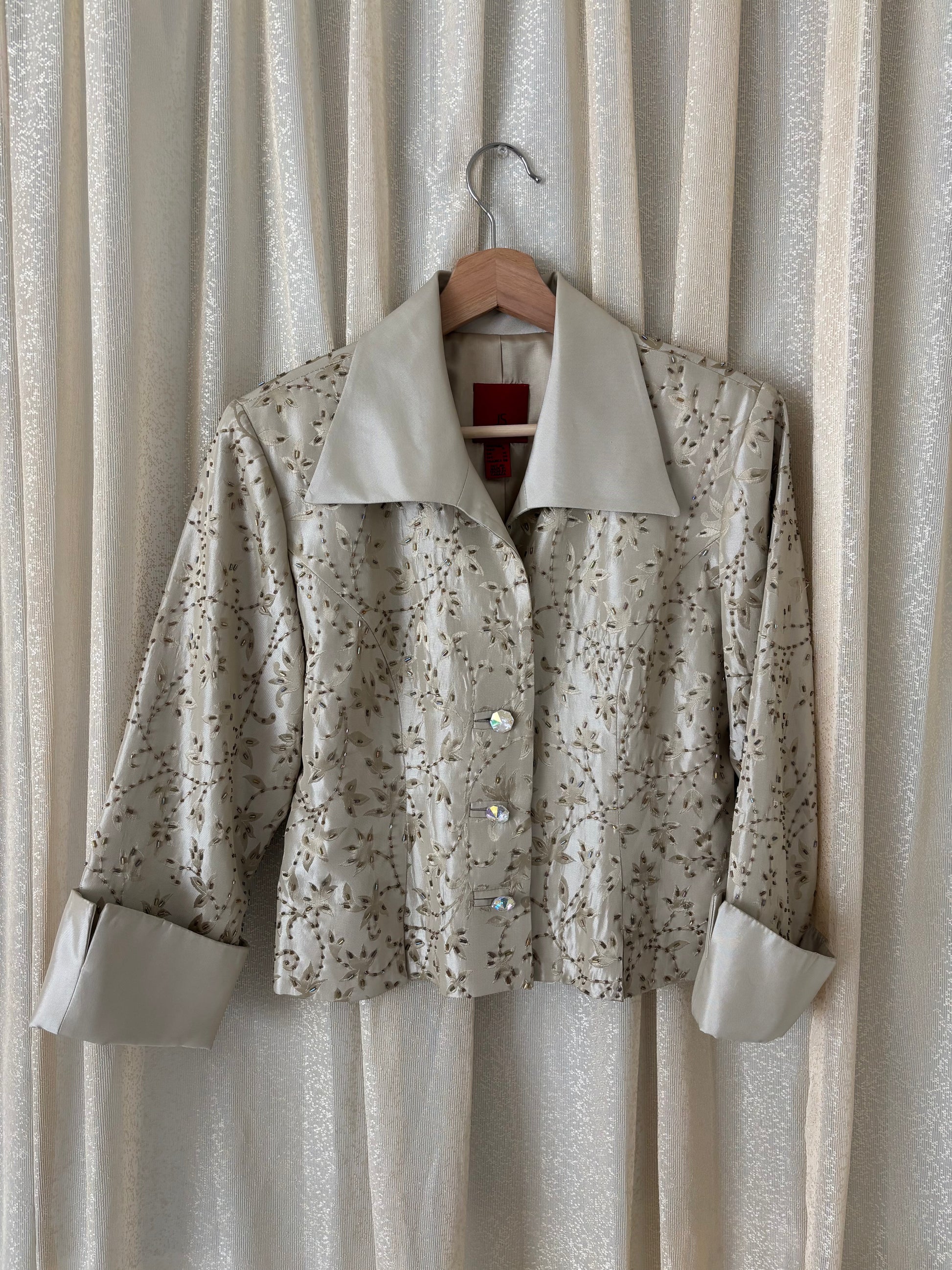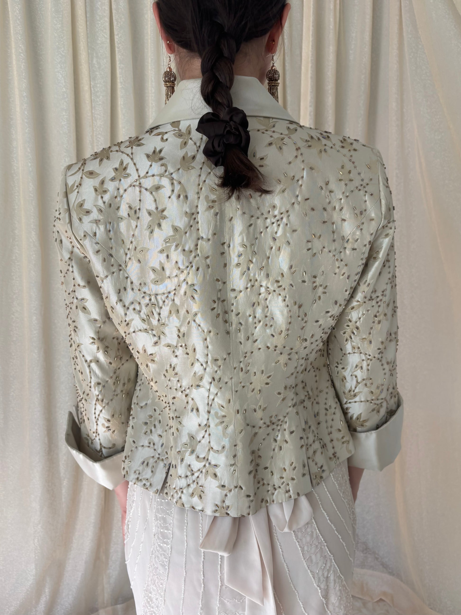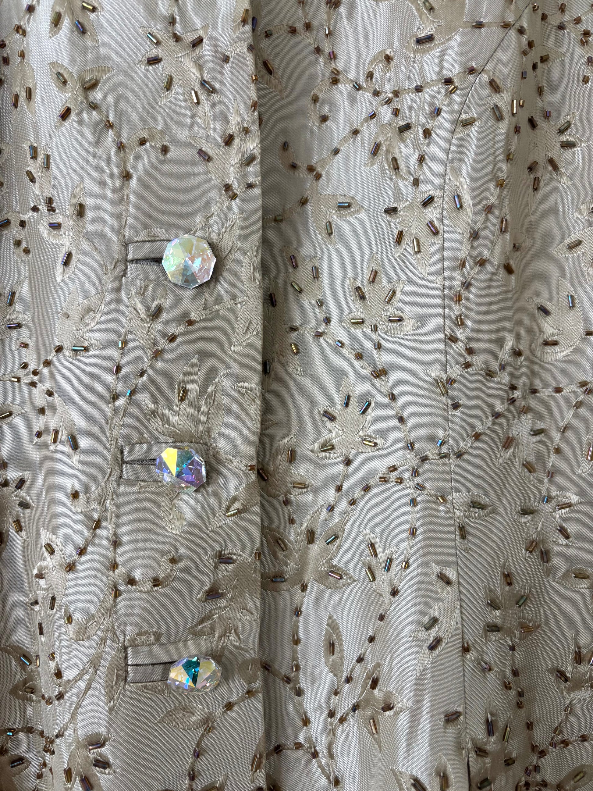 Metallic ivory bead embroidered jacket from JS Collections. 100% acetate with satin effect.