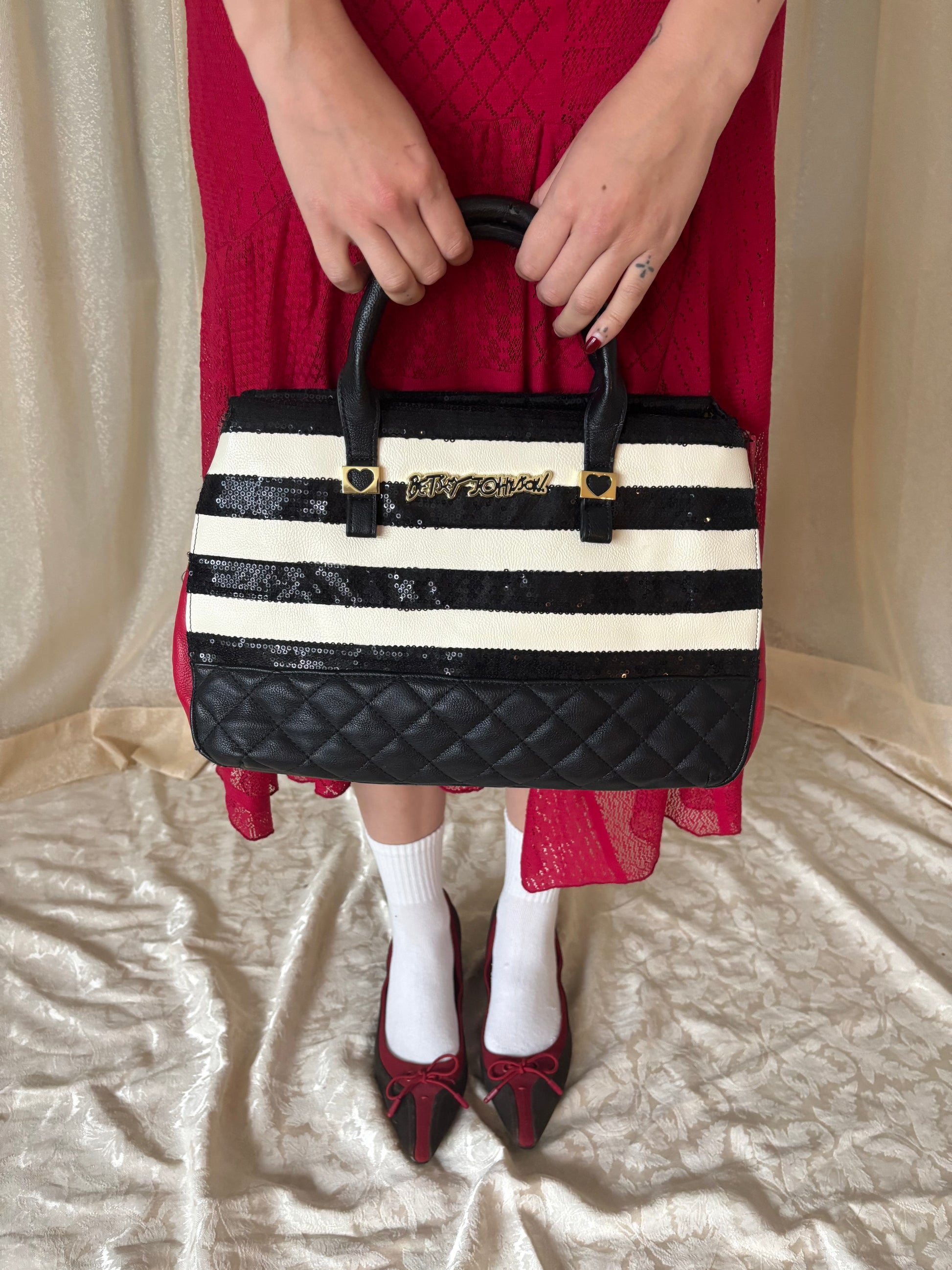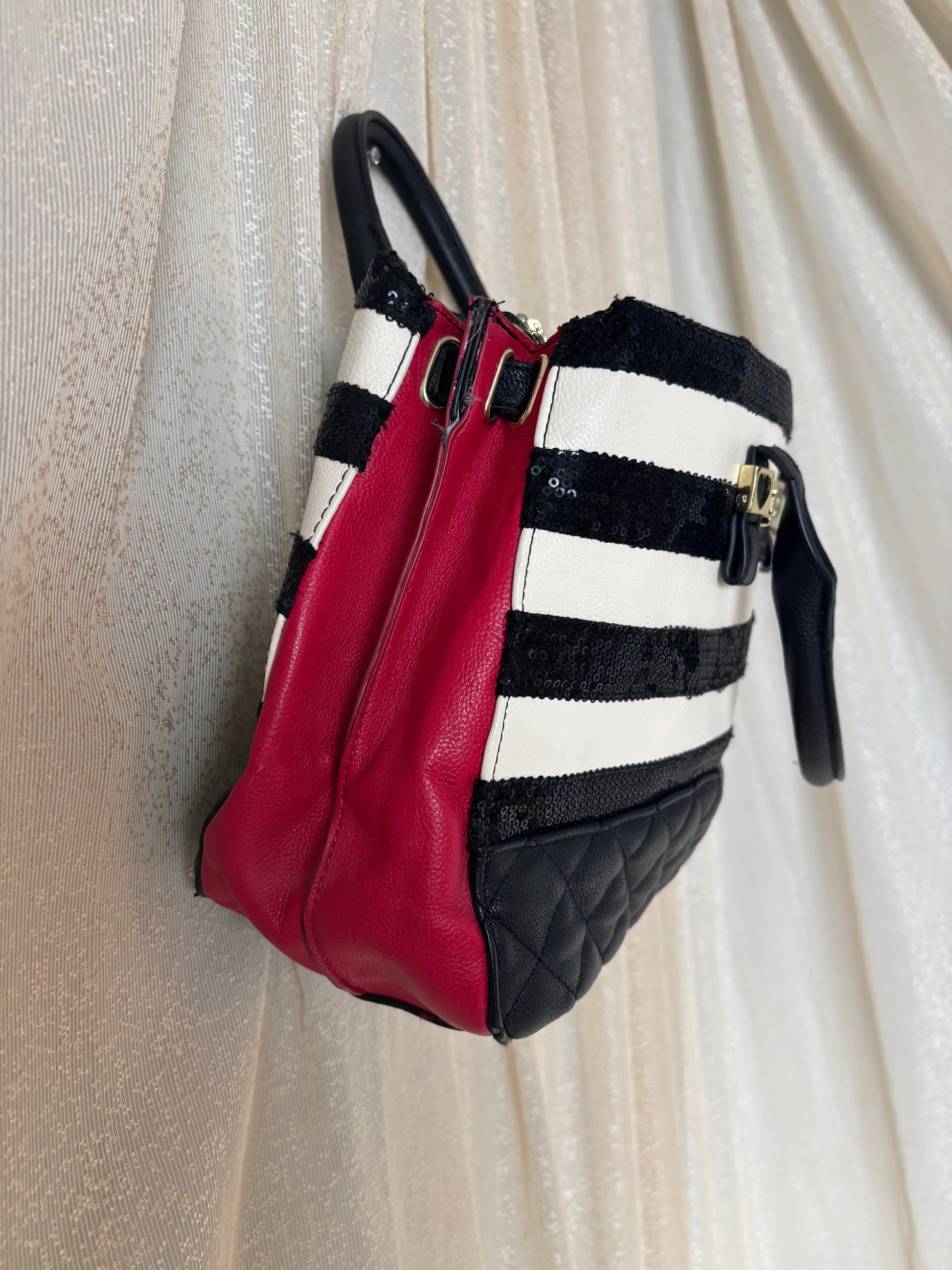 00s sequin leather satchel with quilted accents and red leather sides by Betsey Johnson. Features three interior pockets (one zippered) and one central zip compartment with silky floral interior lining.