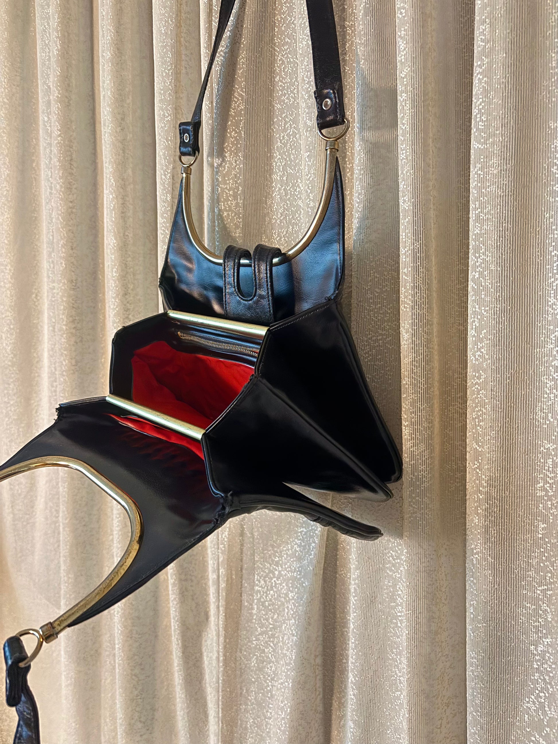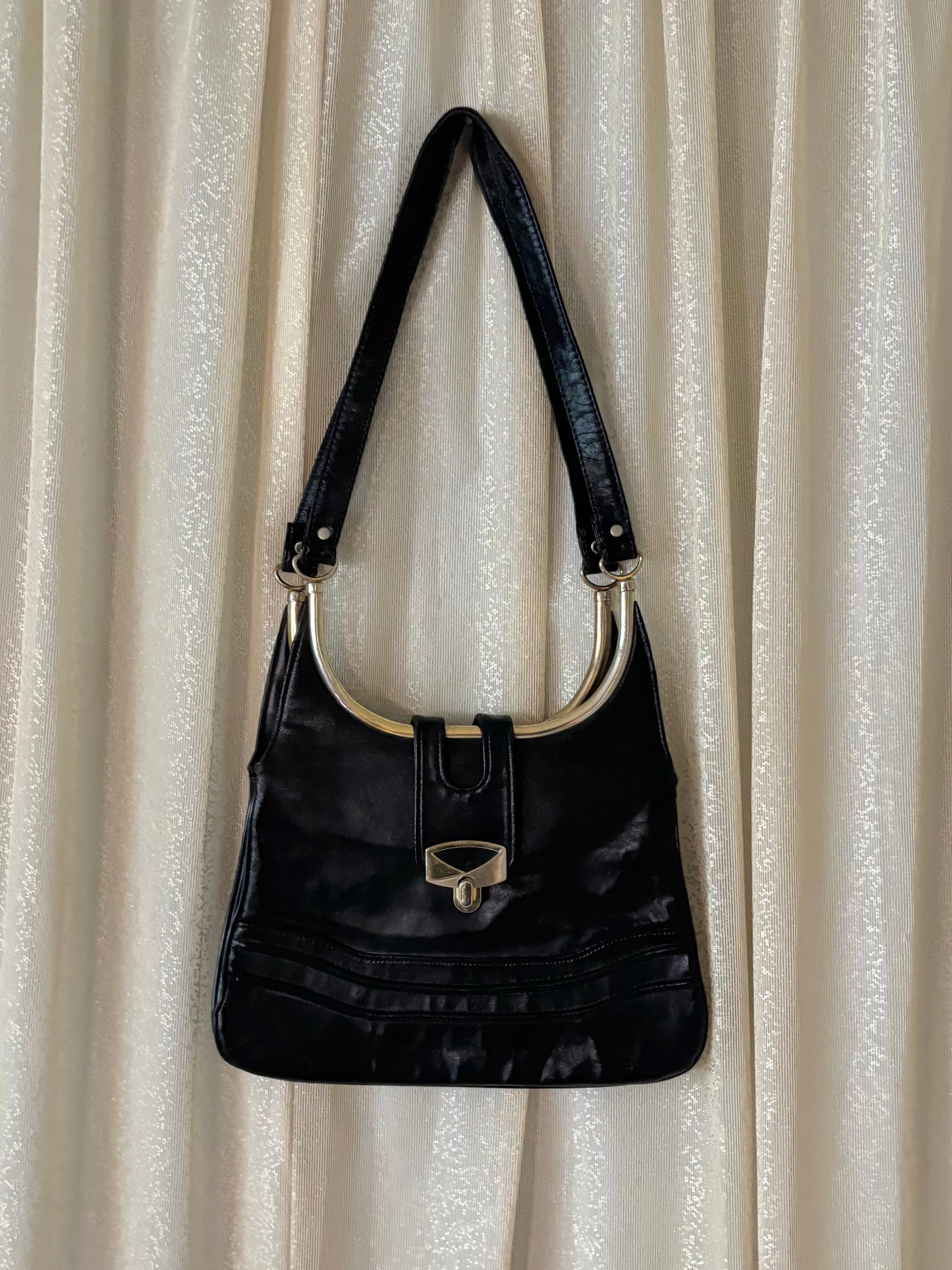 Vintage black leather structured purse featuring turnlock closure and an attached double-sided compact mirror. Comprised of three compartments with one clear zippered pocket.