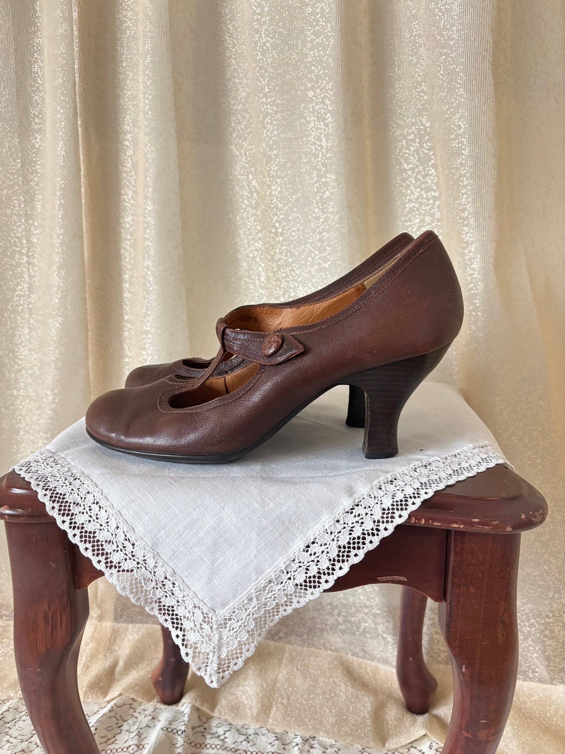 Brown leather t-strap Mary Jane heels by Sofft.