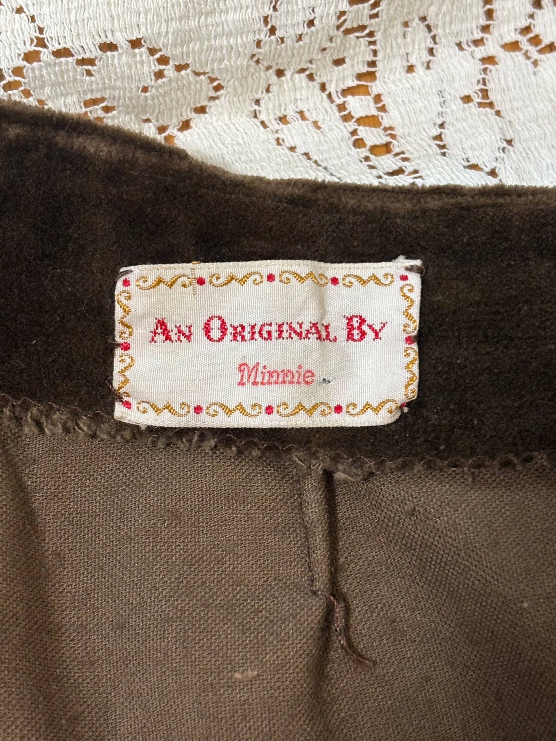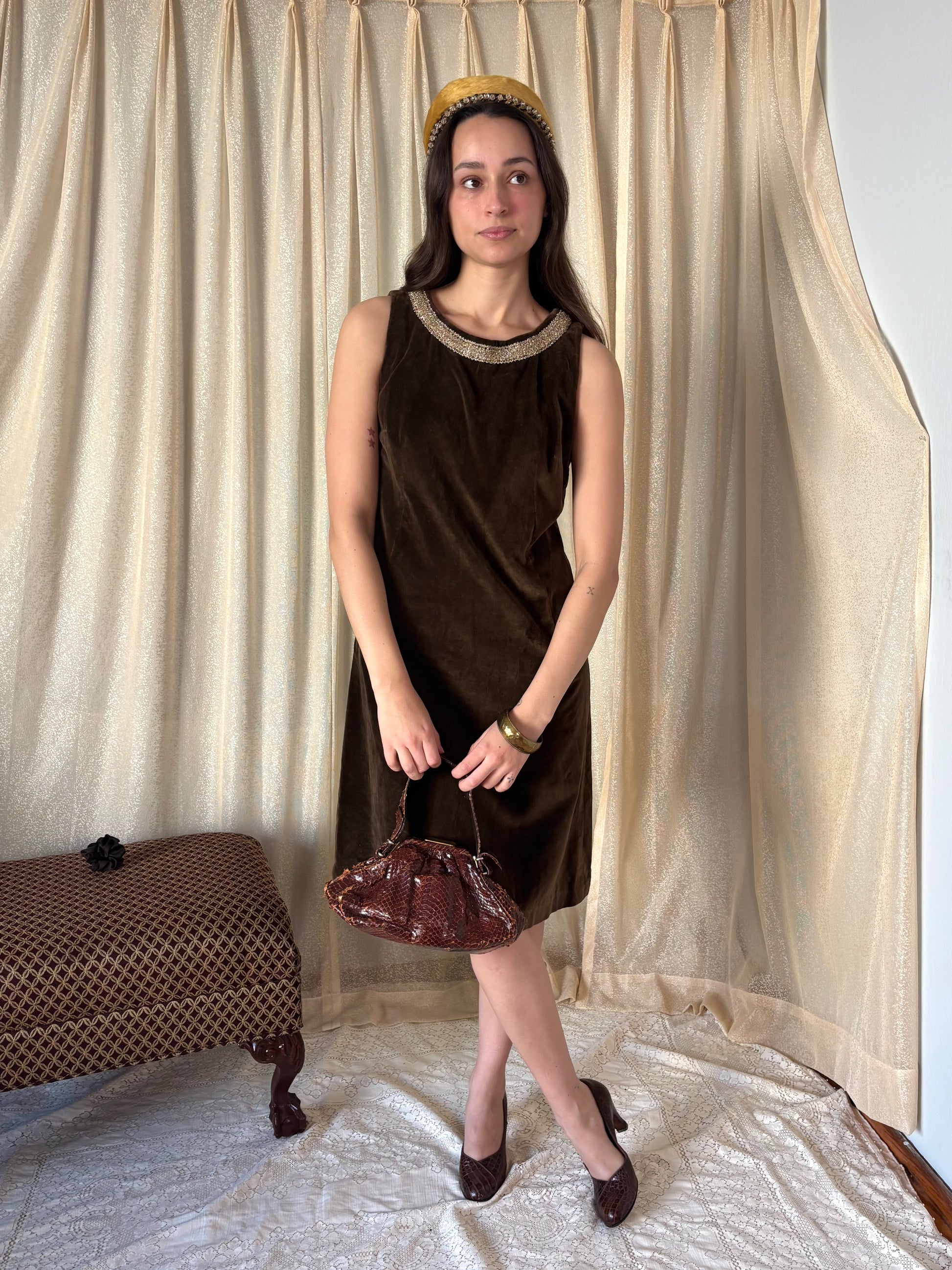 Vintage 60s brown velvet sleeveless shift dress with gold embroidered neckline. An original by Minnie. Zips and clasps at the back.