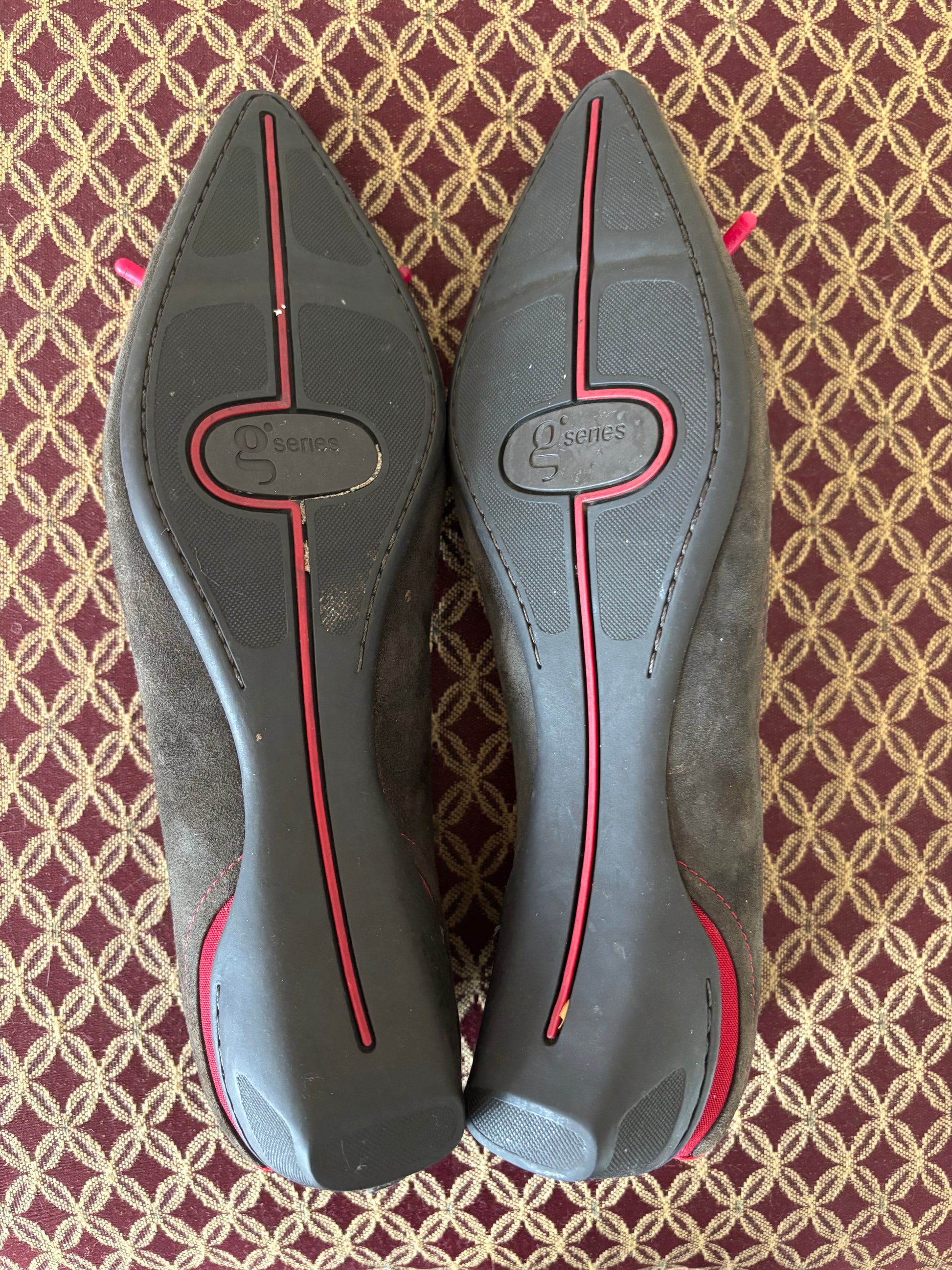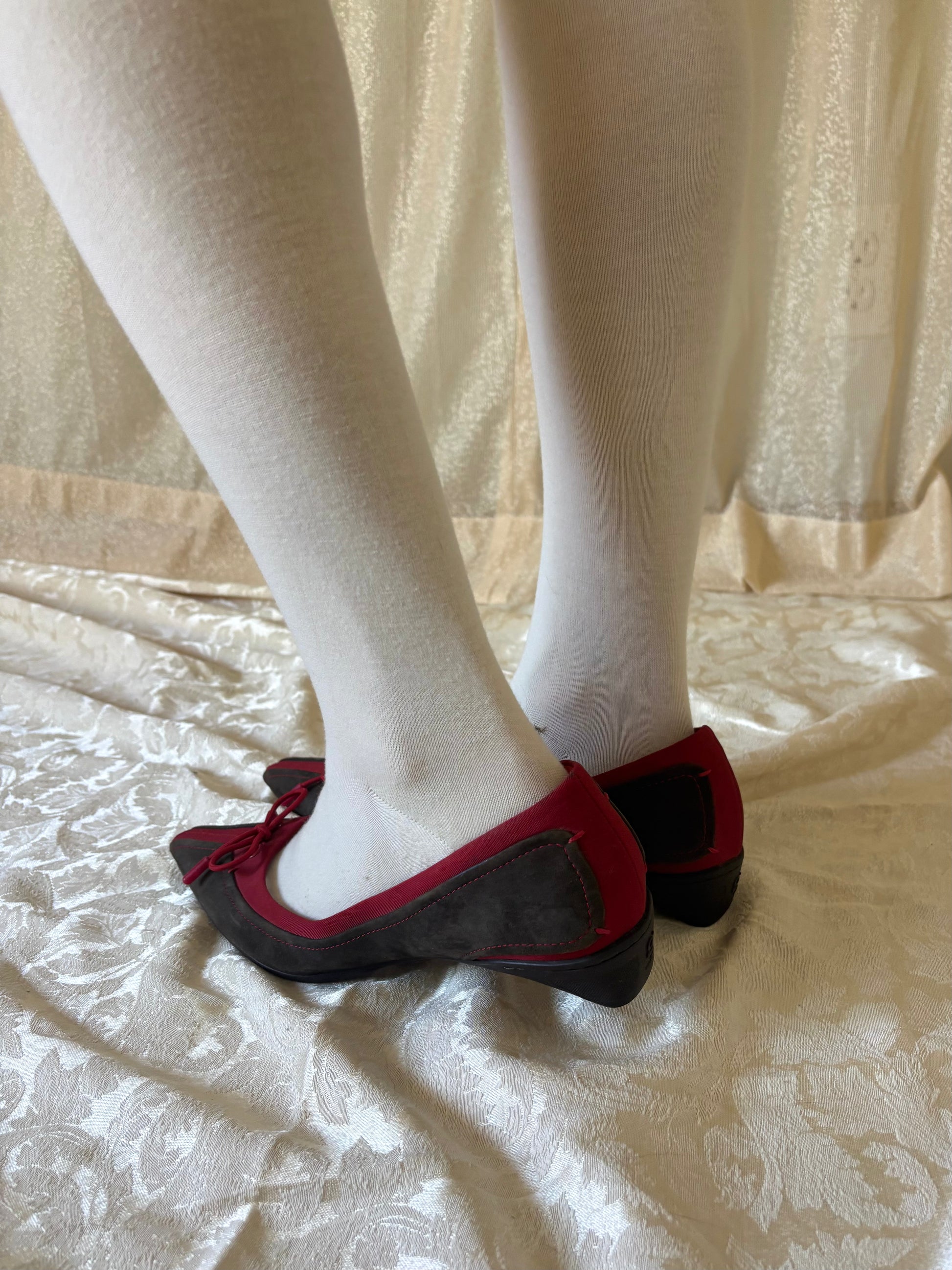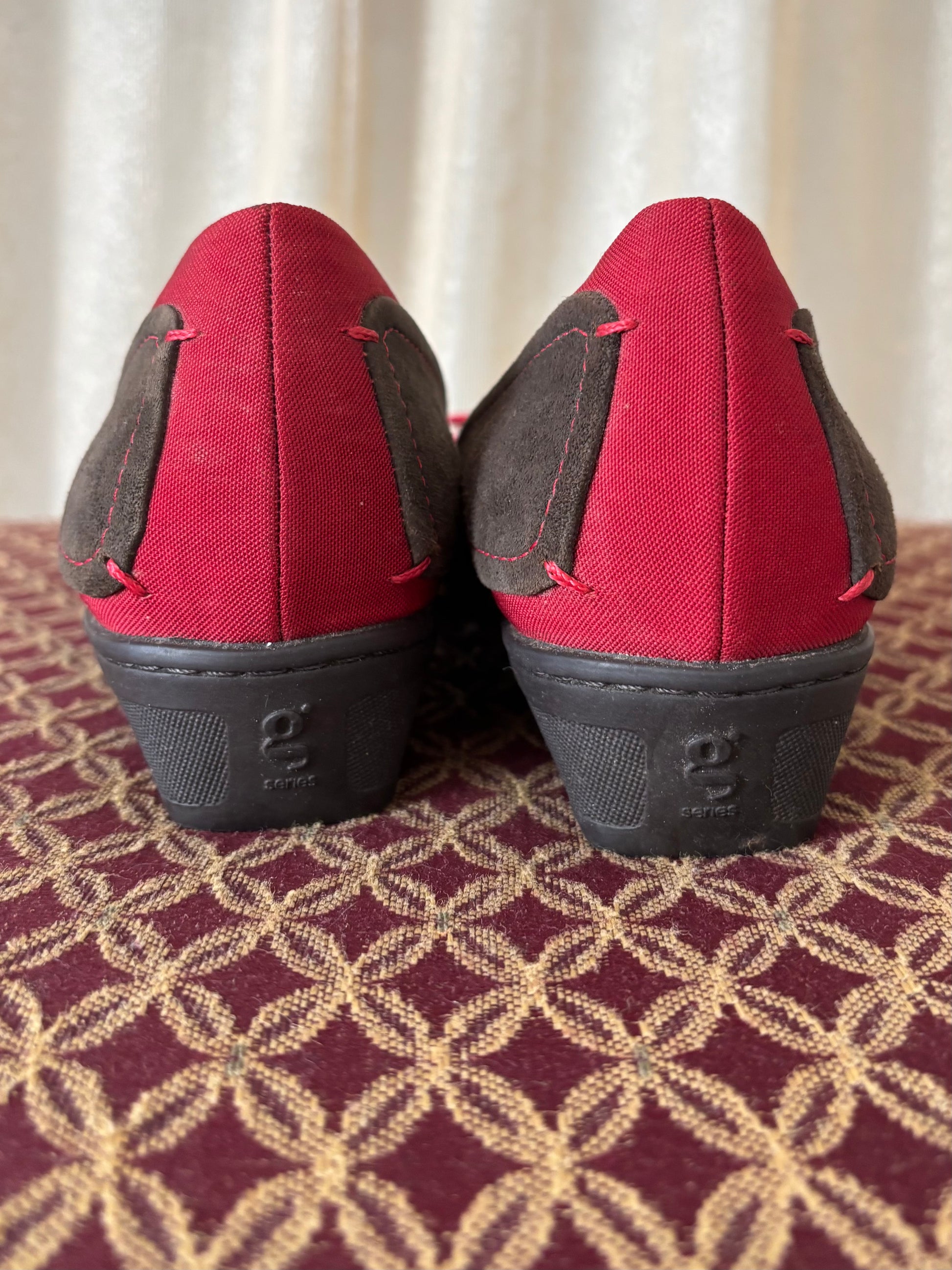 Rare canvas and suede kitten heel flats in red and grey from Cole Haan's 2004 G series collection. Features leather inner sole.