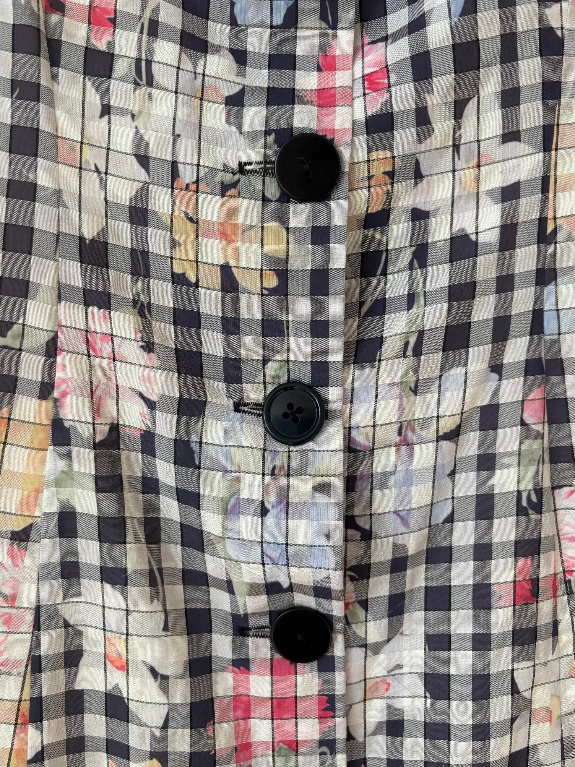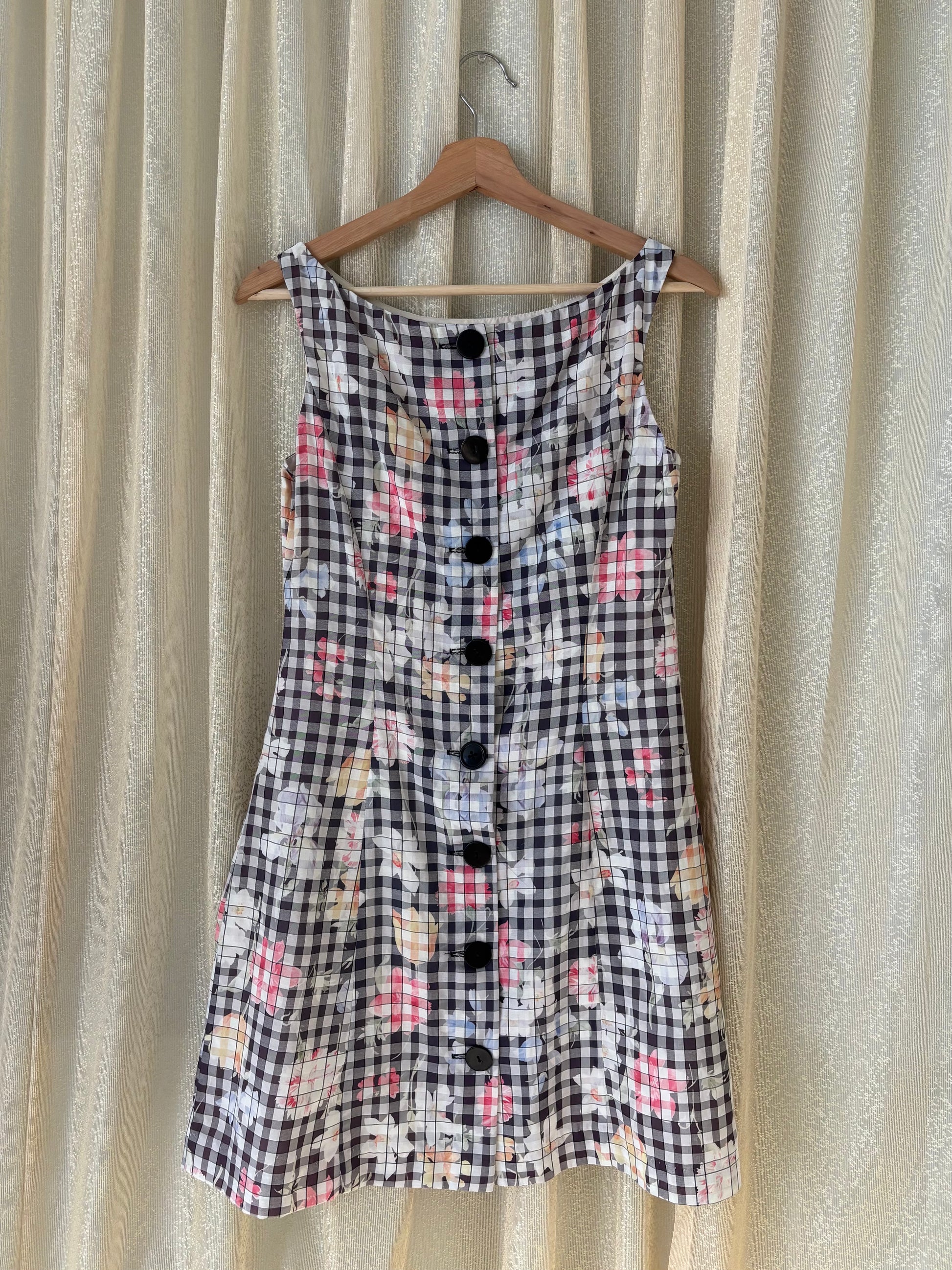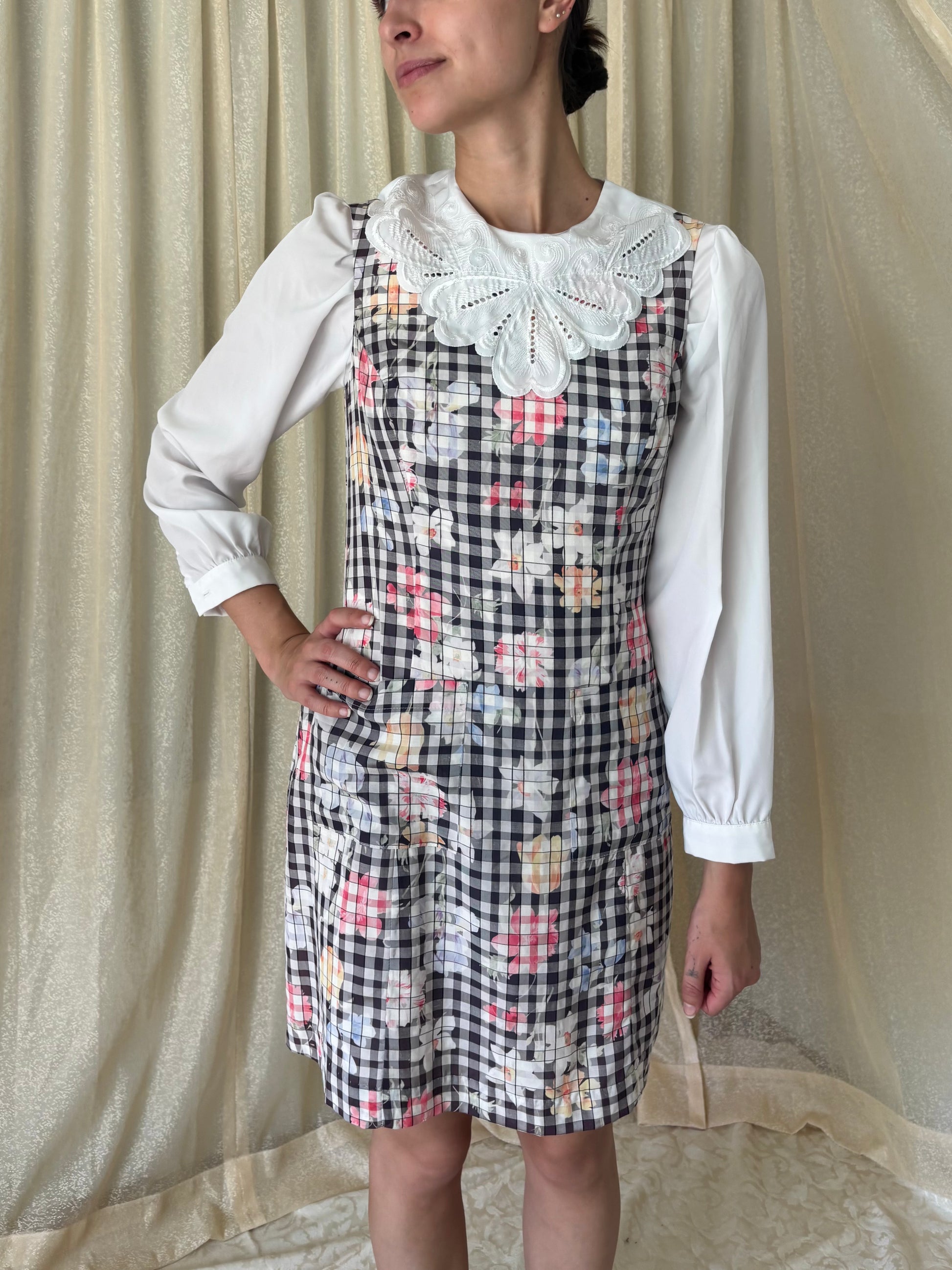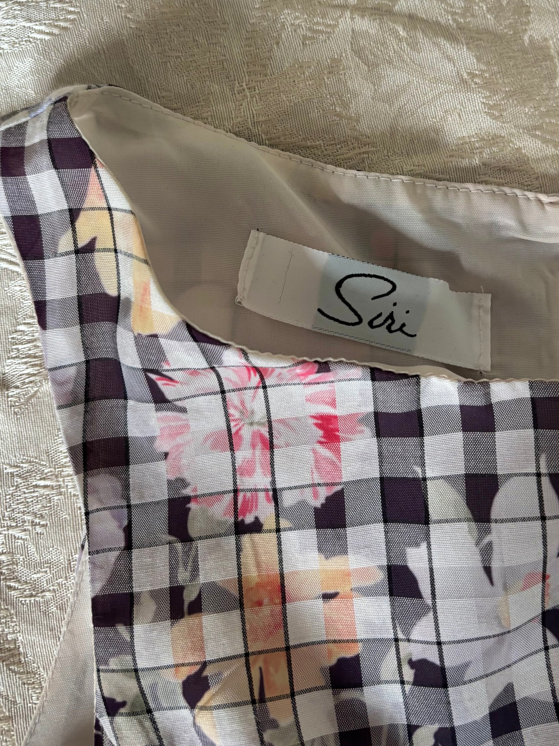 Darling checkered dress with floral graphic design by Siri. Features 2 front pockets and light, airy material. Blouse not included.