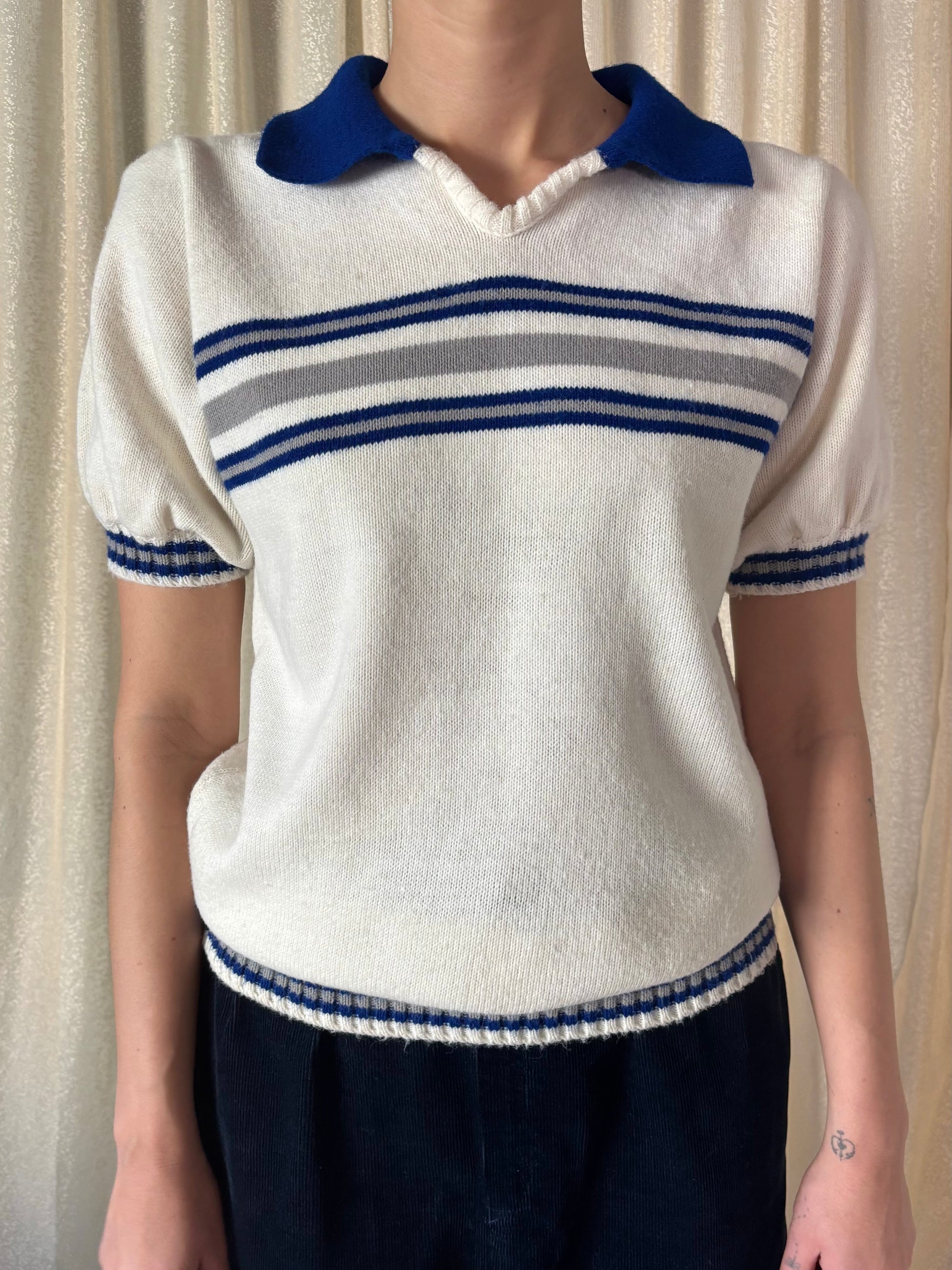 Vintage 60s acrylic cheerleader polo sweater by Cheerleader Supply Co. Inc. Features iconic puff sleeves and varsity stripes in navy, white, and grey.