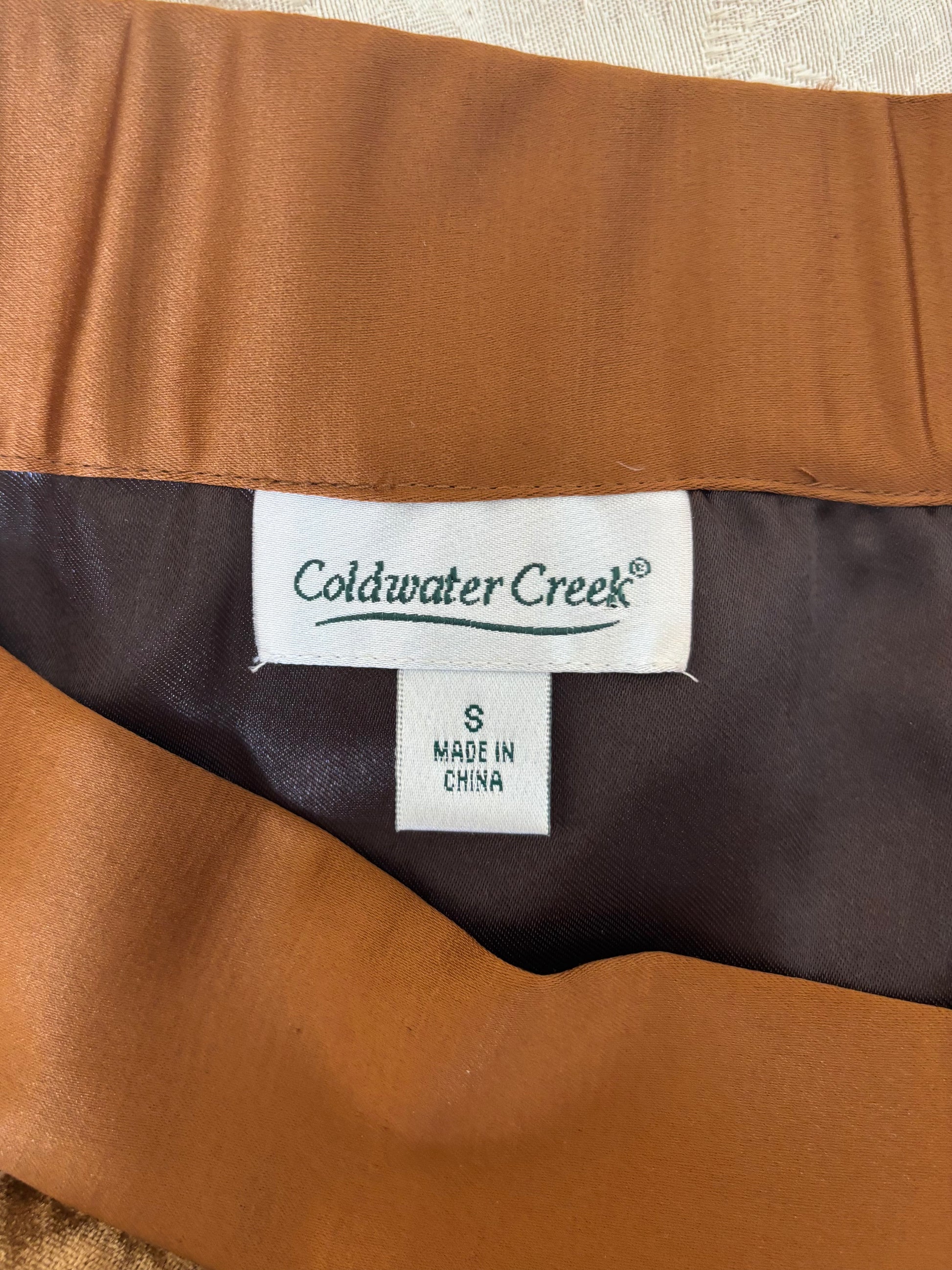 Burnout velvet midi skirt by Coldwater Creek. Features beautiful gold and brown design with satin waistband and inner lining. Zips and clasps at side.