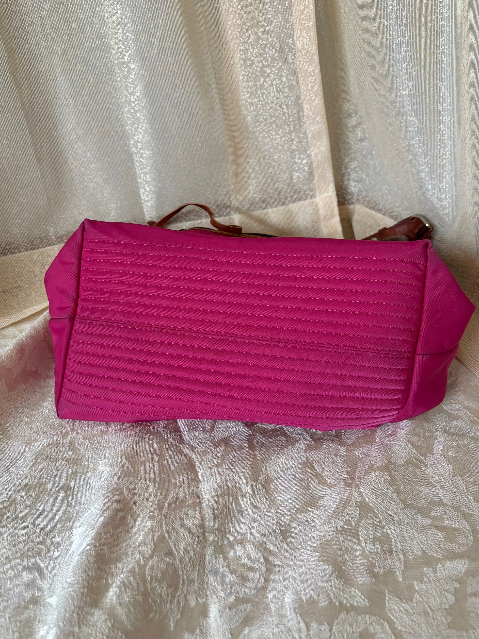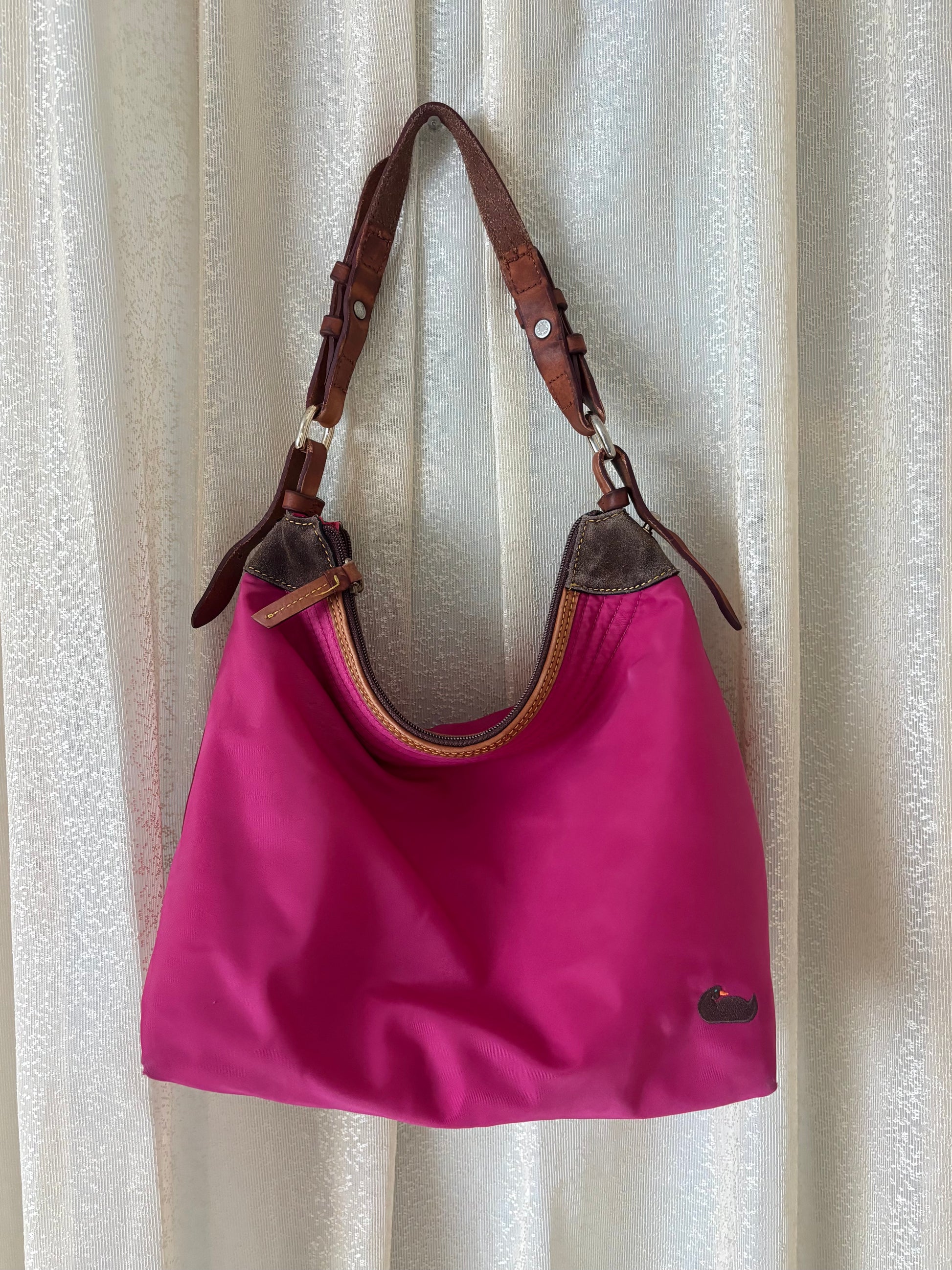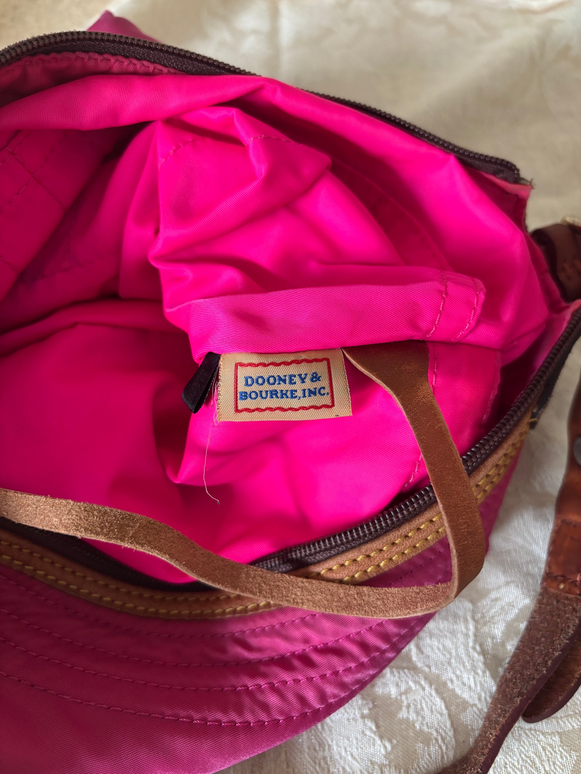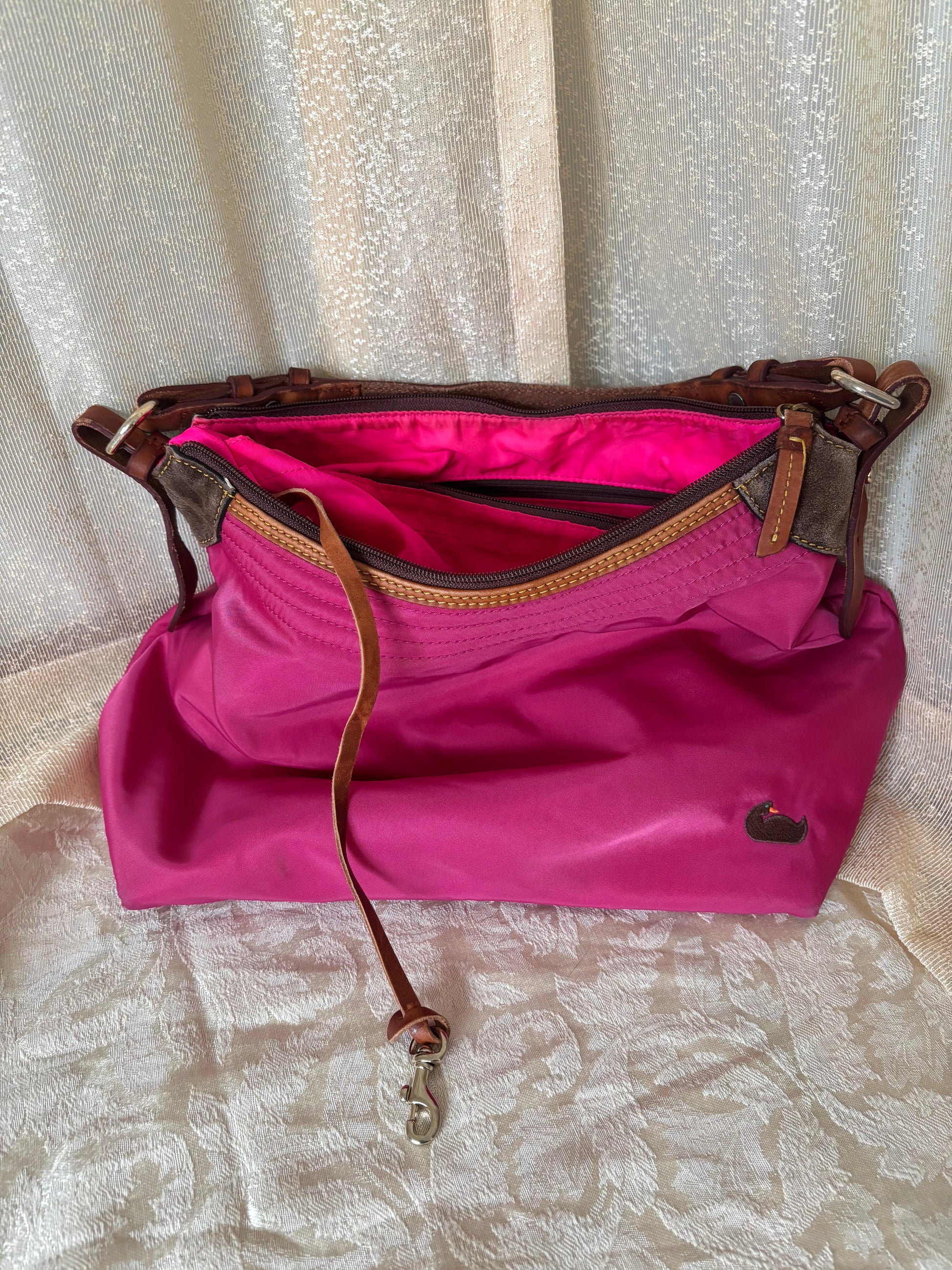 Neon pink nylon shoulder bag with suede and leather accents by Dooney & Bourke. Features hot pink interior with five pockets and central zip compartment.