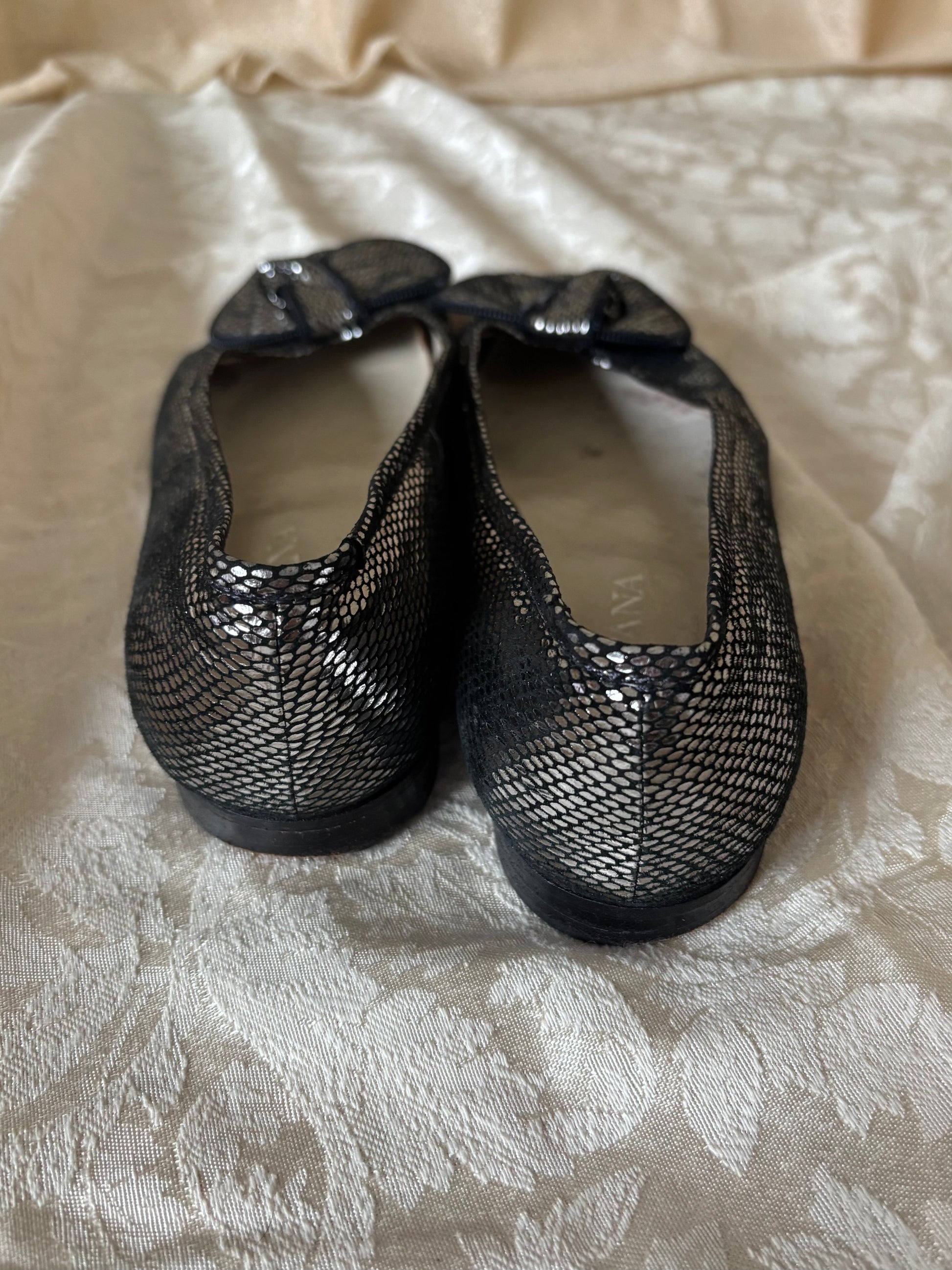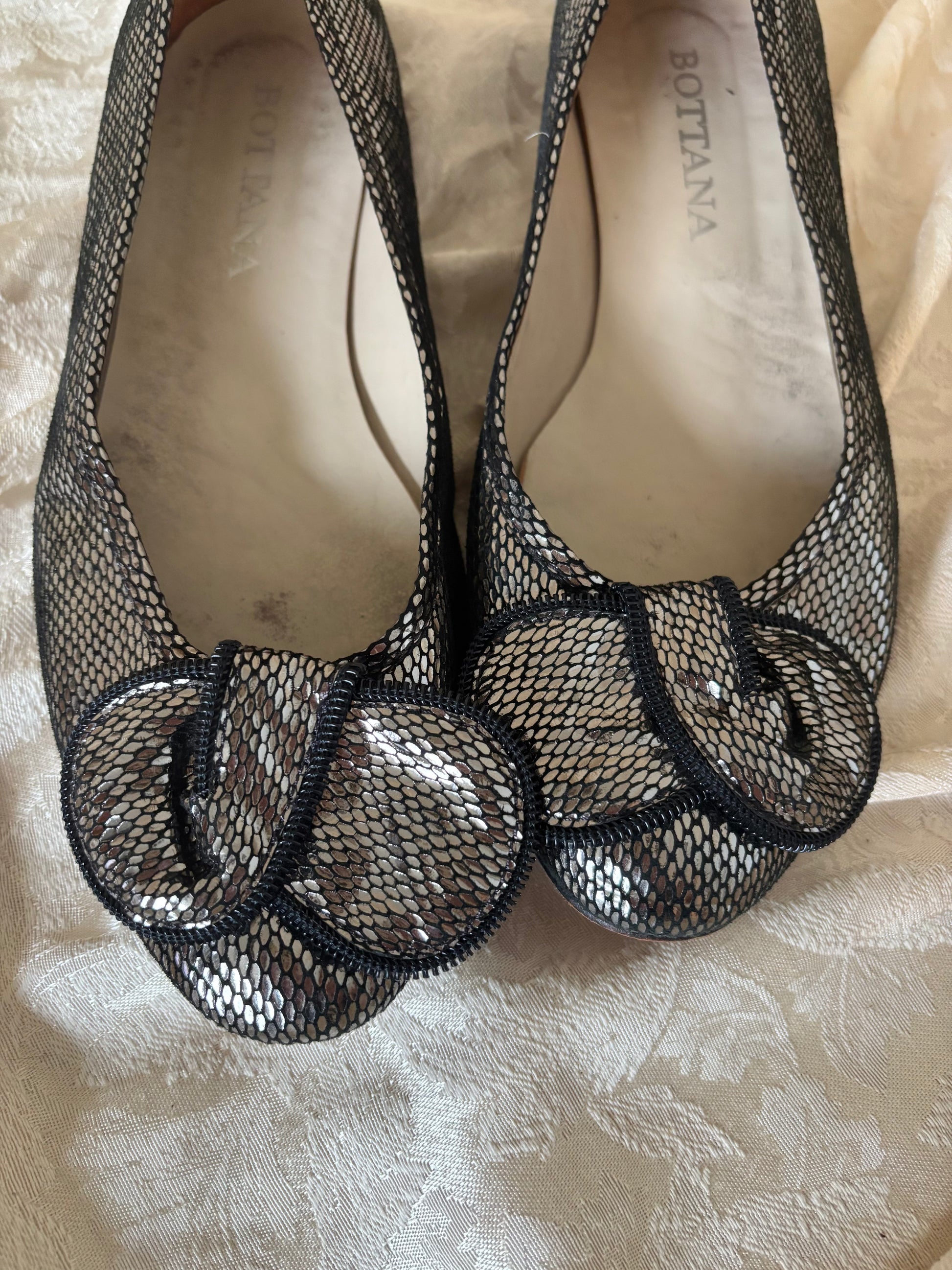 Silver metallic flats by Bottana featuring bow design on toe with zipper trims.