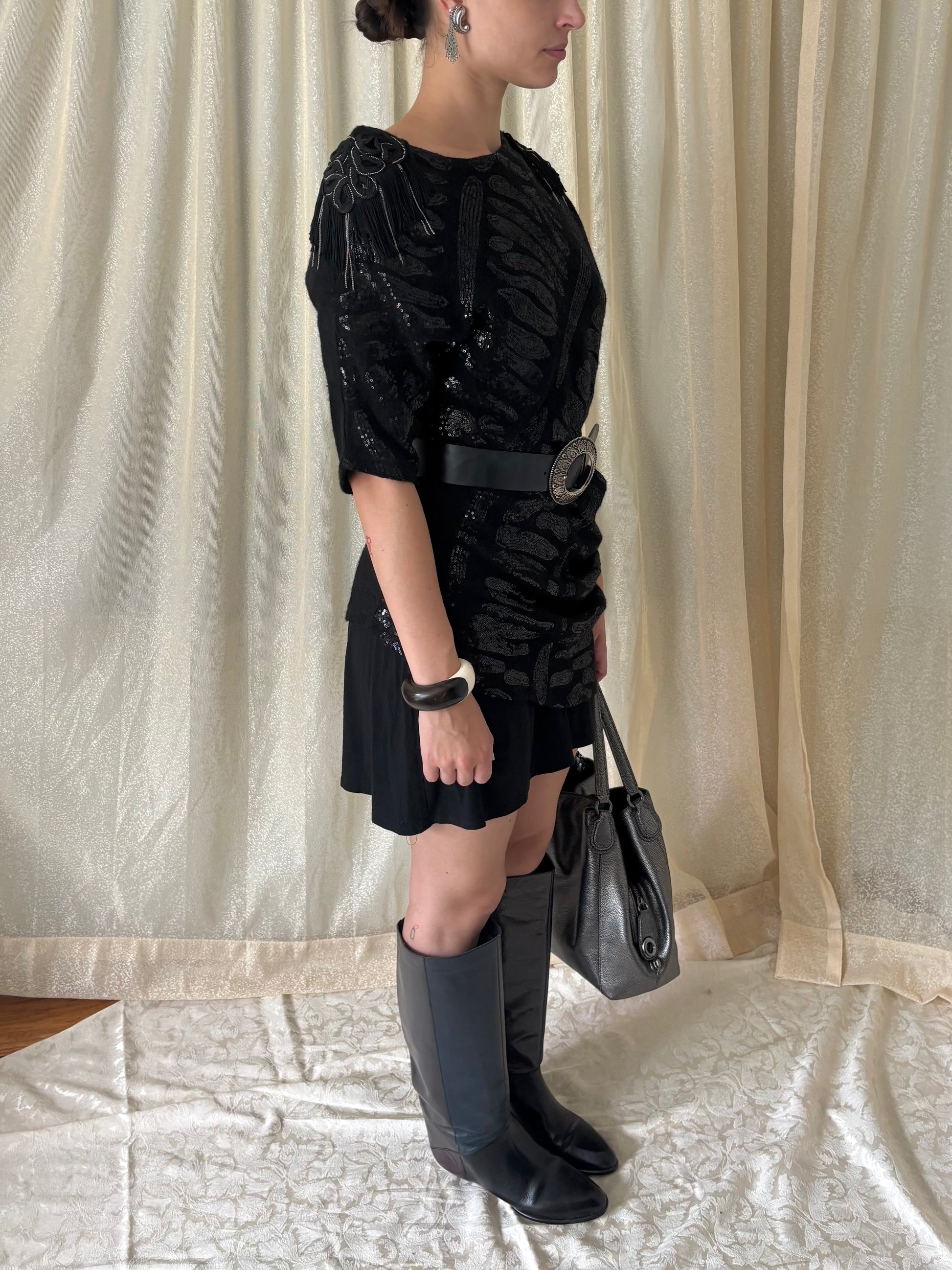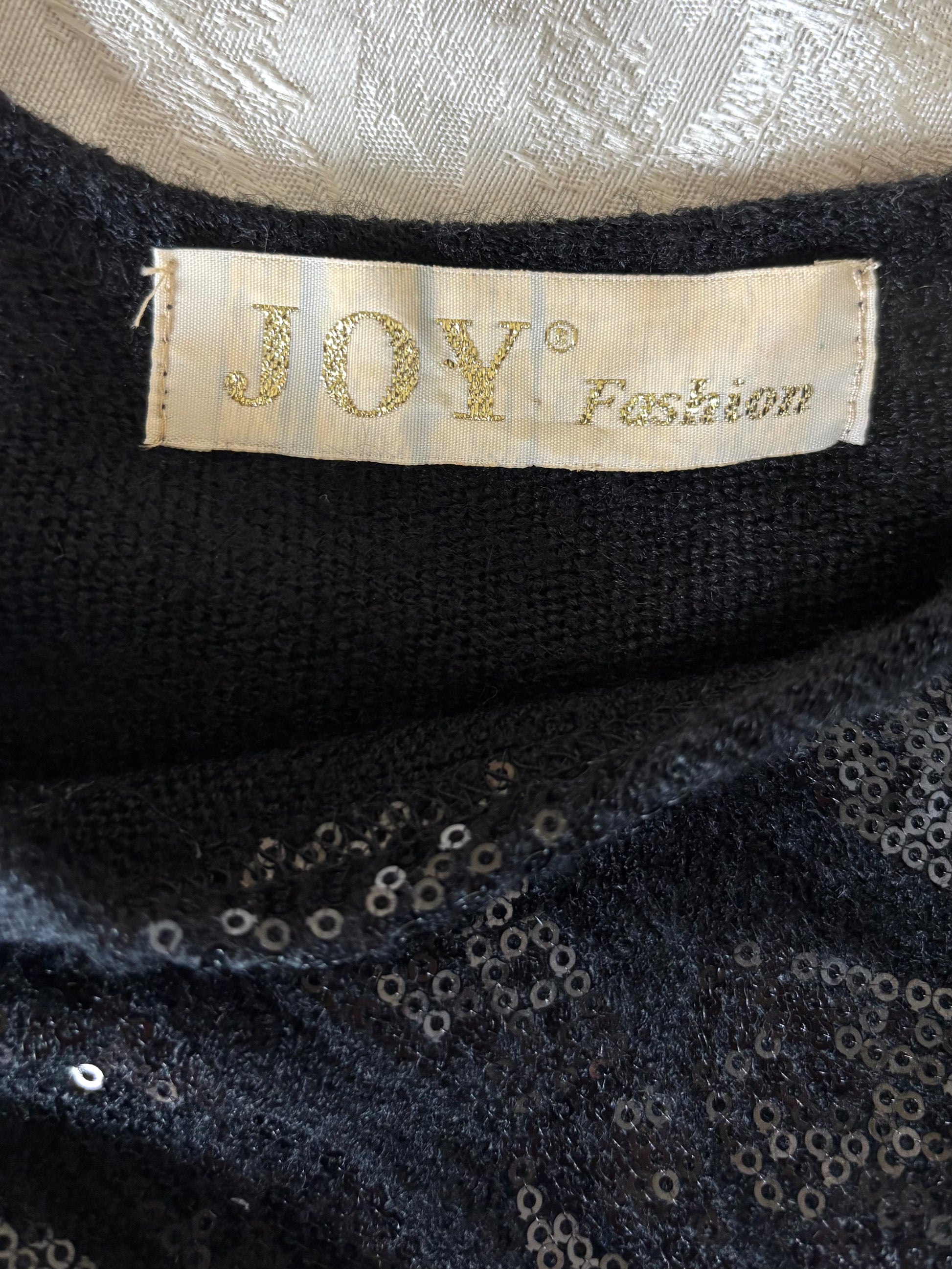 Off-shoulder sweater poncho with sequin and fringe shoulder embellishments.