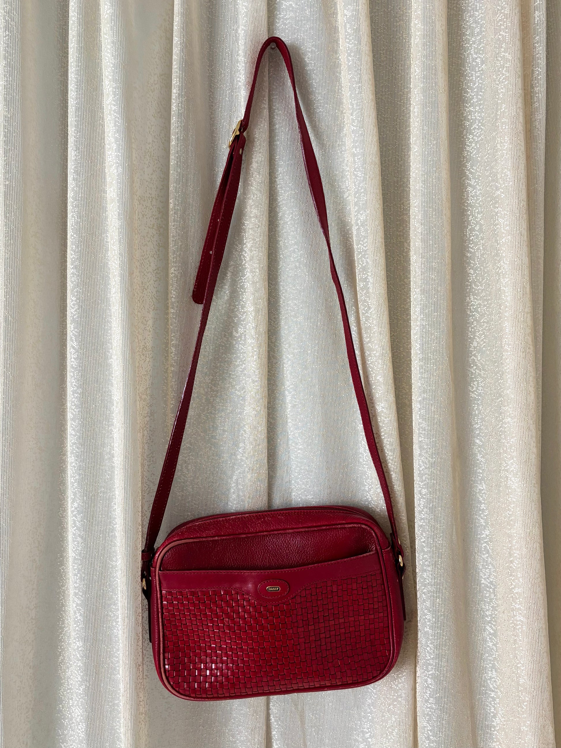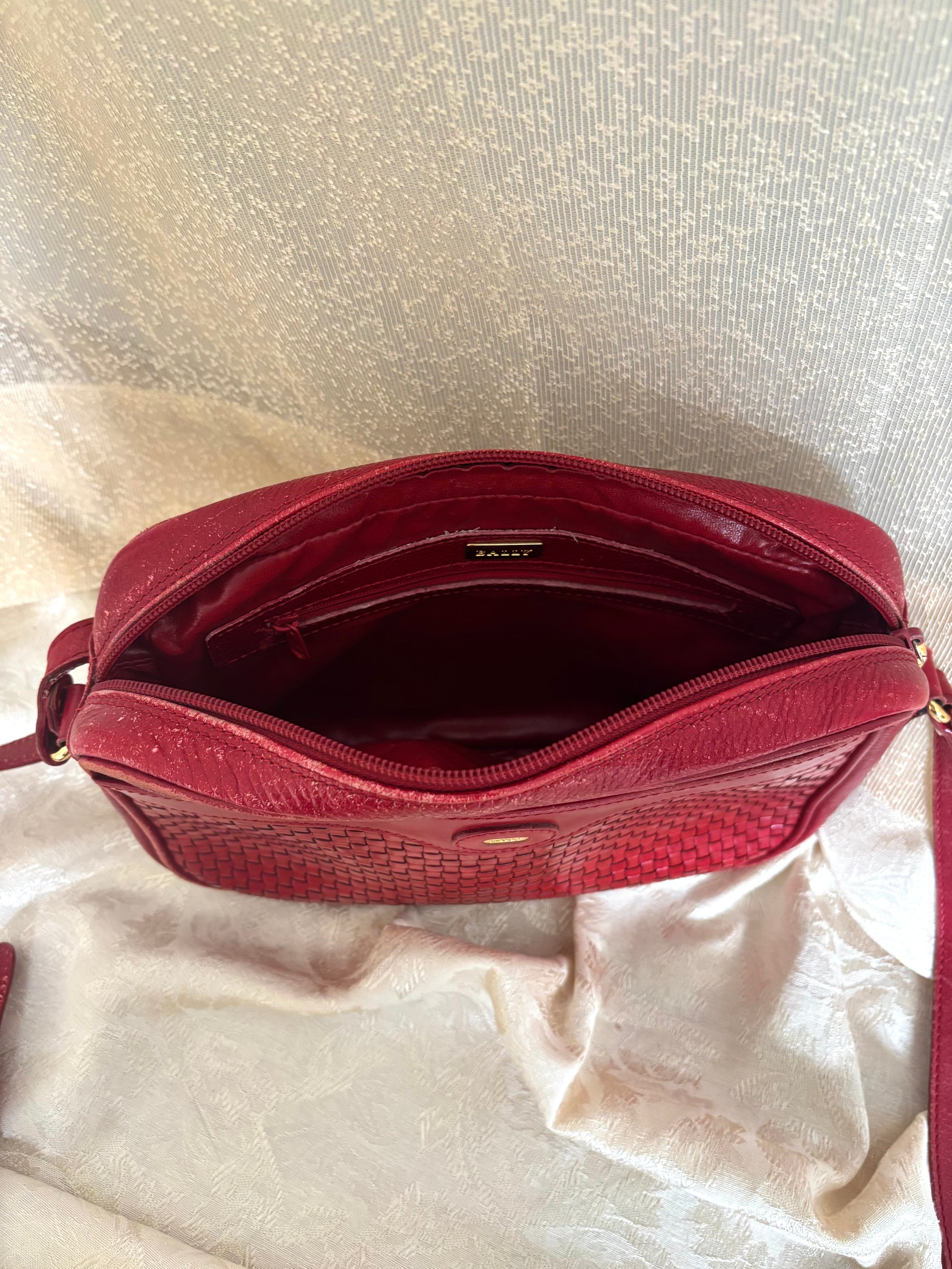 Vibrant cherry woven leather crossbody by Bally. Features plush leather interior with one exterior and one interior pocket. Made in Italy.