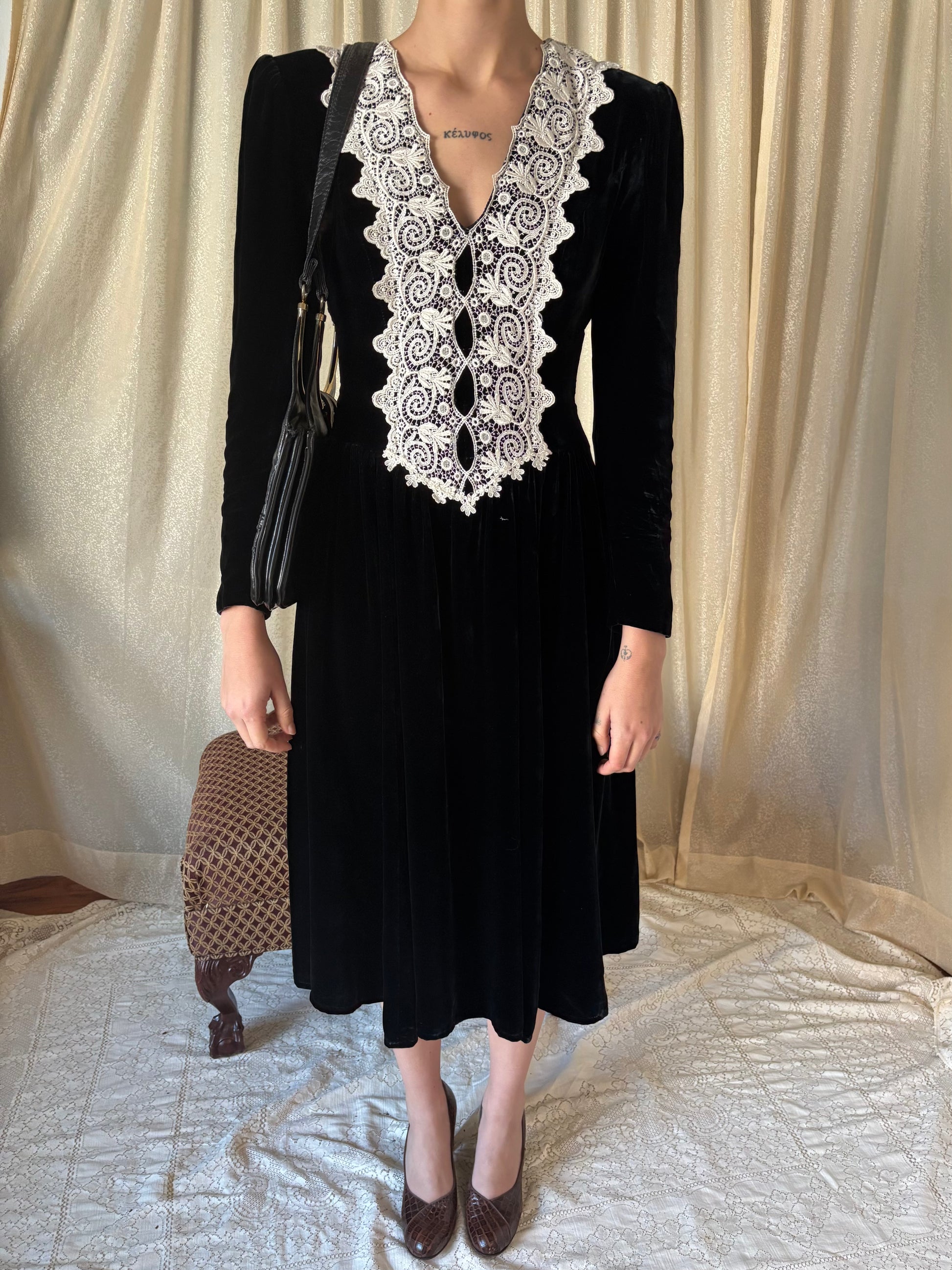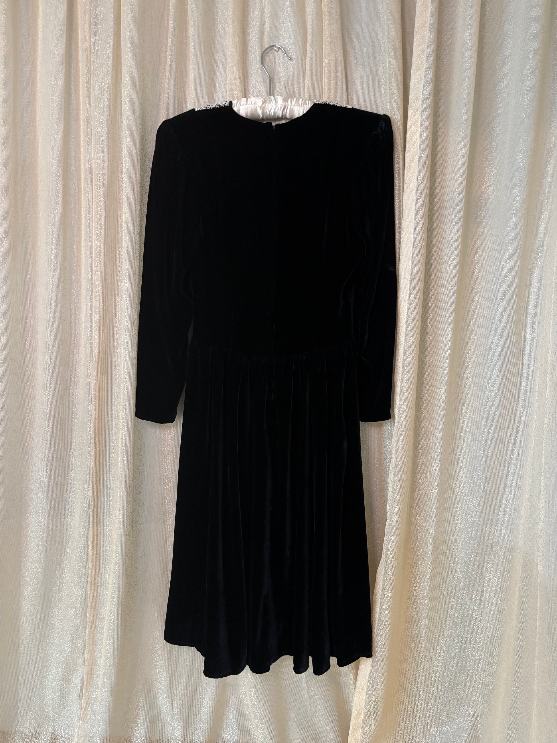 80s black velvet dress with Victorian-style lace trim by Jessica McClintock. Features padded shoulders with fitted bodice. Zips up the back. Made in the U.S.A.