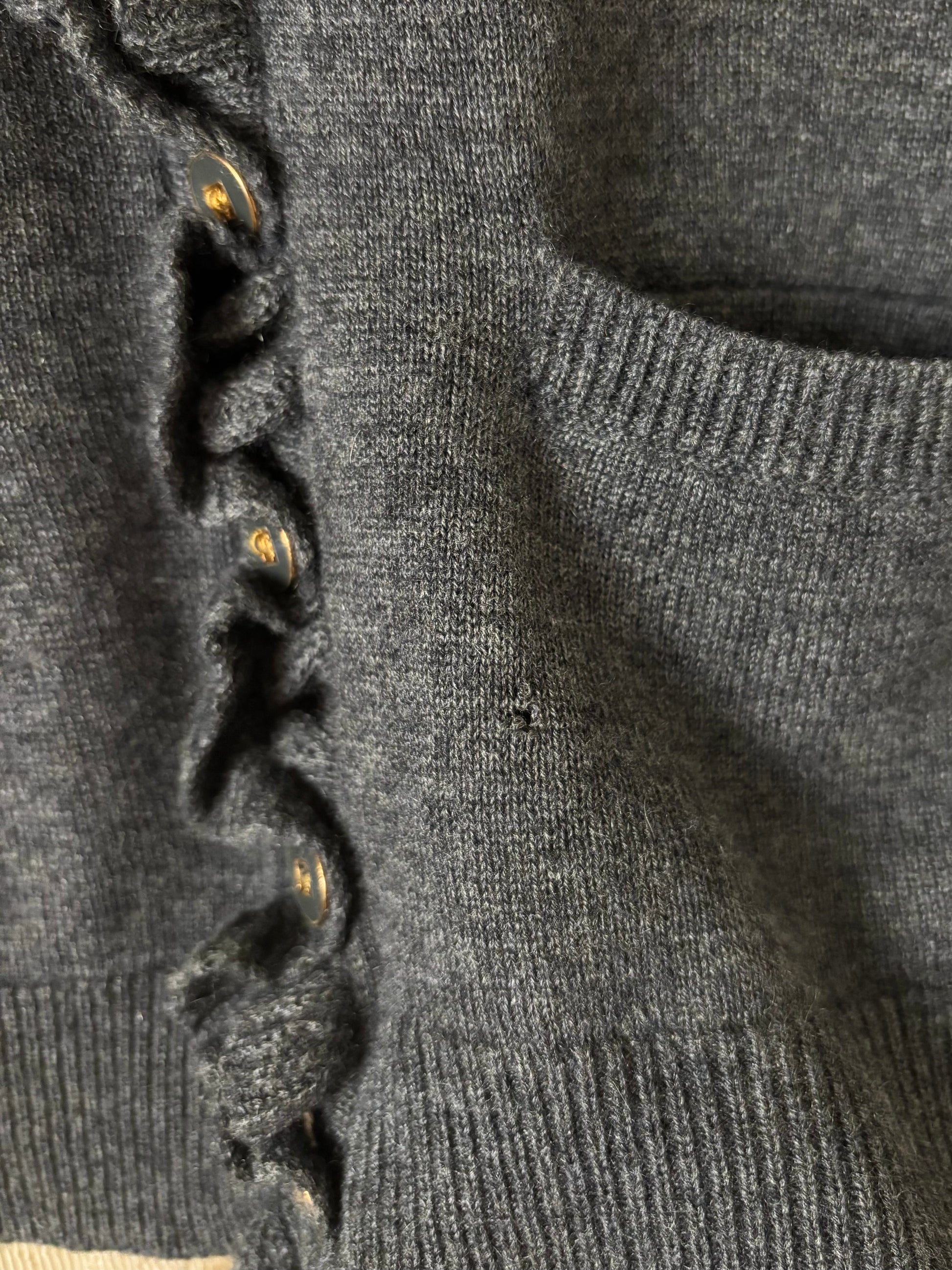 Late 00s grey ruffle cardigan by Juicy Couture. Made of wool, viscose, and cashmere blend. Features buttons and 2 front pockets. Soft and stretchy material.