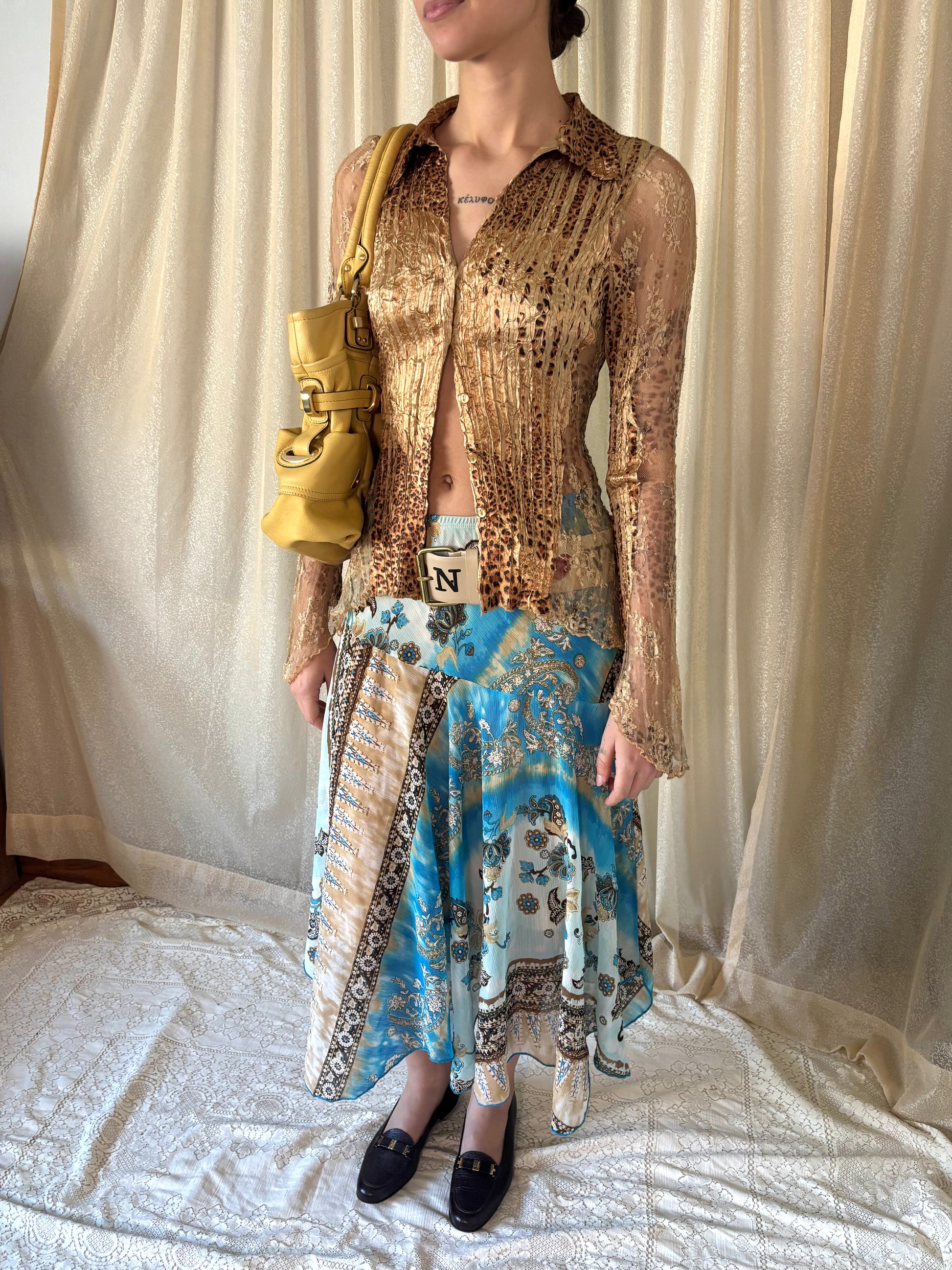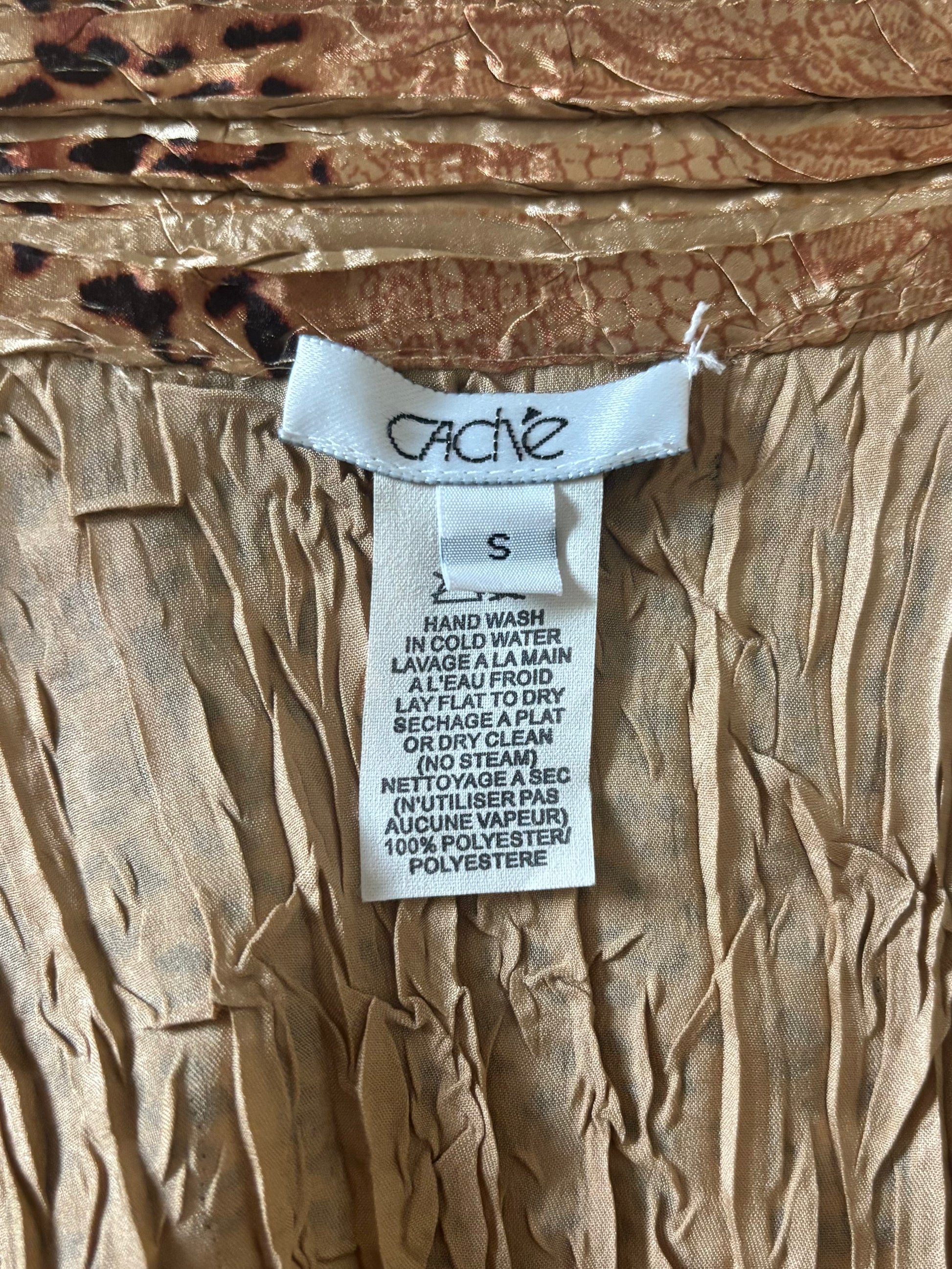 Amazing 90s lacey leopard bell-sleeve blouse by Caché. Semi-sheer with a pleated crinkle effect and slim but flowy fit.