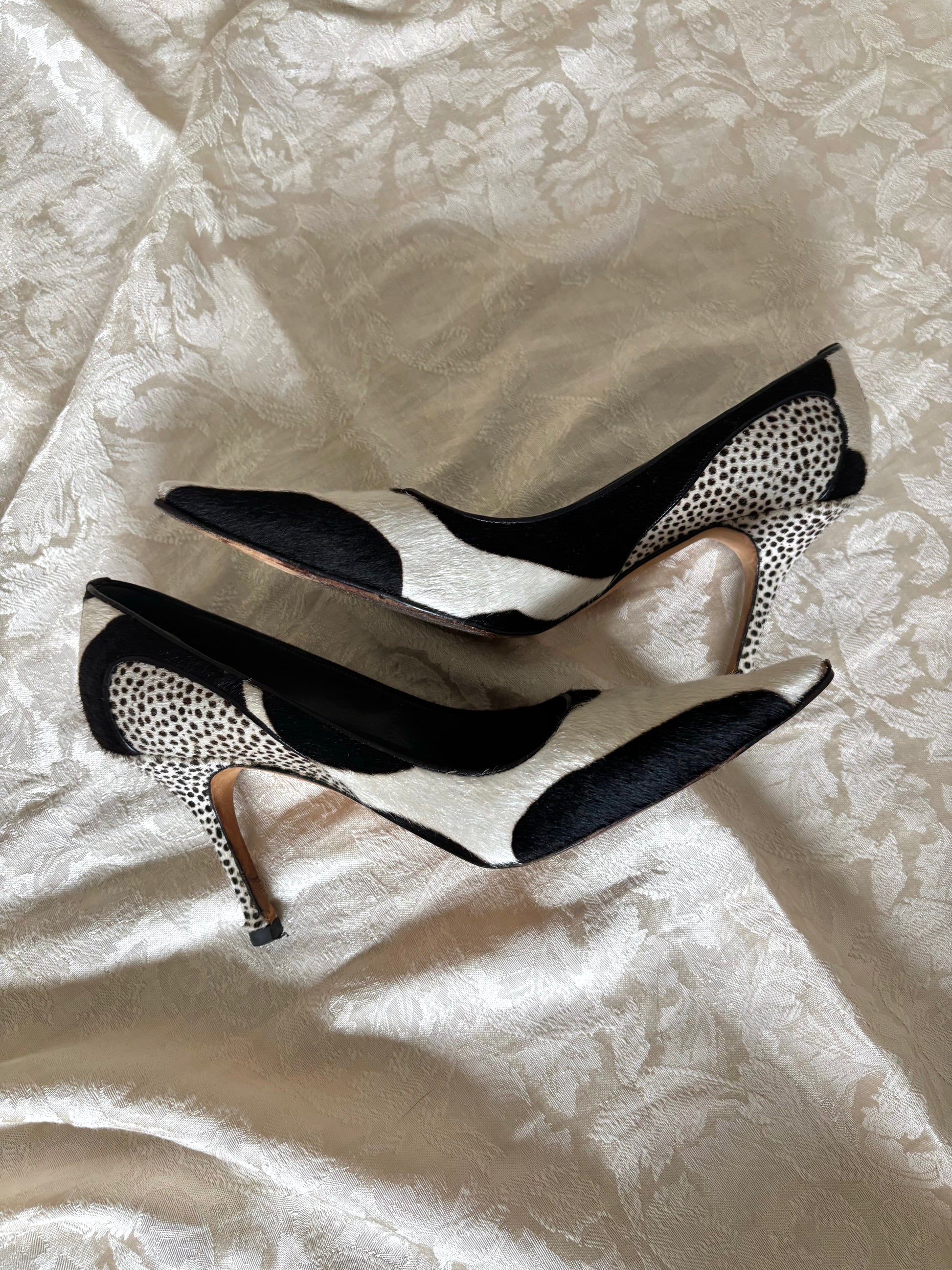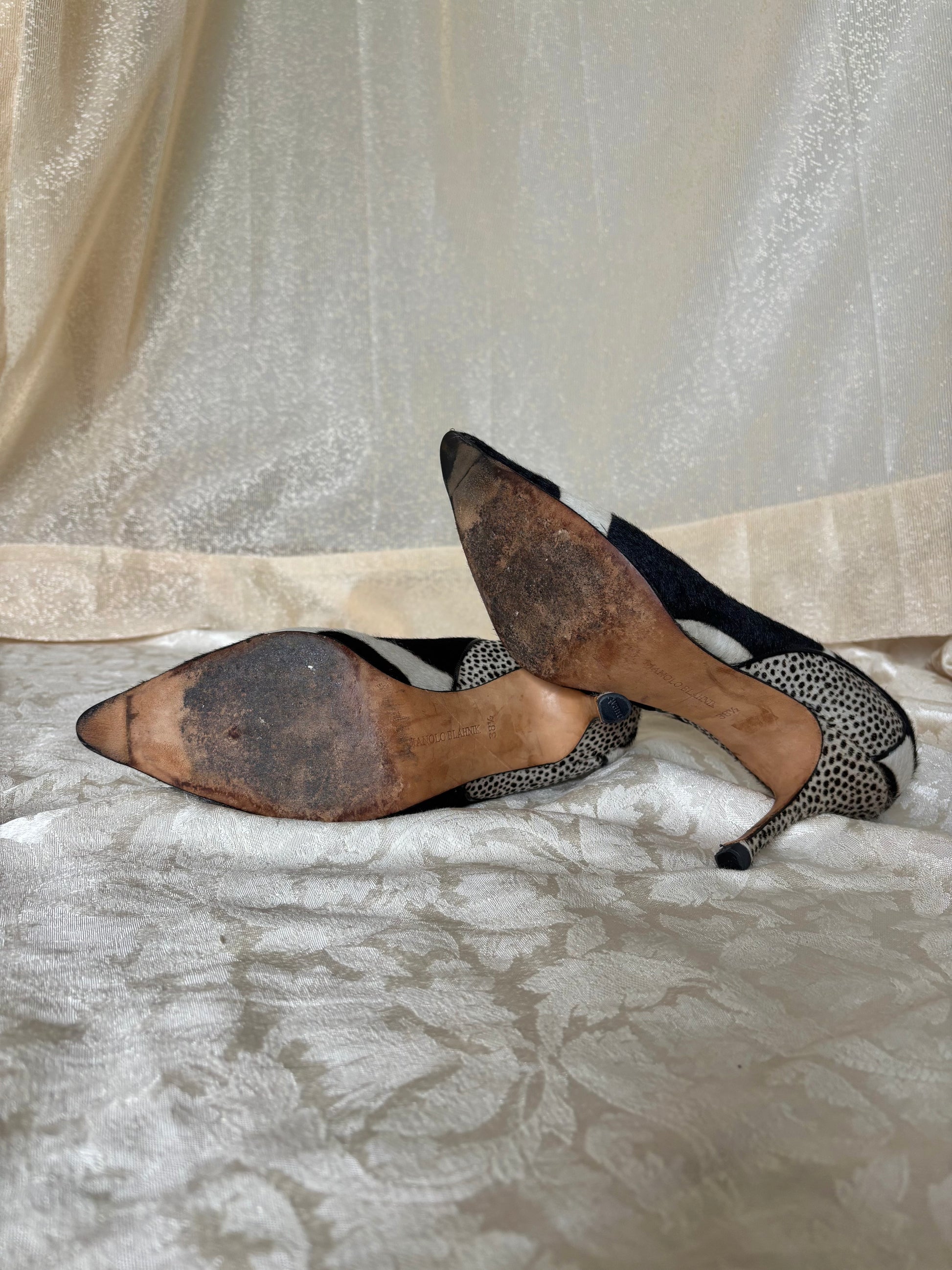 Incredible rare vintage Manolo Blahnik stilettos with pony hair cow-print design and leather trims.