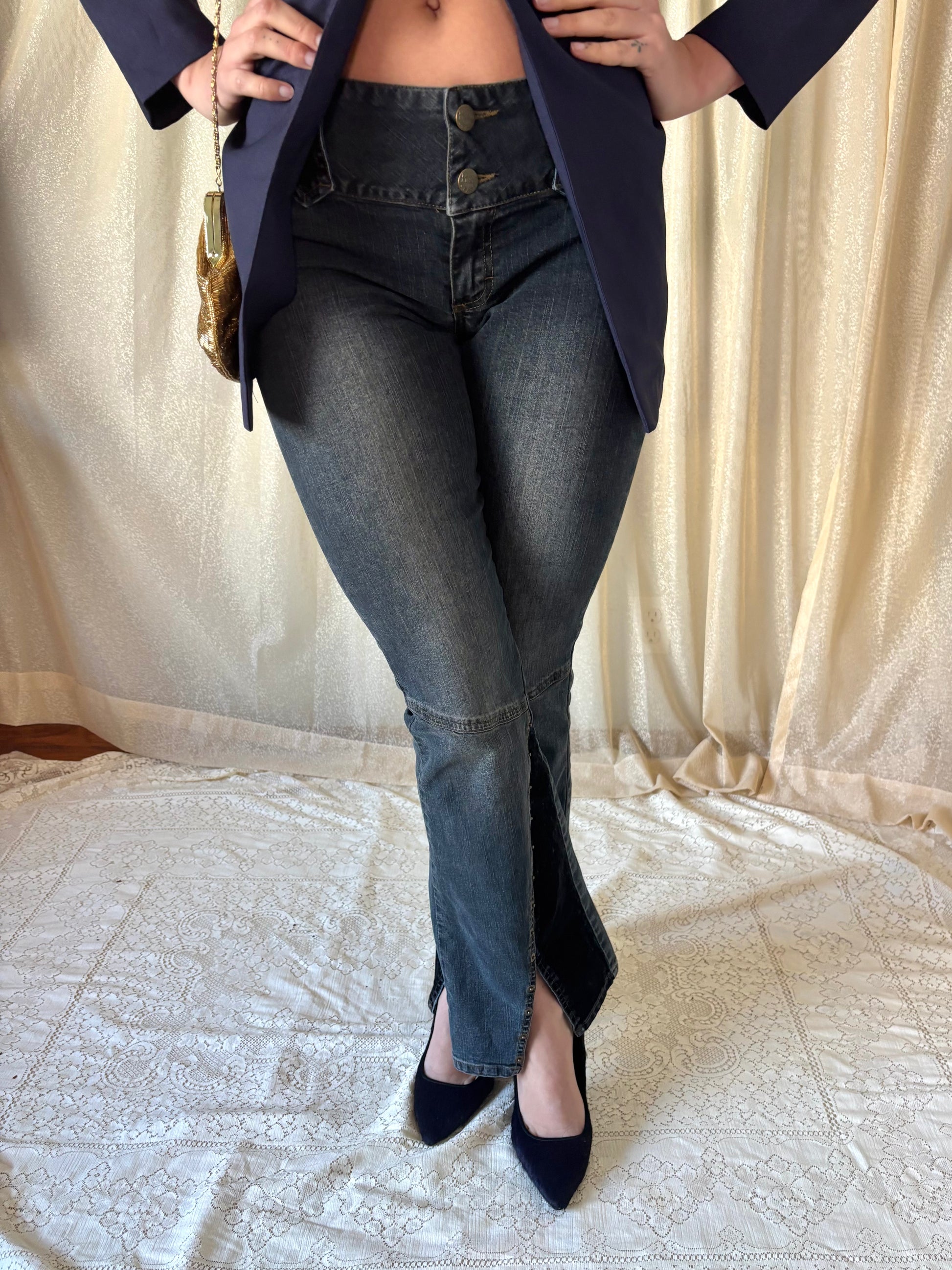 90s cotton denim flares by Mudd with navy velvet cutout design and snap button detail.