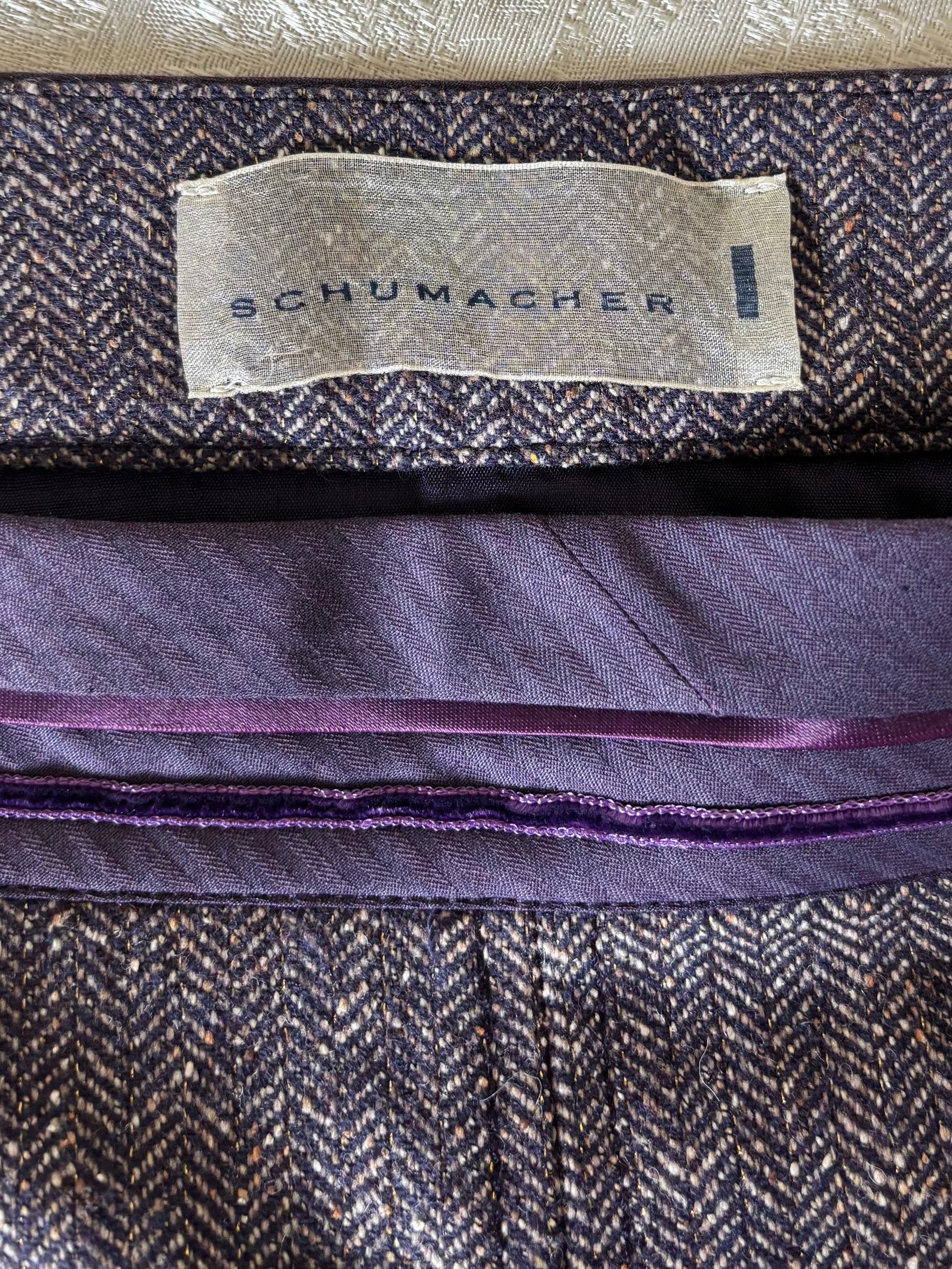 Dorothee Schumacher purple wool skirt with velvet side ribbon and subtle gold threads throughout. Features side zipper. Made in Italy.