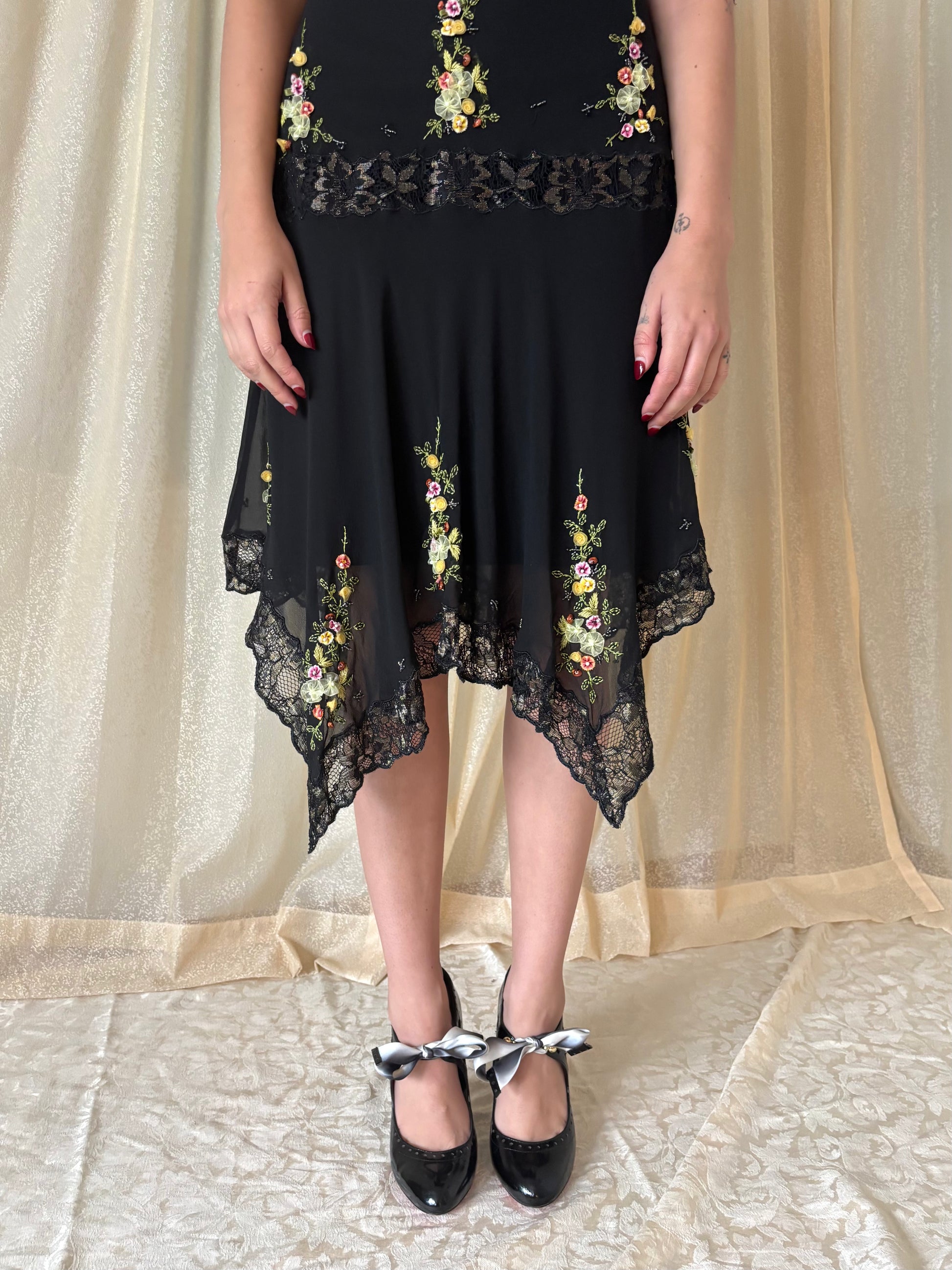 Absolutely stunning 90s lace and silk floral applique midi dress by Sue Wong. Features wide flowy lace sleeves with floral applique and beaded design. Zips up the side.