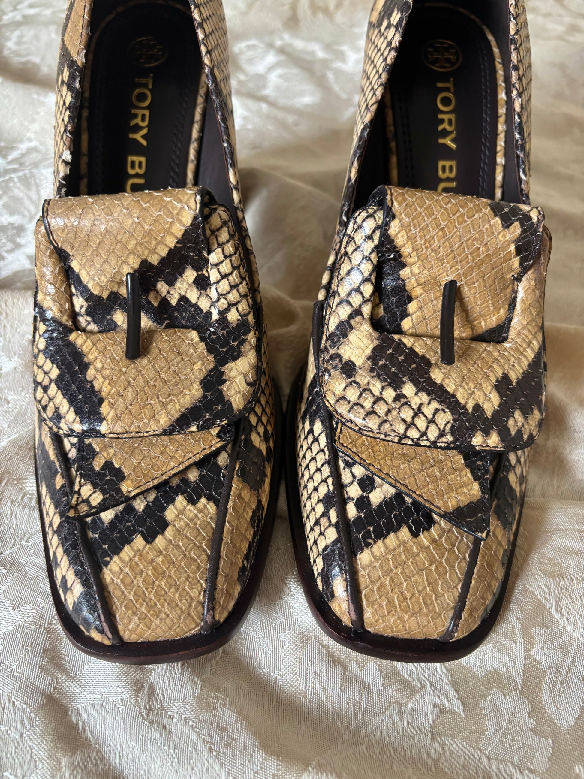 Amazing snake-print buckle loafer pumps with arched heel by Tory Burch.