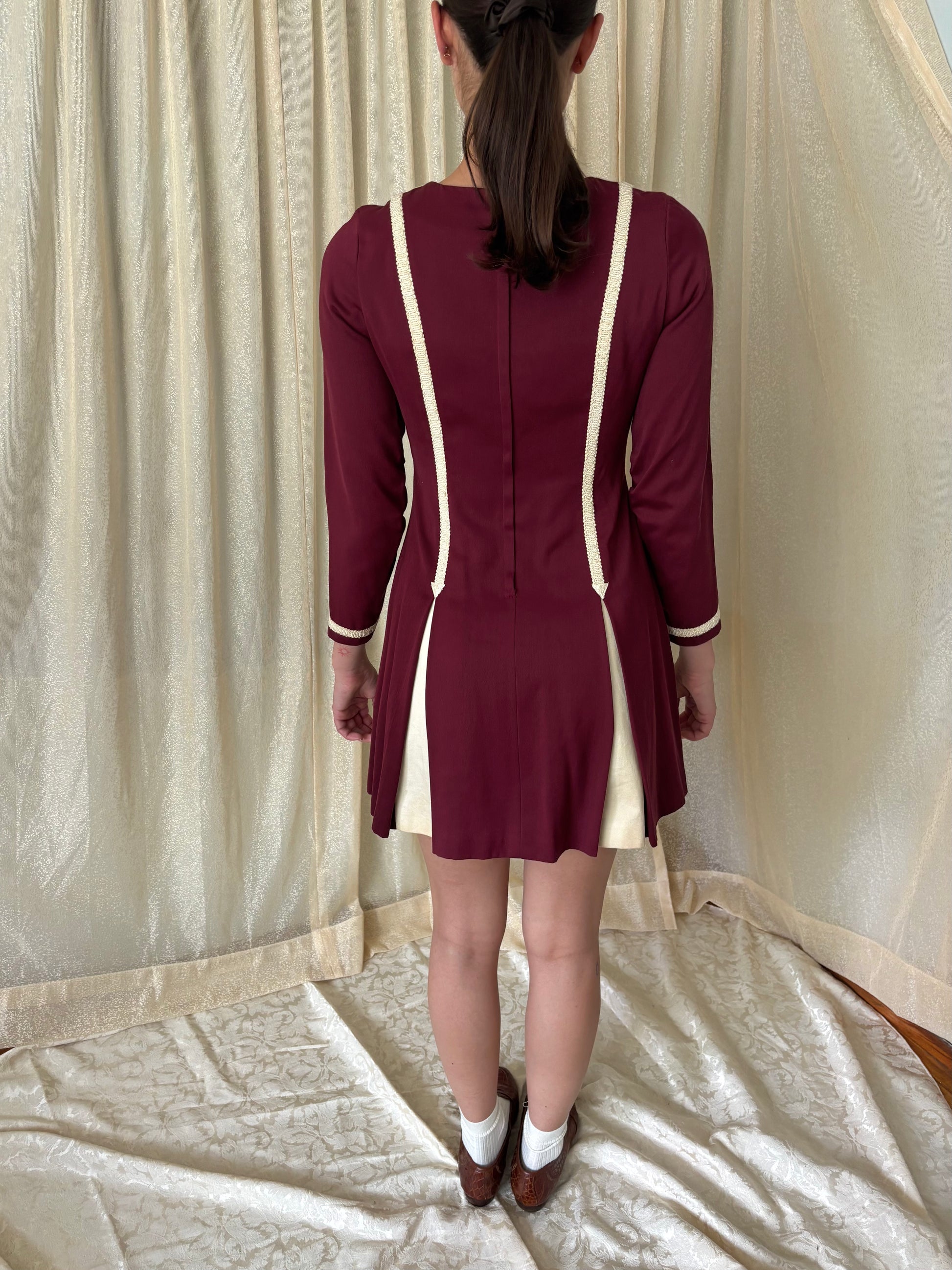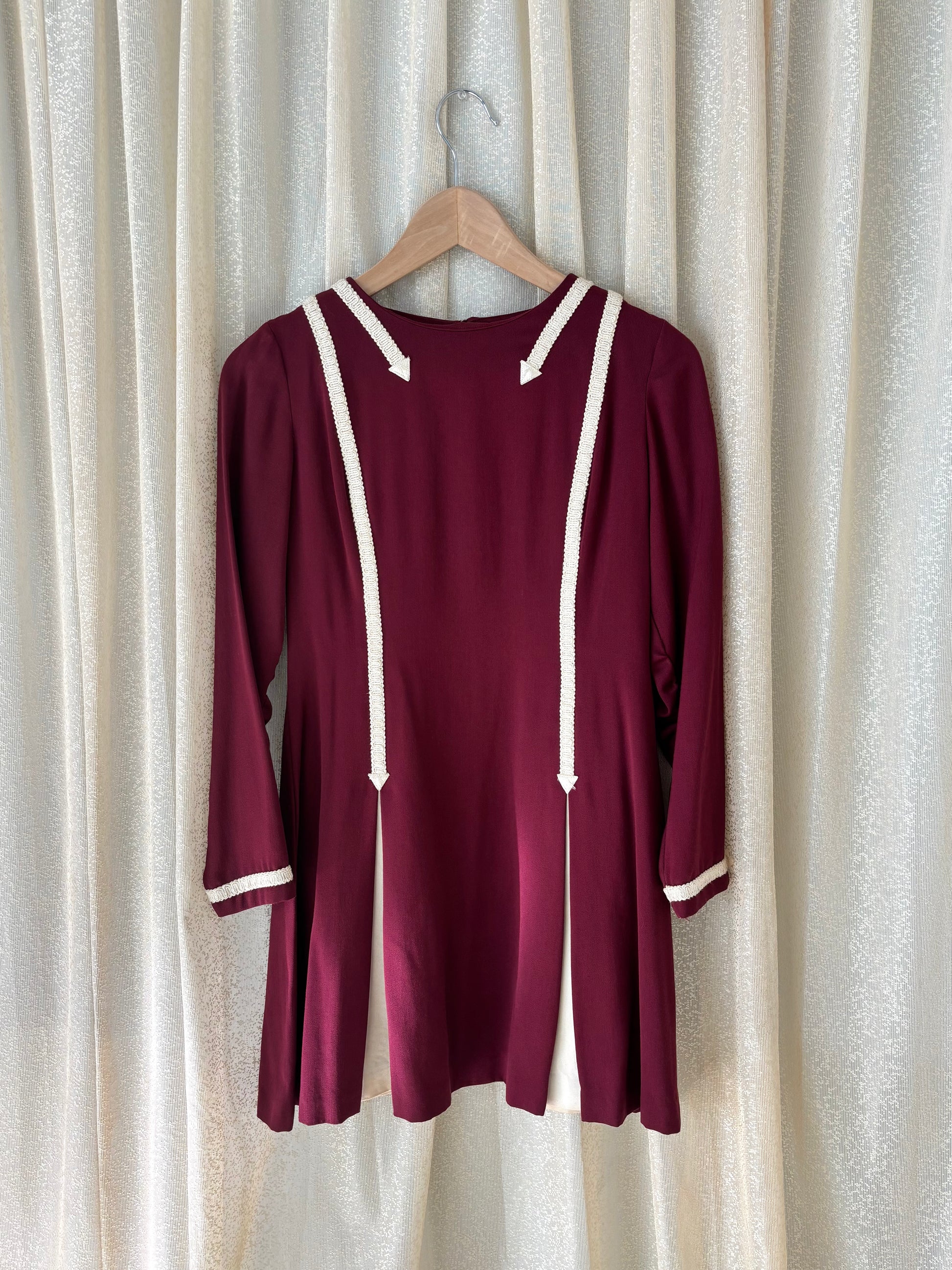 Adorable 40s-style vintage handmade dress with white and burgundy arrow design. Features structured bodice with flared pleated skirt. Zips in the back.