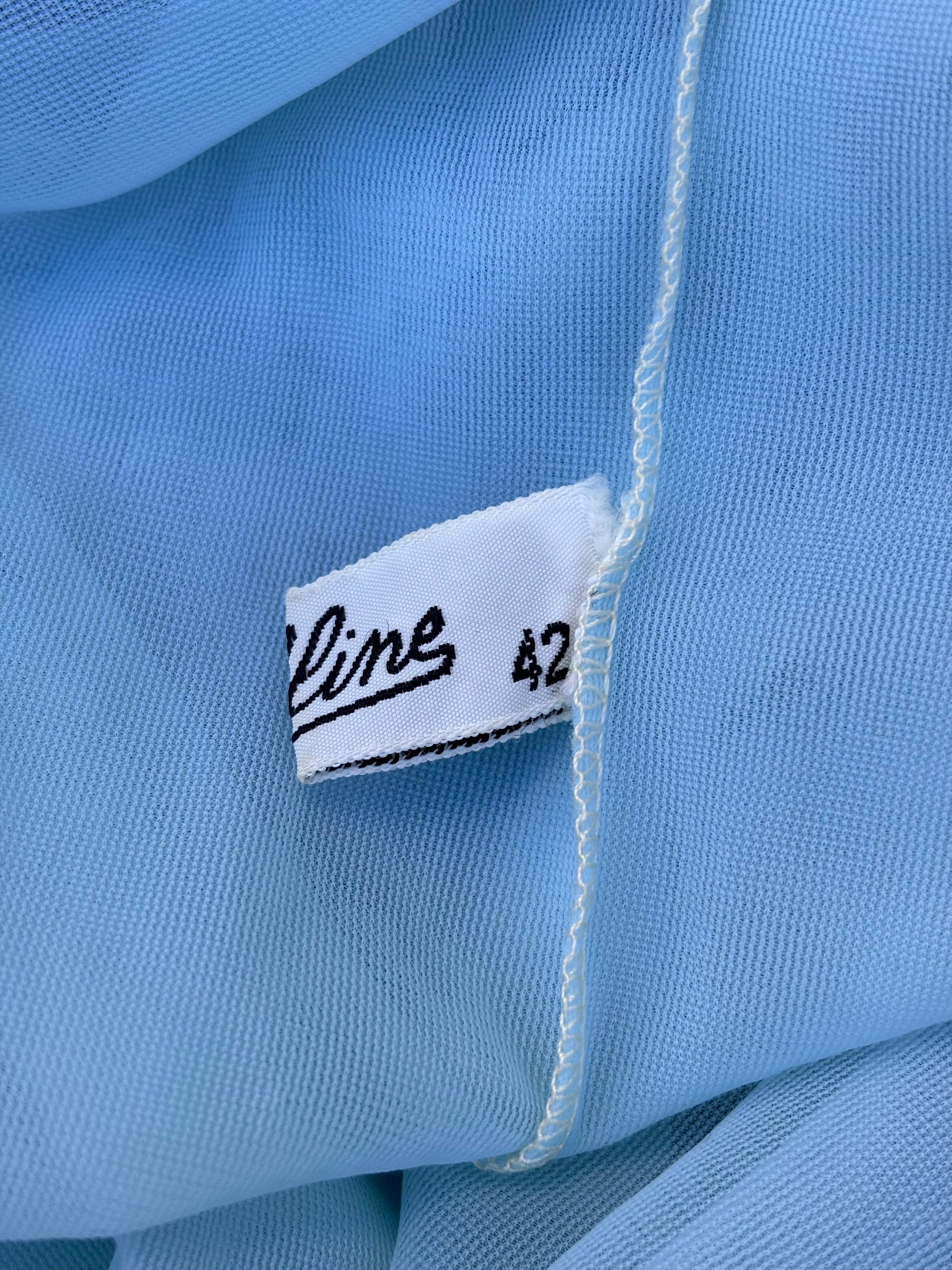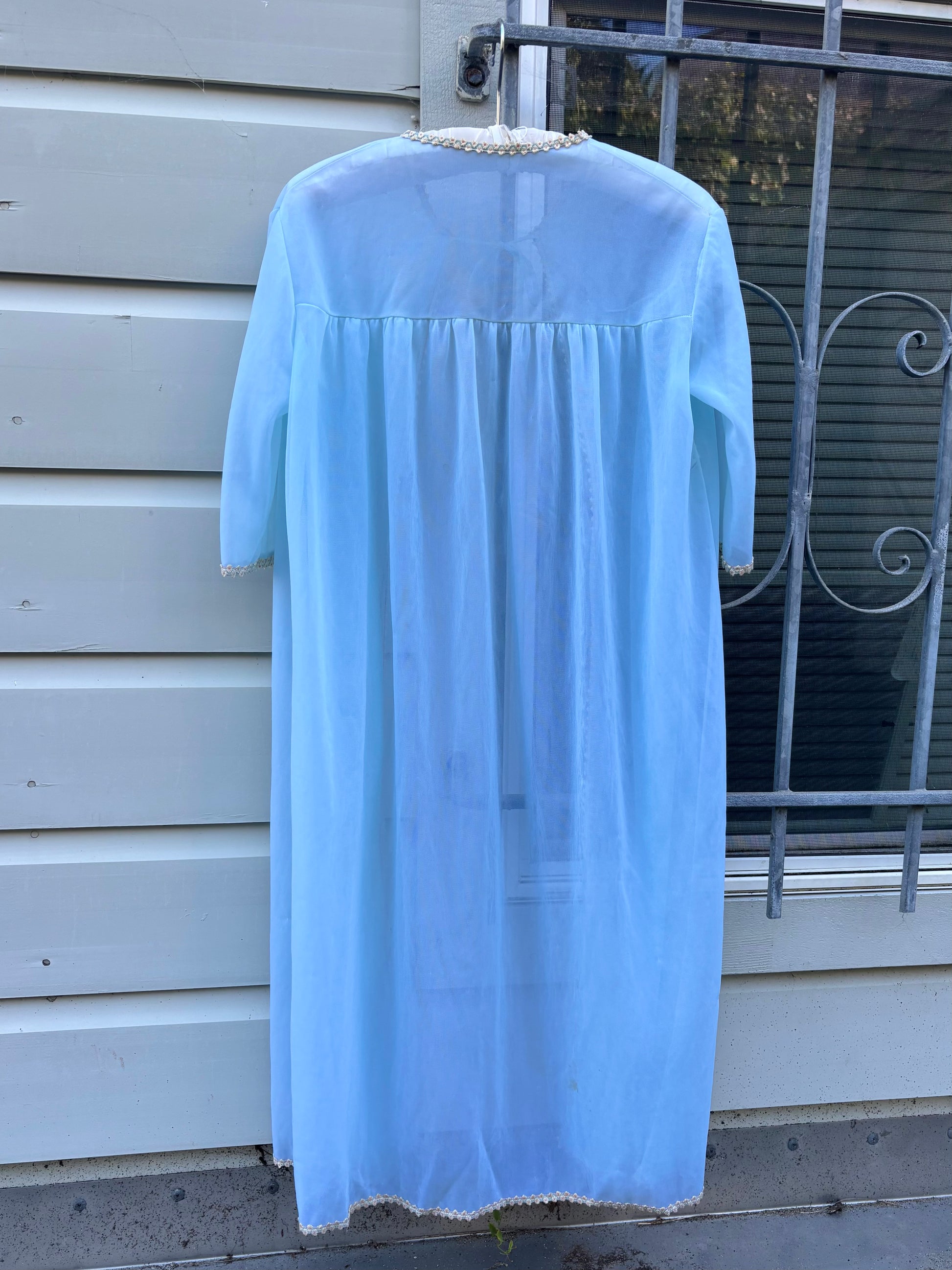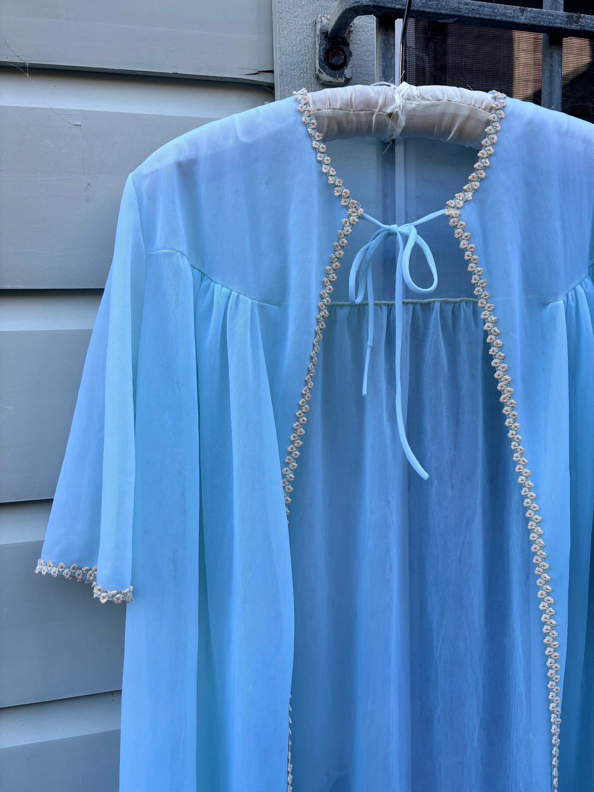 Vintage blue peignoir robe with the sweetest floral trim and front ties by Creation Nobline.