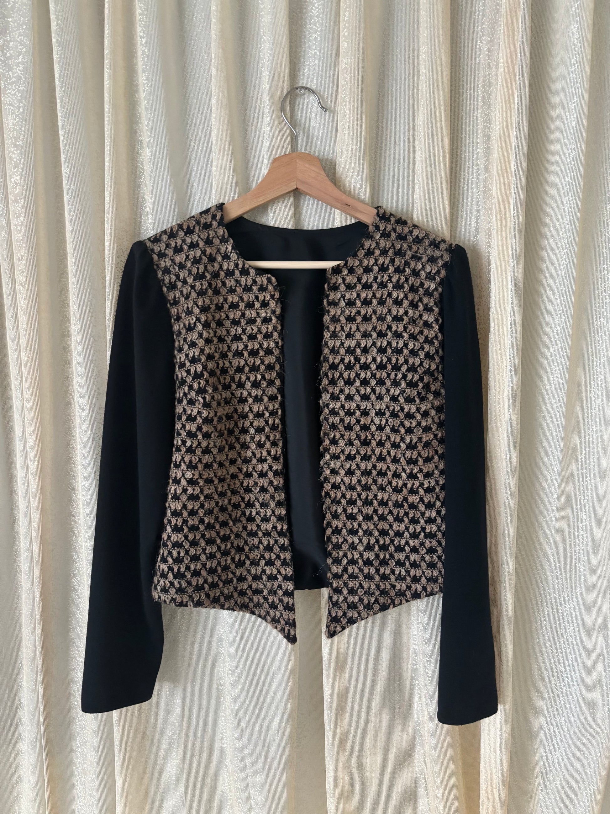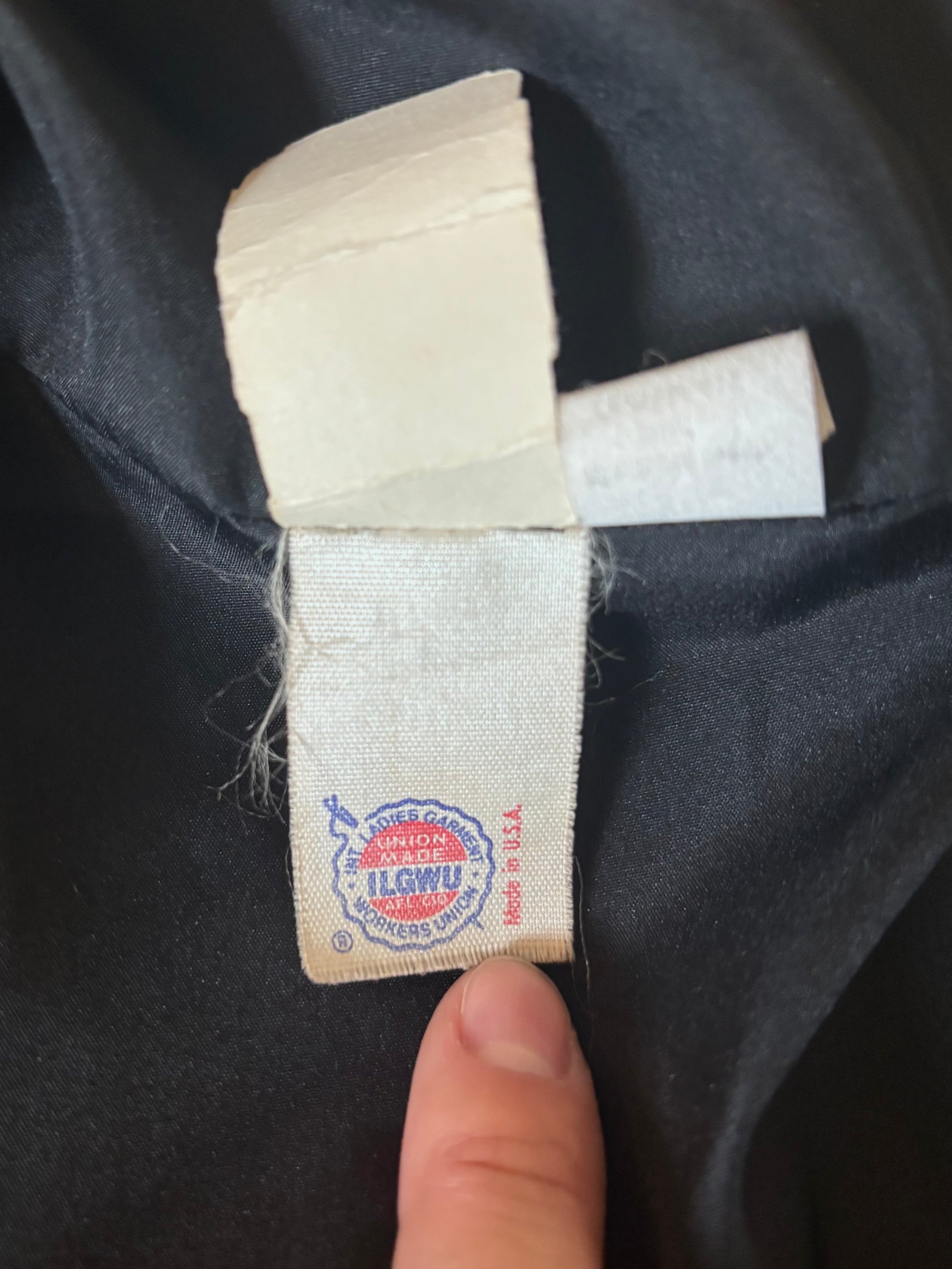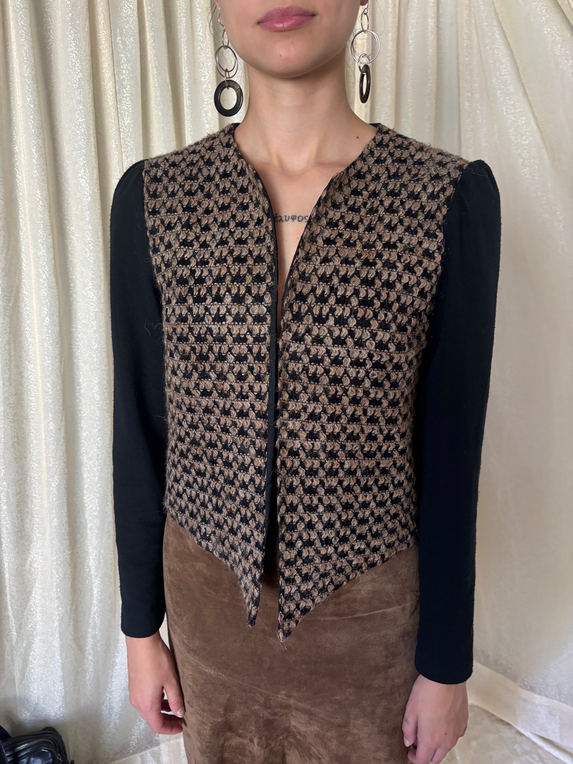 Vintage lightweight jacket with frontal knit vest design and pointed hems. No closure fixture. Brand unknown. Union made in the U.S.A.
