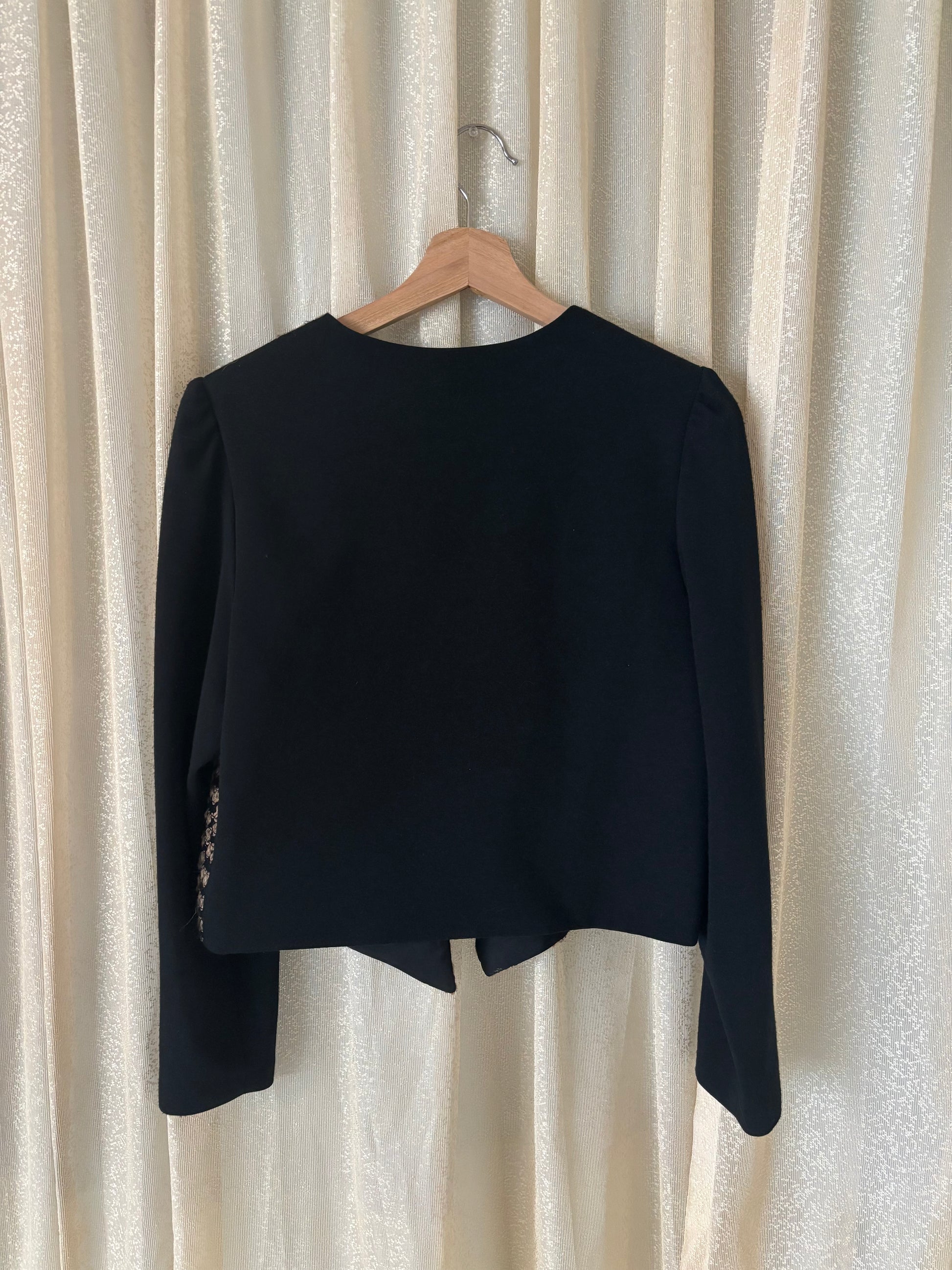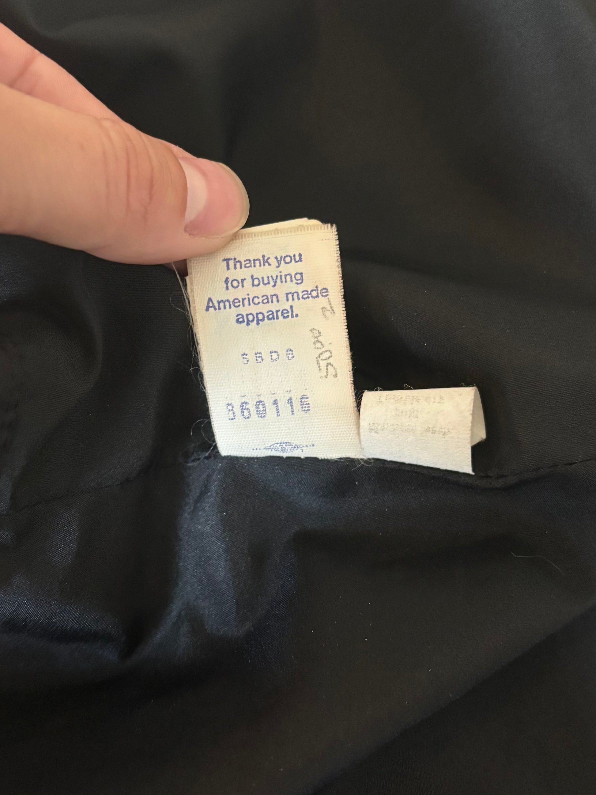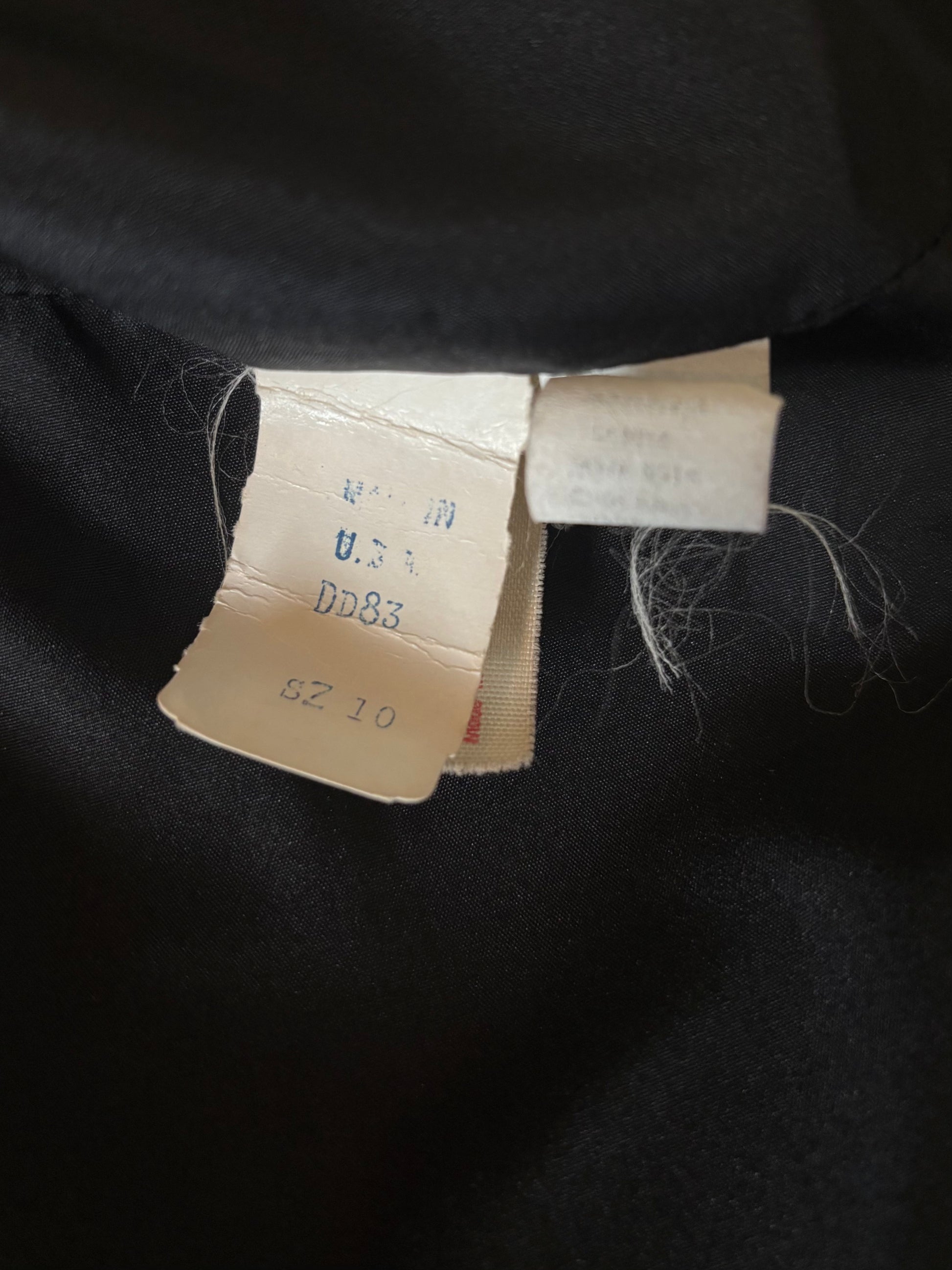 Vintage lightweight jacket with frontal knit vest design and pointed hems. No closure fixture. Brand unknown. Union made in the U.S.A.