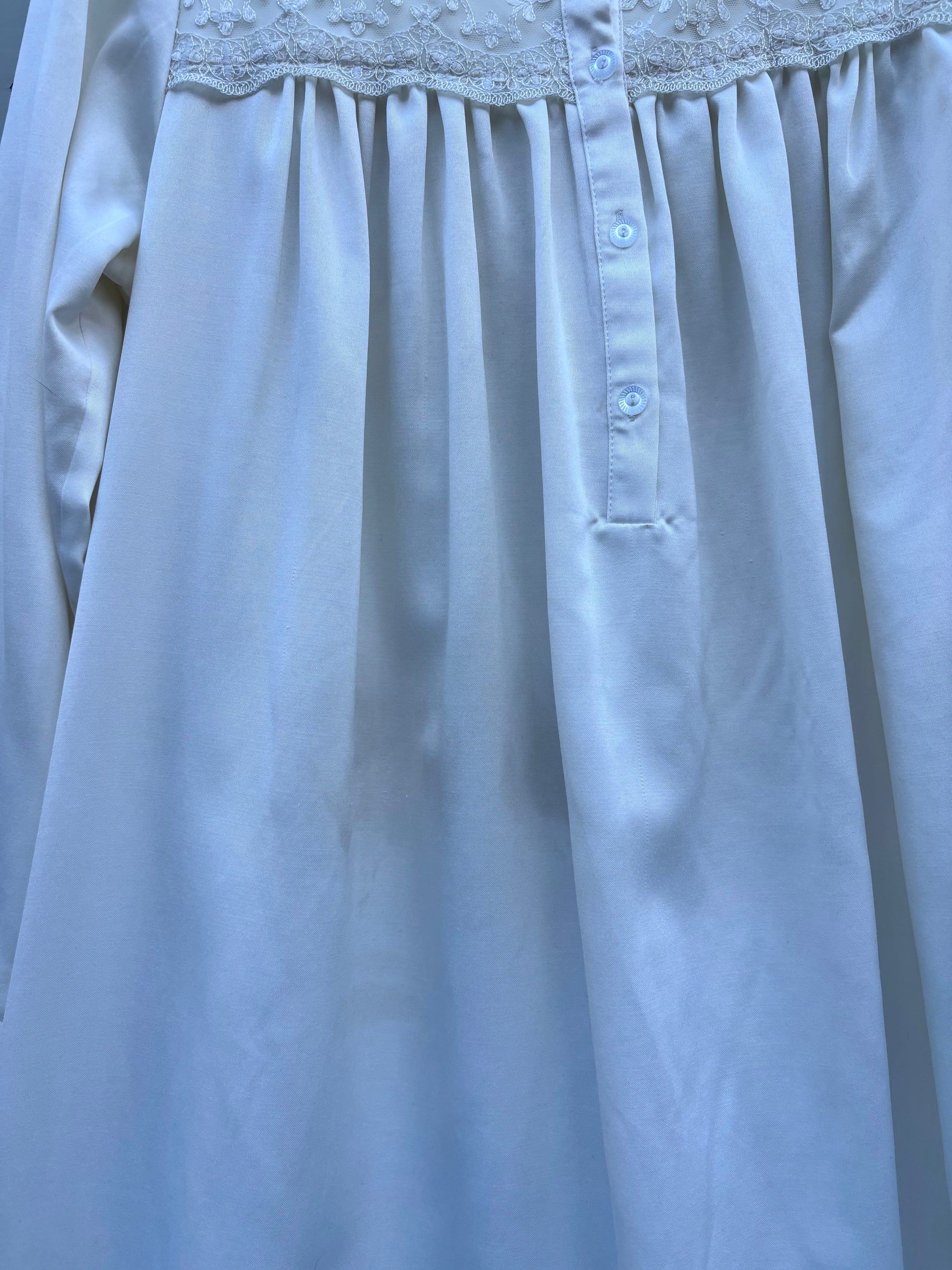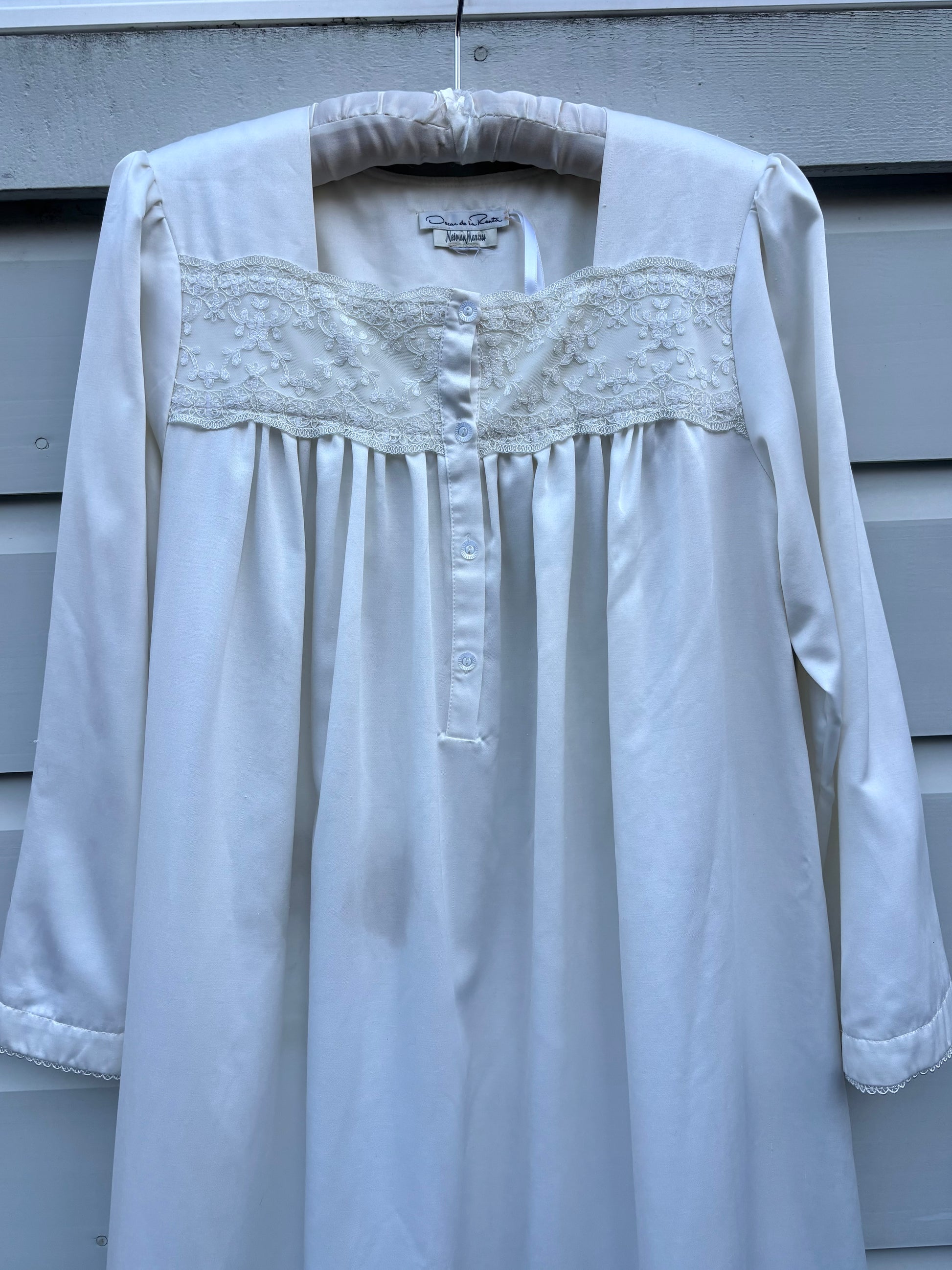 Vintage white nightgown with embroidered lace chest detail by Oscar de la Renta. Thick satin pleated material with front button closure.