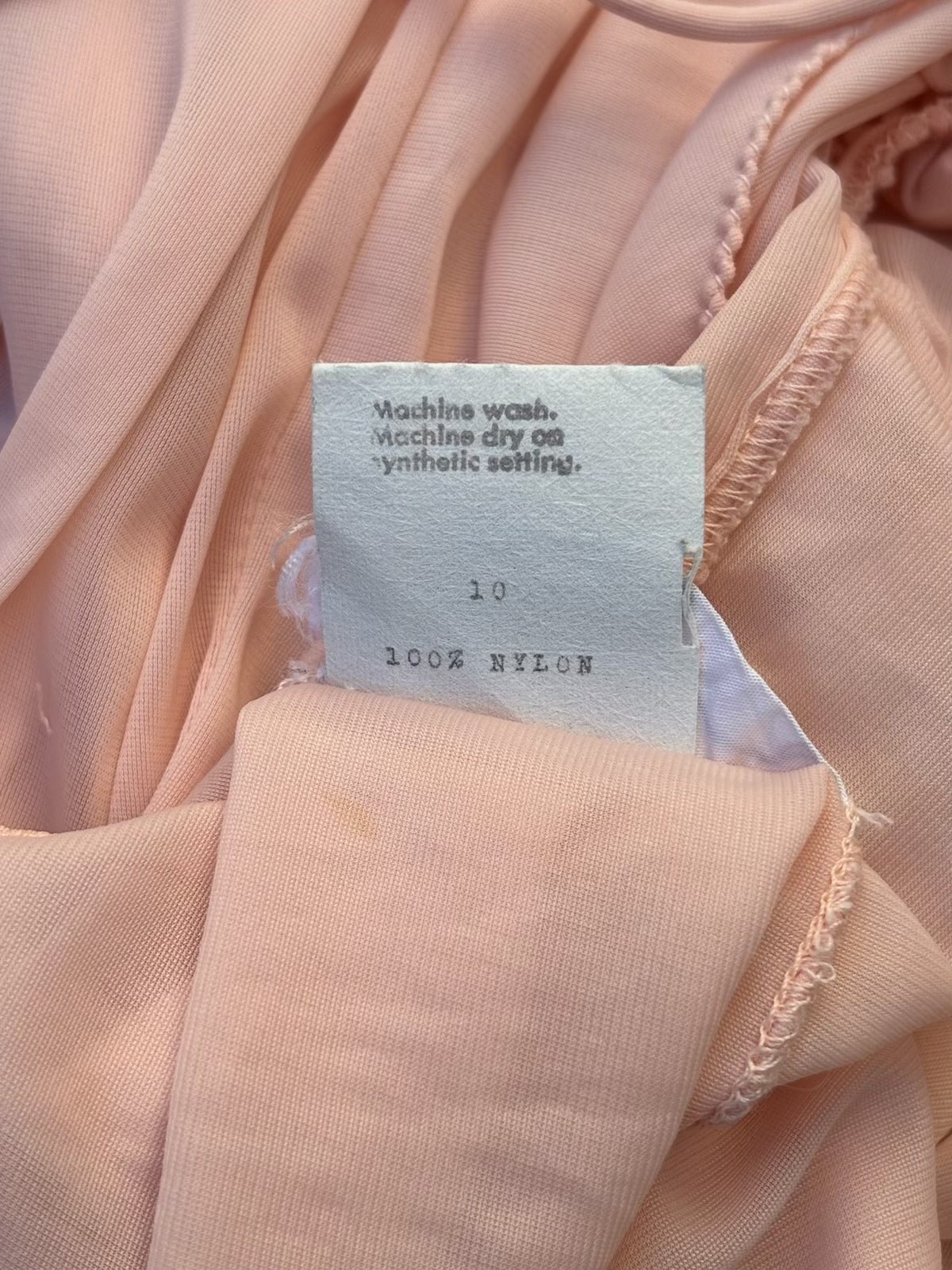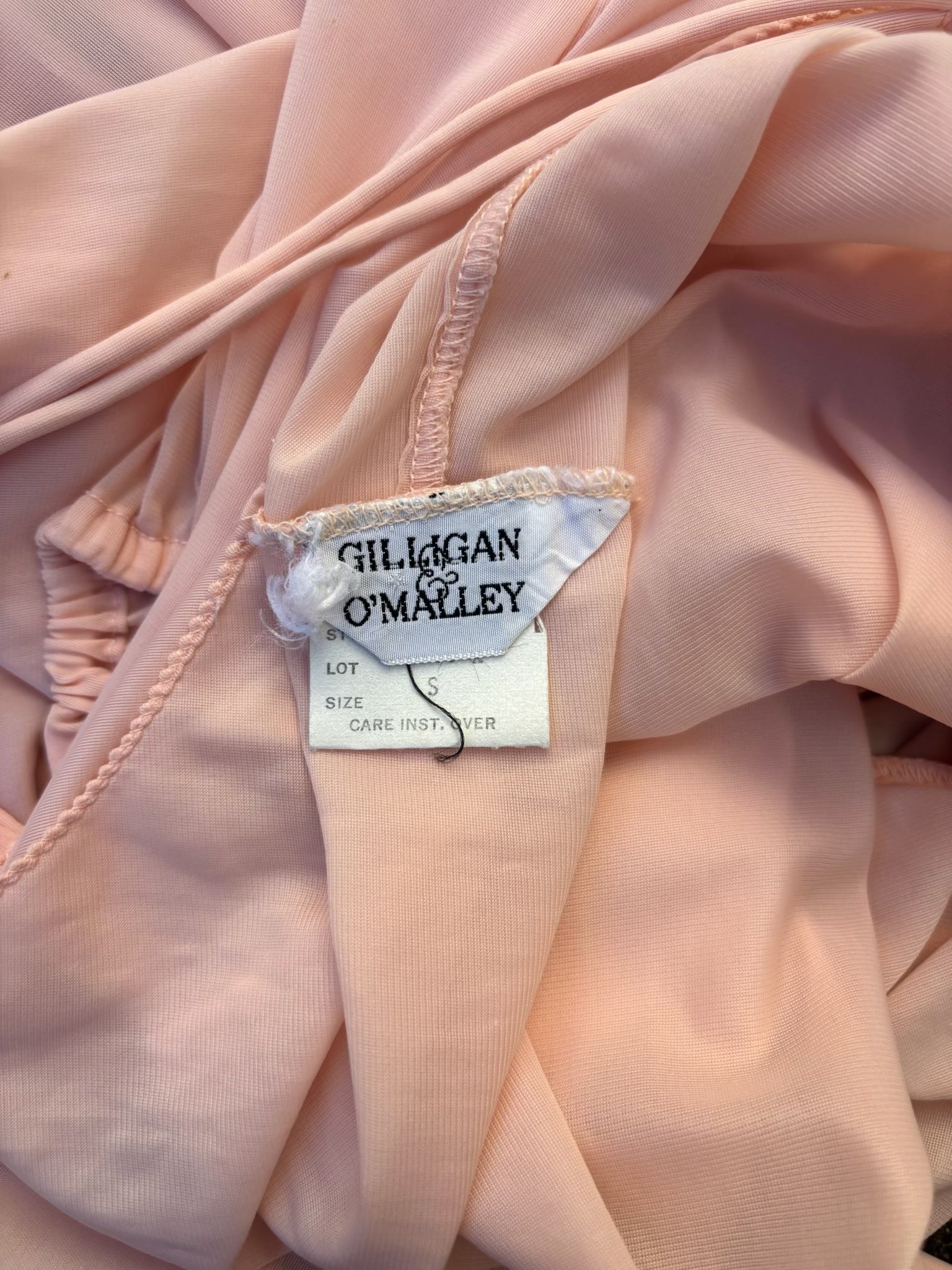 Light pink vintage nylon nightgown with embroidered lace neckline by Gilligan & O'Malley. Features front ties and ruched empire waistline.