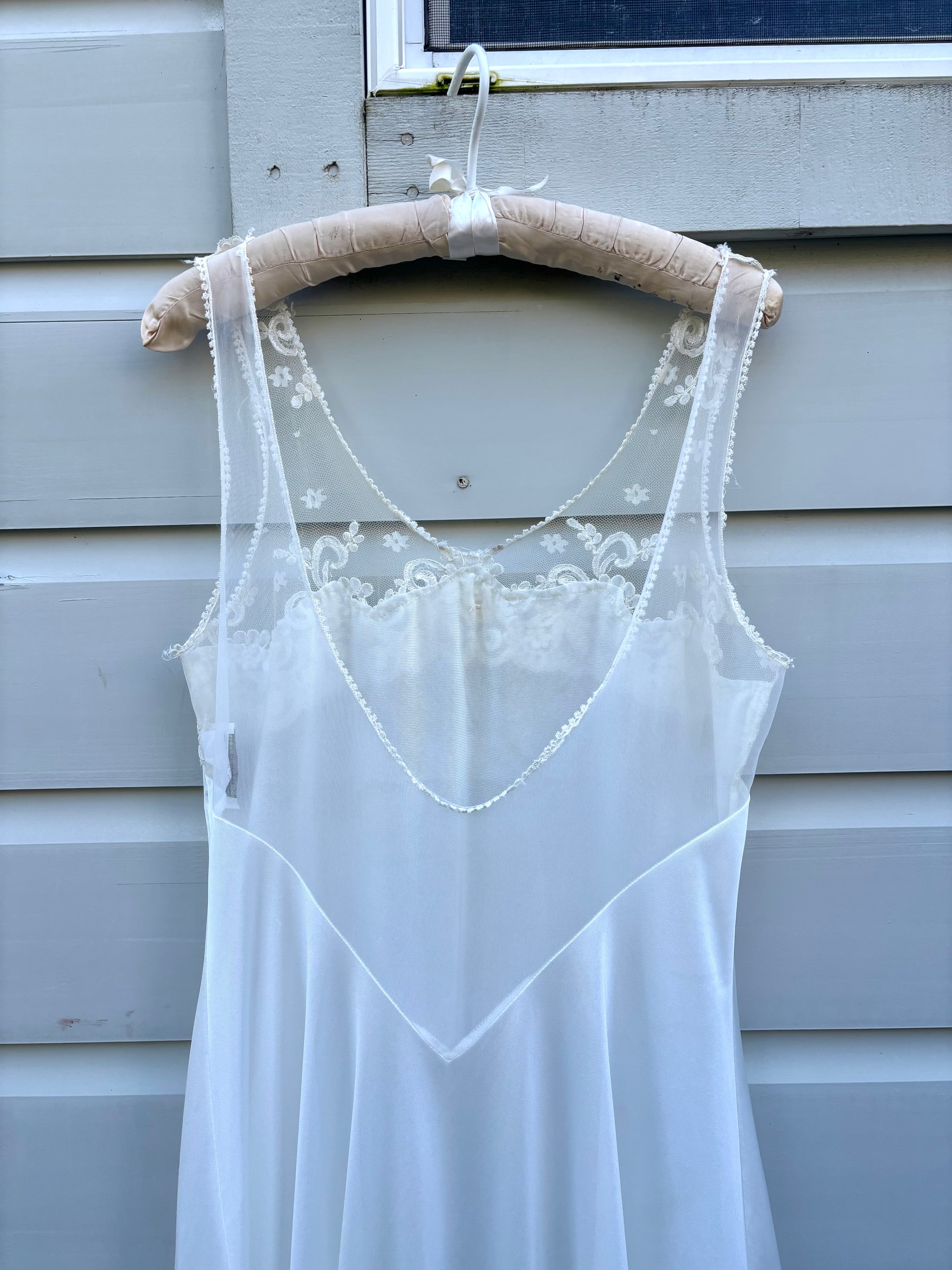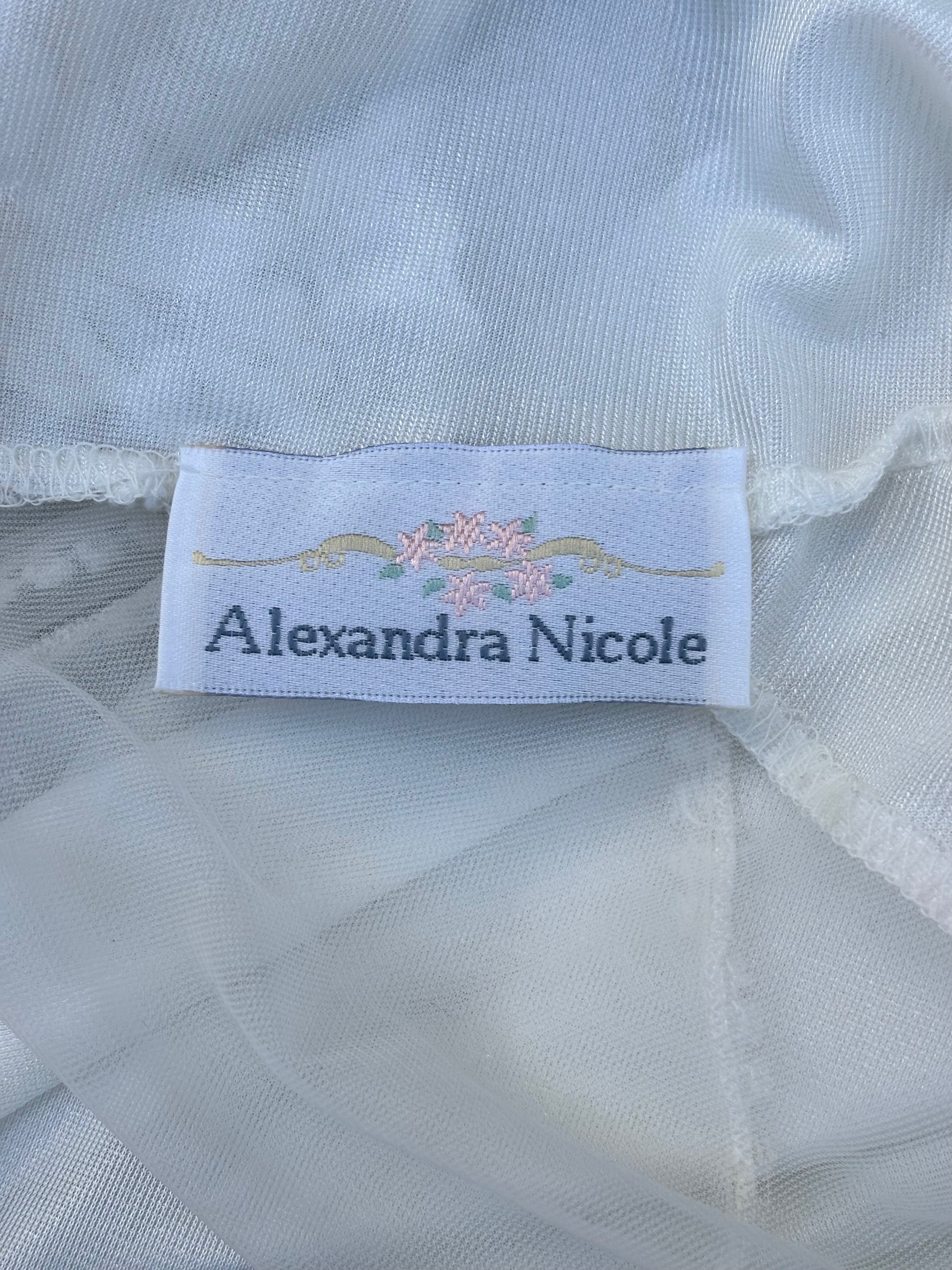 Vintage white mini slip dress with embroidered lace and rose appliqué by Alexandra Nicole. Features low v-shaped back. Made in the U.S.A.